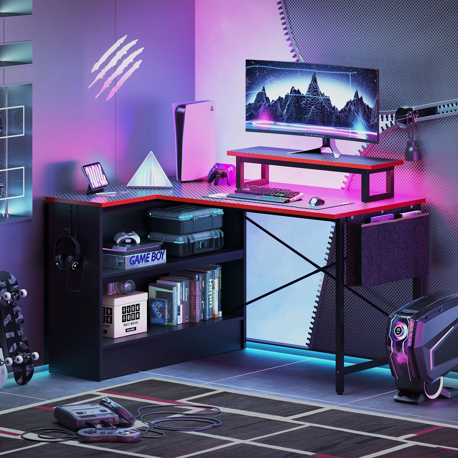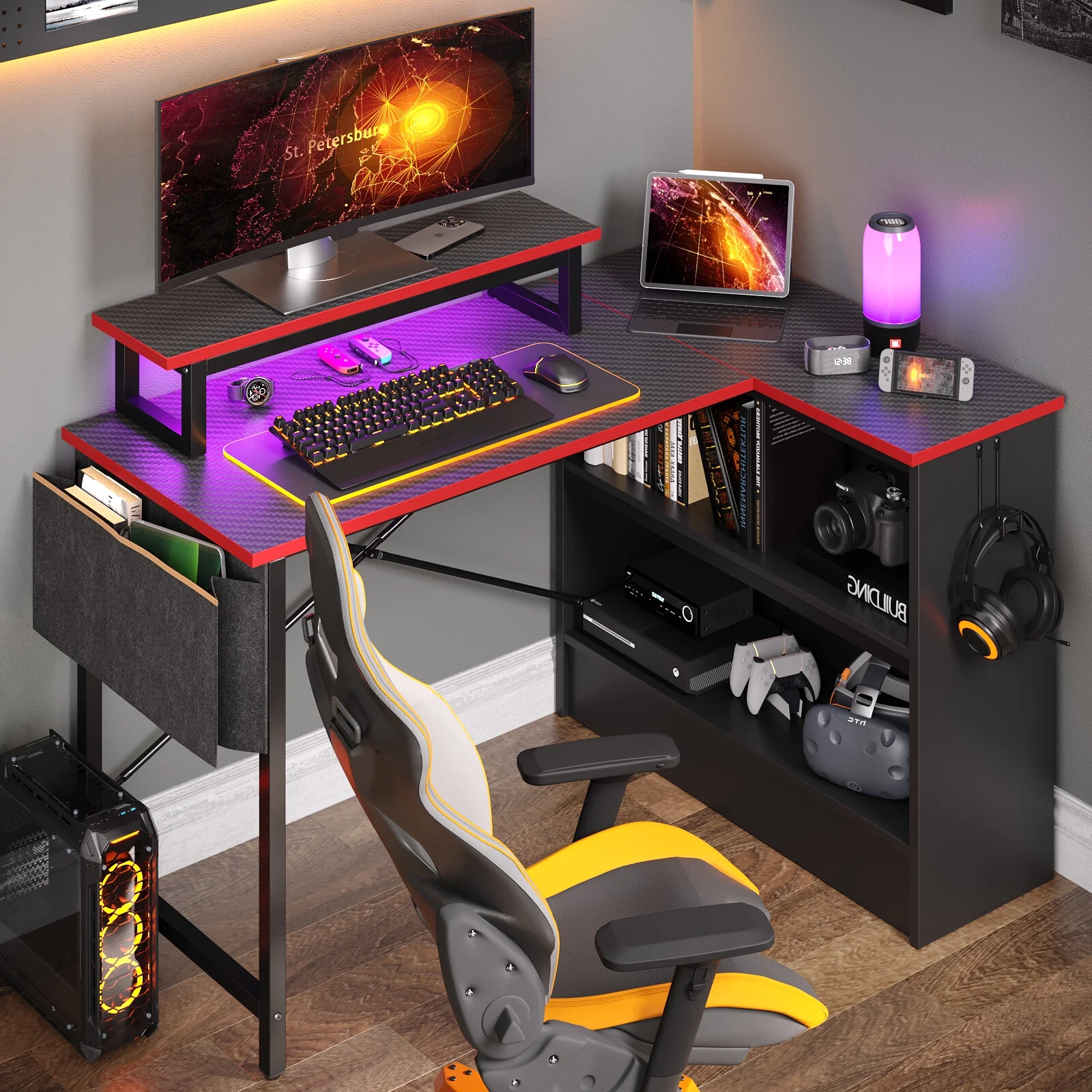 Functional & Space-Saving: This L-shaped desk is designed to fit perfectly into any corner, maximizing your workspace. With dimensions of 35″ high x 42″ wide x 31.5″ deep, this computer desk for home office offers a generous work surface to accommodate all your office essentials. Enhanced Ambiance: The corner desk is equipped with an RGB strip that offers 7 color options and 22 dynamic modes, allowing you to create the ideal atmosphere for both productivity and relaxation. Transform your workspace with customizable lighting to suit your mood and enhance your overall experience. Customizable Storage: Featuring a reversible open shelving cabinet, this game desk provides ample storage for books, office supplies, and gaming devices. The open cabinet can be installed on either side to suit your personal preference and organizational needs. Ergonomic Design: Experience comfort during extended work or gaming sessions with the movable monitor stand, which elevates your screen to an optimal viewing height, reducing neck and shoulder strain. Stay organized and efficient with the convenient headphone hook for easy access and an additional side storage pocket for extra organization. Durable Construction: Crafted from P2-engineered wood and sturdy metal, this gaming desk with LED lighting guarantees long-lasting durability and stability, making it a dependable choice for your home office. The X crossbar and strong footrest rod enhance stability and support, ensuring a solid and reliable gaming experience. Hassle-Free Assembly: The L-shaped computer desk with clear instructions and a simple assembly process makes setting up your ideal home office or gaming space quick and easy, allowing you to focus on what matters most.