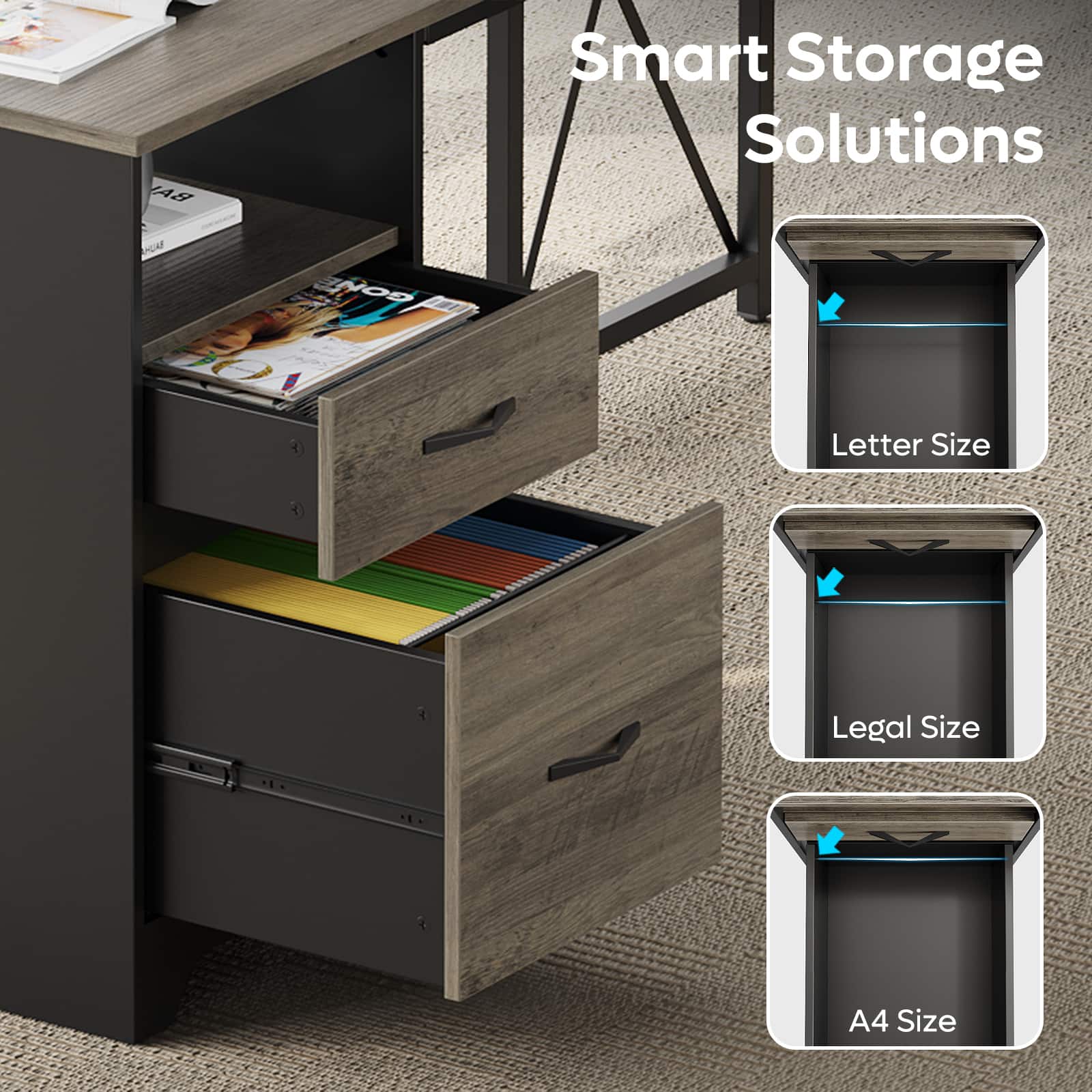 The large desk offers a variety of storage options with 2 open storage compartments, a storage drawer, a file drawer for letter/A4/legal-size hanging file folders, and a dust-free storage cabinet, keeping your workspace organized and your essentials dust-free.