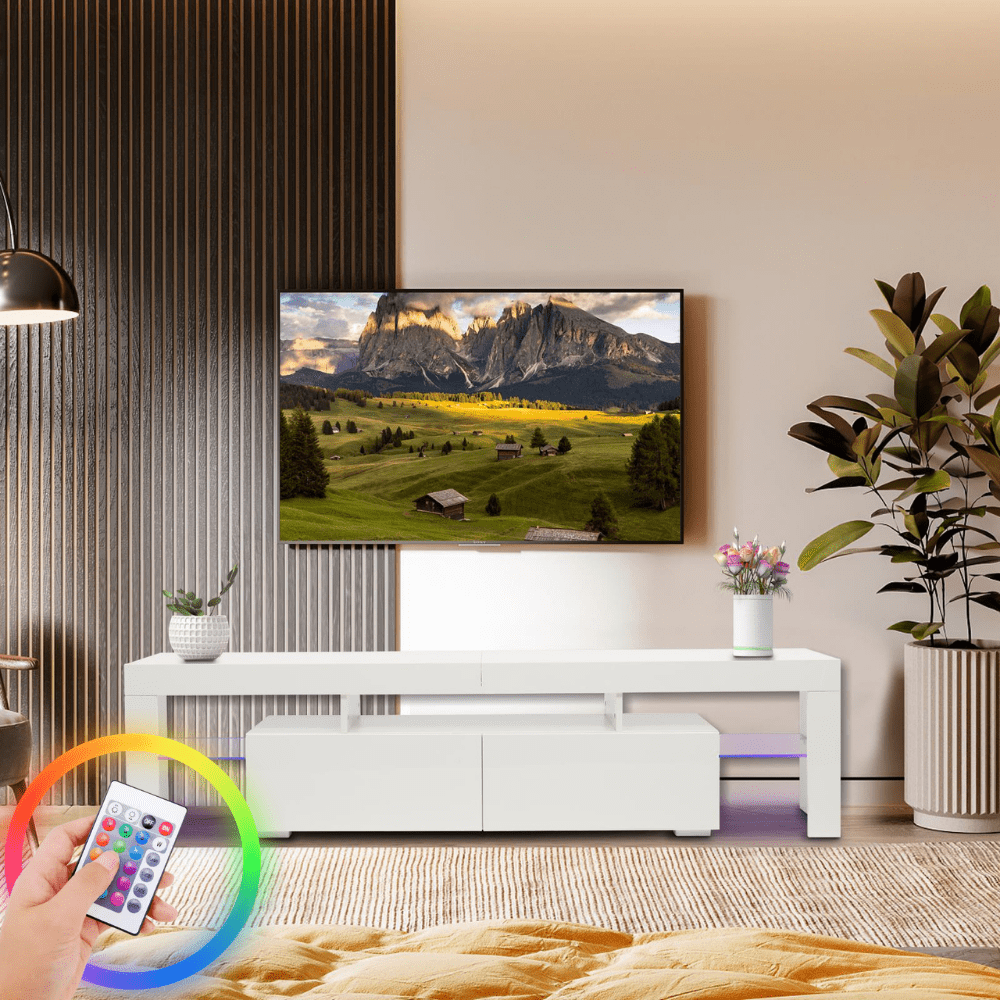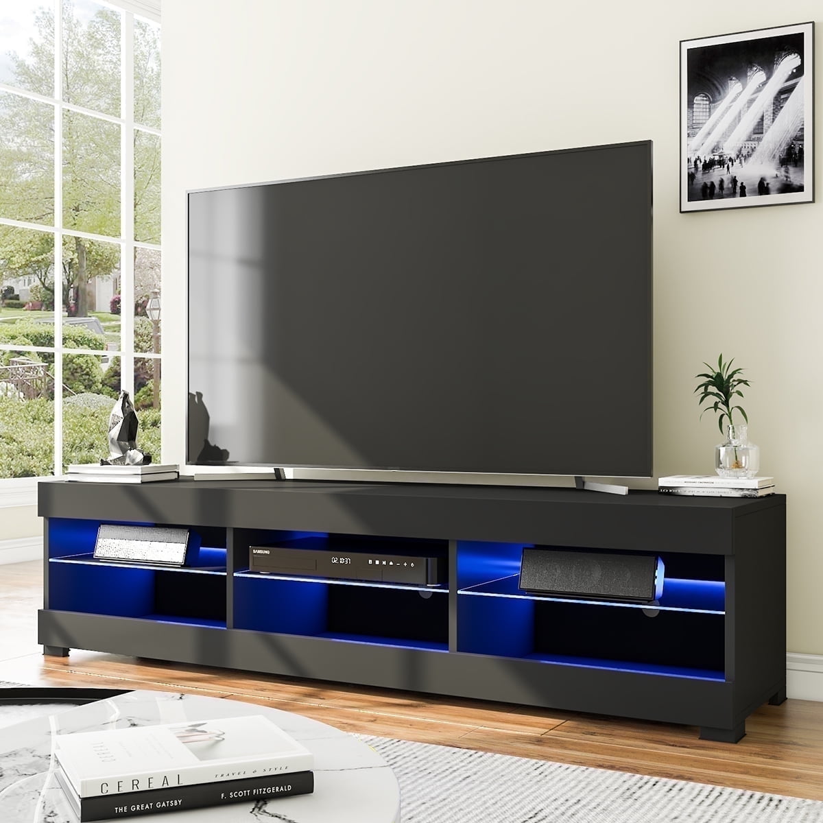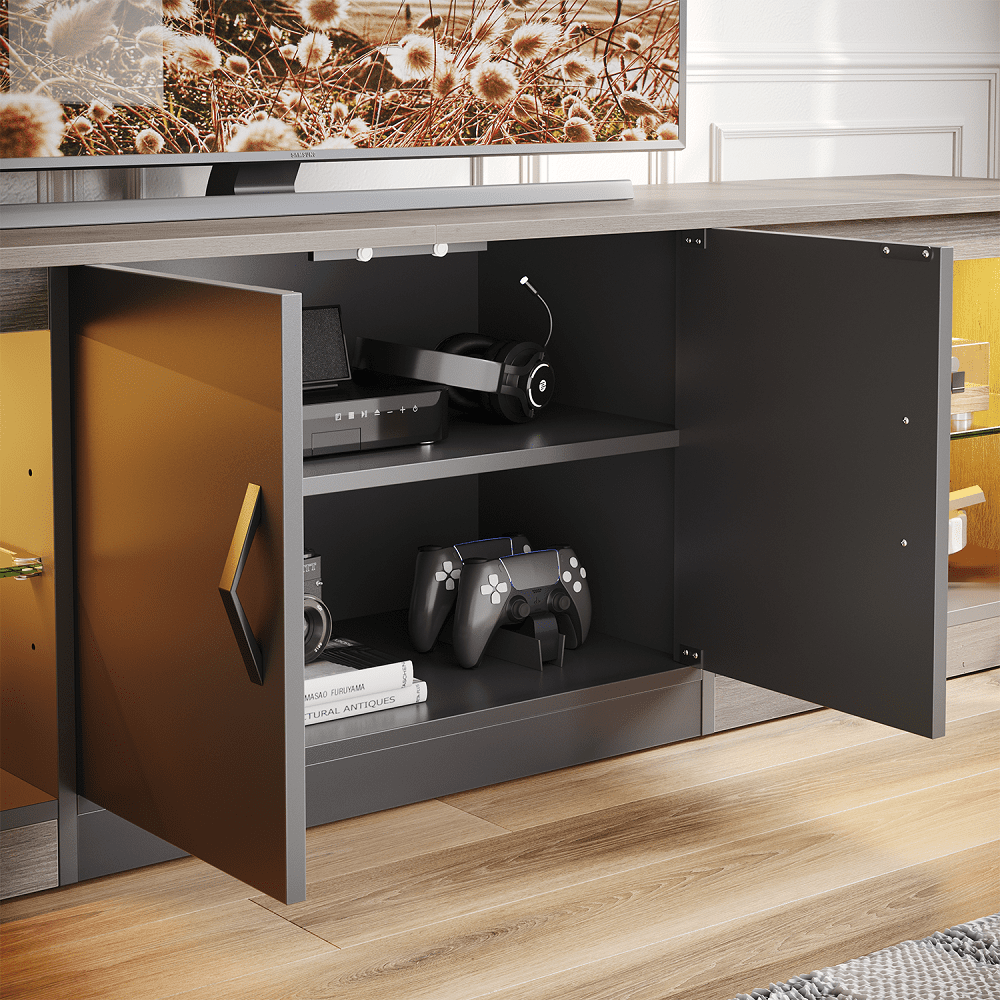 Features: LED Backlight: The tv stand features multi-color LED Lights system, which create the perfect ambiance for movie nights, video game or parties and can illuminate in the dark for you to walk or find items. You can easily turn them on or off and adjust colors and brightness using the included remote control. Tempered glass shelf : This entertainment center provides 4 open shelving areas separated by the 5 mm tempered glass to hold your display items such as headphones, DVDs, gaming devices, or photo frames.And three adjustable heights allow you to position items as needed. Big Cabinet : The led tv stand features 1 closed storage cabinet , which provide plenty of ample storage space for your personal items. Black metal door handles add a modern vibe. Wire Management: The back wire holes inside the cabinets also help you organize wires and cables. Sturdy and Durable: Made of qualified and CARB certified particle board. The TV cabinet has great stability and durability. Specification Dimension: 70.8″(L)×18.3″(H)×13.6″(D) Color: Wash Grey Weight Capacity: 100lbs Protection: Anti-tip kit Material: P2 particle board