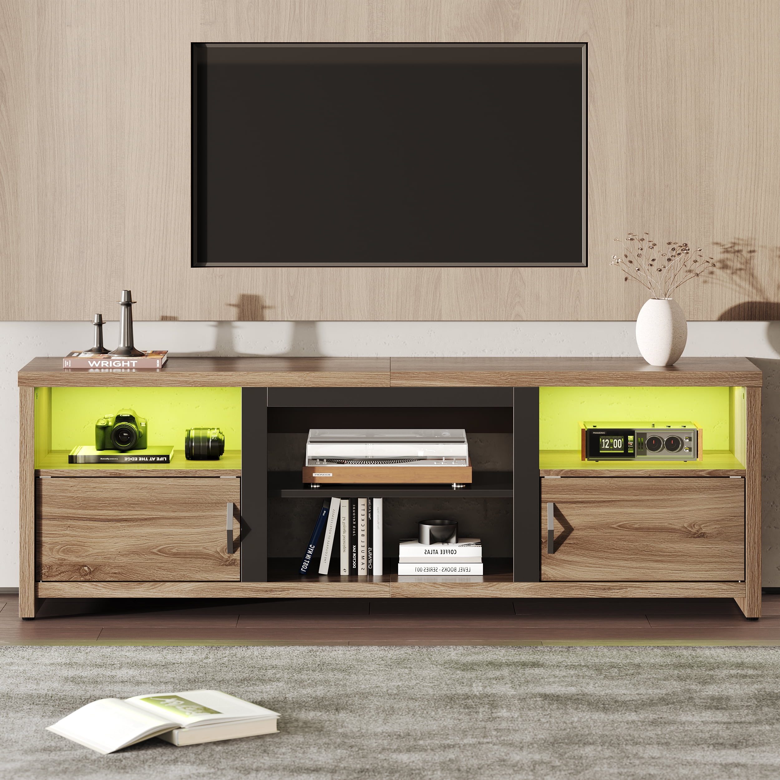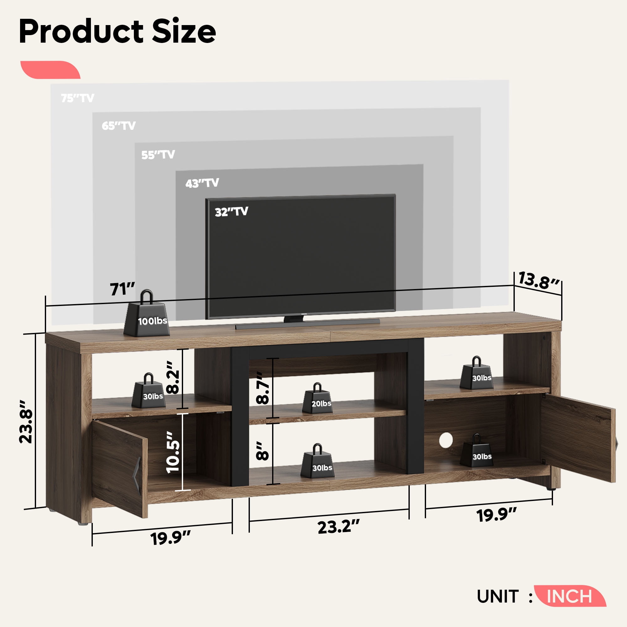 Sleek and Contemporary: Measuring 70.87” x 13.78″ x 23.62″, Bestier modern TV stand is designed to comfortably house large TVs up to 80 inches. Its modern design and sleek lines make it a stylish addition to your living room or entertainment area, creating a chic and inviting space for movie nights, game days, or binge-watching sessions. Ambient Lighting: This entertainment center comes equipped with an RGB light strip that offers a variety of color options. Whether you’re setting the mood for a romantic evening, a lively party, or a relaxing night in, you can customize the lighting to create the perfect ambiance to suit the occasion or your mood. Organized Storage: With open storage space and multiple compartments, Bestier TV stand makes it easy to categorize and store various items. From media components and gaming consoles to books and decor, you can keep your space tidy, organized, and clutter-free. Neat Cable Management: This console table is thoughtfully designed with cable management holes. These features help you neatly arrange and conceal unsightly cables and wires, maintaining a clean and streamlined look in your entertainment area. Effortless Assembly: Our TV stand is designed for easy installation. With clear instructions provided, you can assemble your new piece of furniture quickly and effortlessly, saving you time and energy, and allowing you to enjoy your upgraded entertainment space in no time. Specifications: Material: P2 Particle Board + Metal Frame Overall Dimension: 70.87″ W x 13.78″ D x 23.62″ H Top Load Bearing: 100 lbs Bottom Shelf Load Bearing: 20 lbs