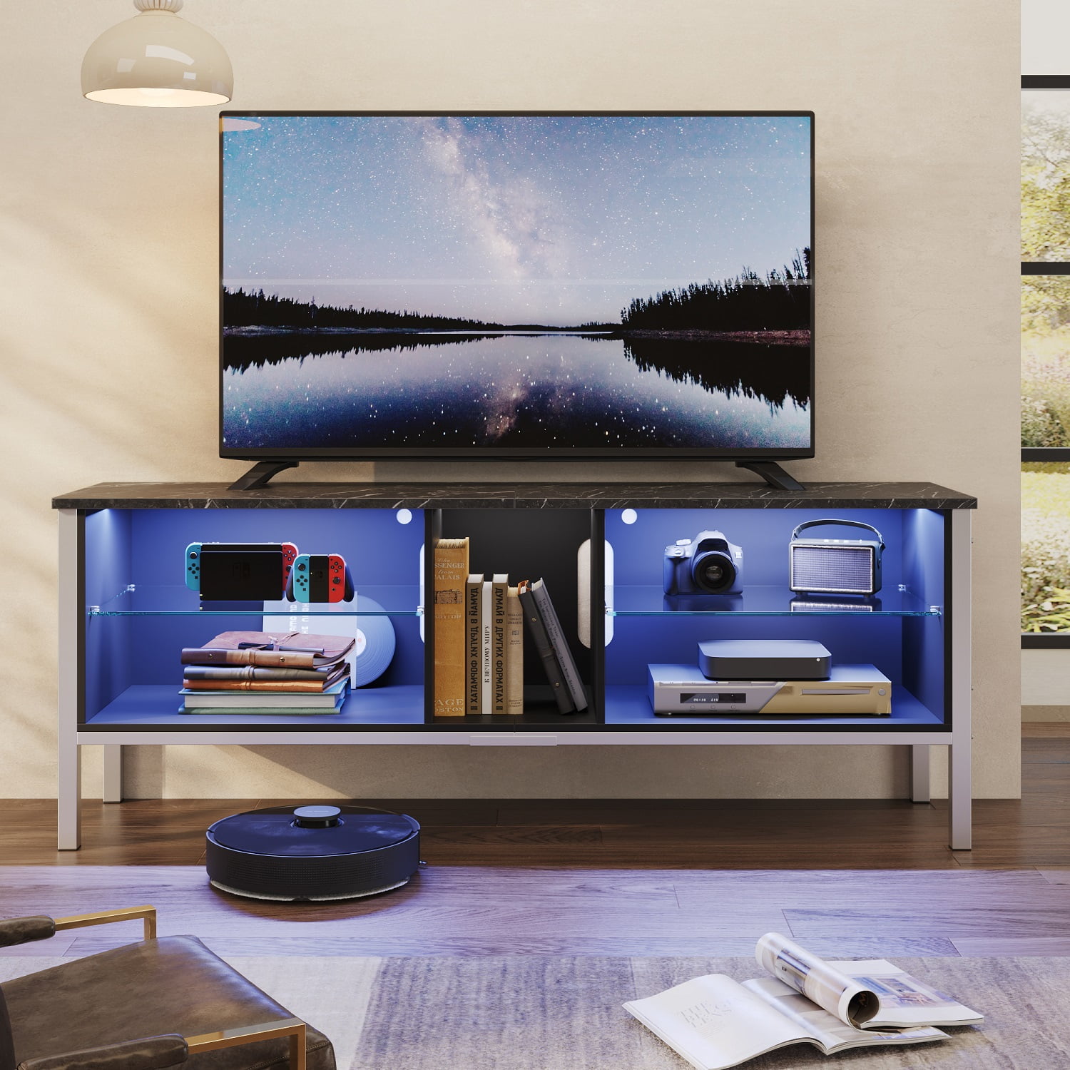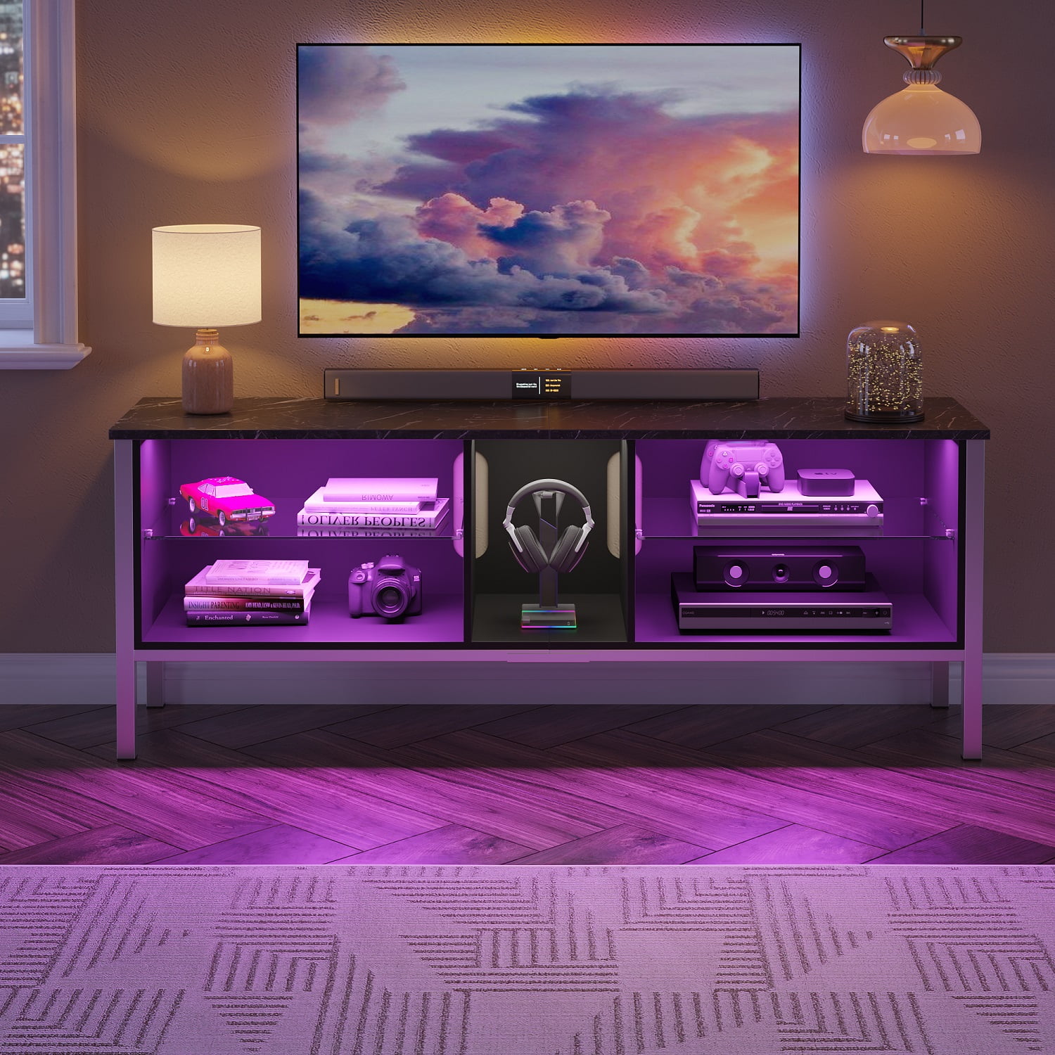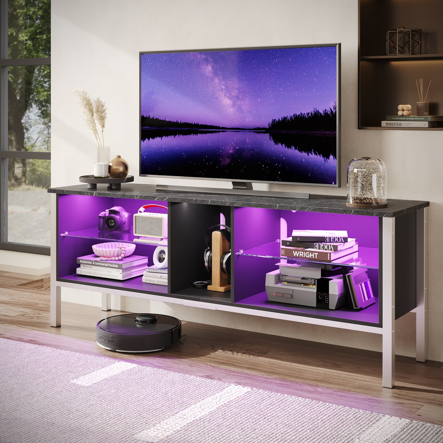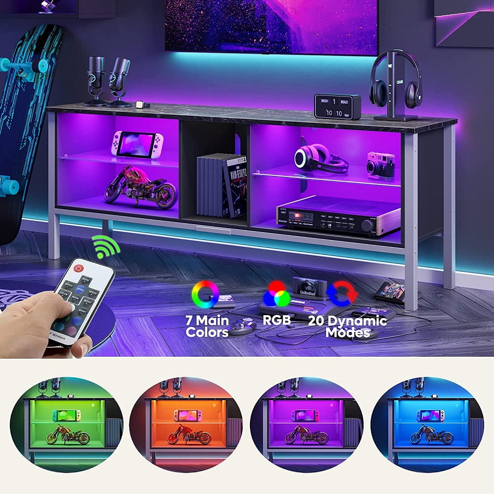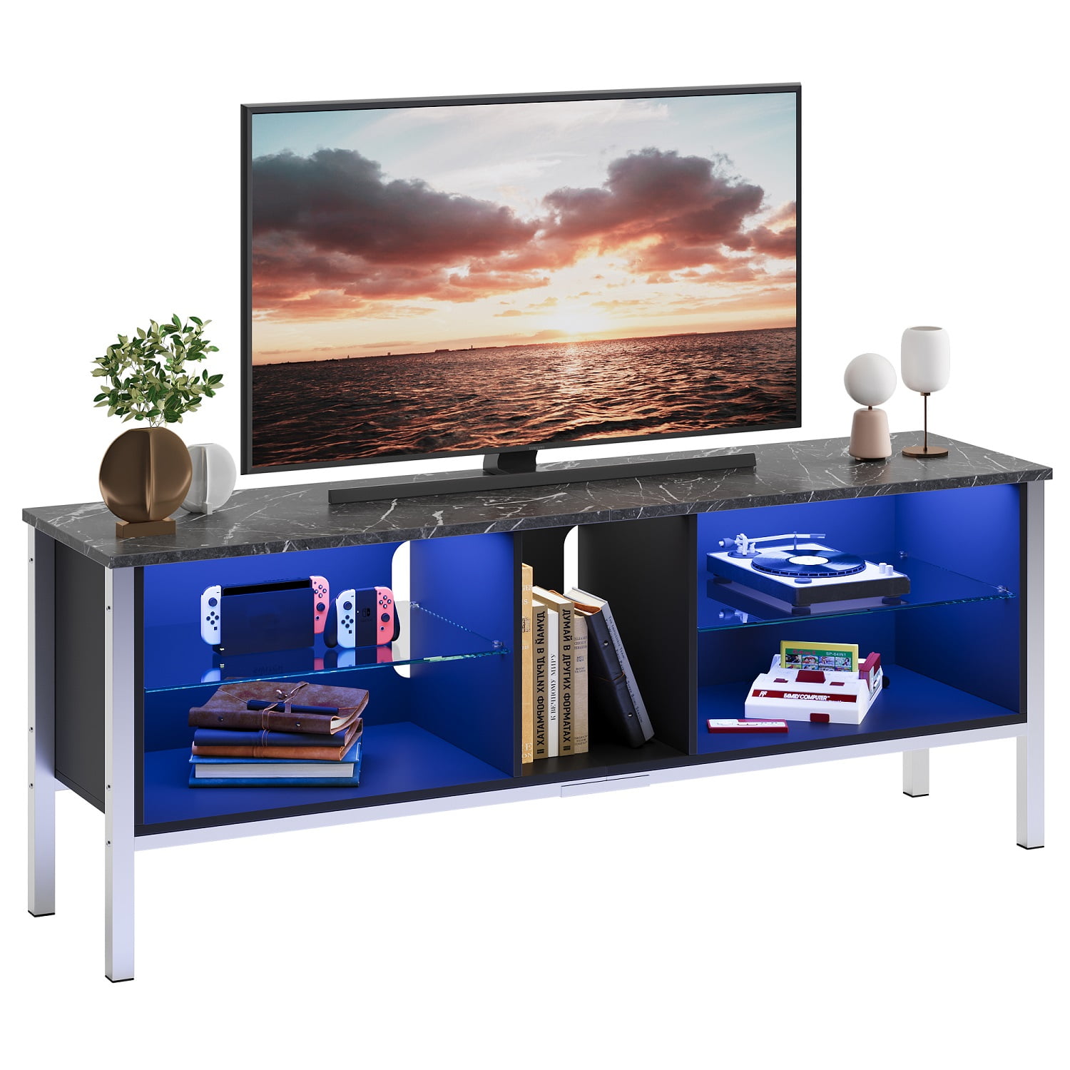 Adjustable LED Light: The led tv stand comes LED light strip, which has 7 main colors and 22 display modes and can create amazing lighting effect and warm atmosphere to your room. You can remotely adjust your preferred colors and modes within a 49ft. Tempered Glass Shelves: The gaming TV stand features two 5mm tempered glass shelves with three adjustable heights to suit your flexible storage needs. The LED light shines through the glass, forming a unique backlight that enhances the appeal of the entertainment center. Spacious Open Storage: This TV stand is ideally suited for TVs up to 70 inches. Its five spacious open shelves provide ample storage for your stereo, DVD player, router, gaming devices, electronics, books, and magazines, helping to maintain a neat and organized living space. The middle shelf is designed to accommodate a PS4 perfectly. Stable Structure: Constructed from high-quality P2 class particle board, this TV stand ensures durability and longevity. Its stability is bolstered by four metal legs and two anti-tip kits. The inclusion of four anti-slip foot mats protects your floor from scratches, while the two back cord holes facilitate wire and cable organization. The sleek, modern design complements any home decor. Easy to Assemble: The entertainment center comes with detailed instructions and all necessary hardware, enabling a single person to complete the assembly in about 40 minutes. Bestier offers friendly customer service before and after your purchase, please feel free to contact us for any questions or concern, we will solve them within 24h with all effort. Dimensions: 63″L×22″H×15.7″D Material: CARB P2 Wood + Steel Frame Color: Black Marble Recommended weight limit: 230 pounds