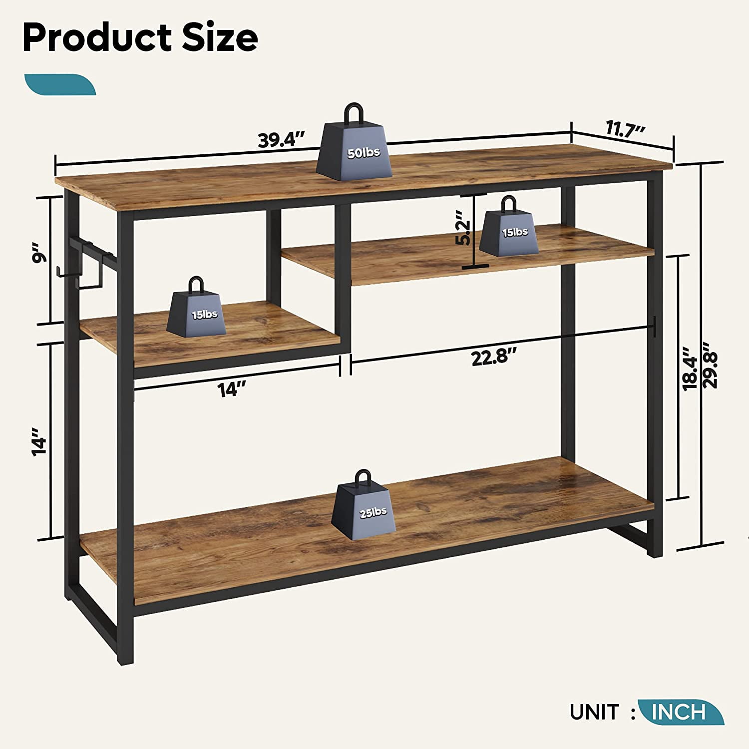 Industrial Sofa table: This narrow hallway table combines a desktop with a vintage wood grain finish and a metal frame coated by black paint and adds unique elements to your room. Applies to the entryway, hallway, living room, foyer, kitchen, study room, or office. The table can hold up to 75 lbs of things. Unique Design: Minimalist and Y-shaped design make it suitable for any style of decoration of your room, and also adds elegant elements to your living room. The foyer sofa table is a perfect combination with your other furniture accessory. Concise Style: The rustic entryway table does not distinguish between front and back, and the front and back are symmetrical. The thoughtful open base creates a perfect space for further storage with the addition of decorative bins or baskets, as finding space to store our everyday items can be a struggle. Multiple Function: You can use it as a console table, side table, couch table, end table, entryway/hallway table, bookshelf, or even TV stand. The simple industrial design makes it fit in any space, and keep your home/office clean and tidy. Easy Assembly and Bestier Customer Service: It only takes about 2 people for half an hour to assemble. And follow the instructions step by step you can enjoy the process with your friends or family. Dimension: 39.5″ W x 11.75″ D x 30″ H Material: CARB P2 Wood + Steel Frame Table Load Tabletop Bearing: 5 lbs Storage shelf Load Bearing: 25 lbs 1 x console table, 1 x assemble manual
