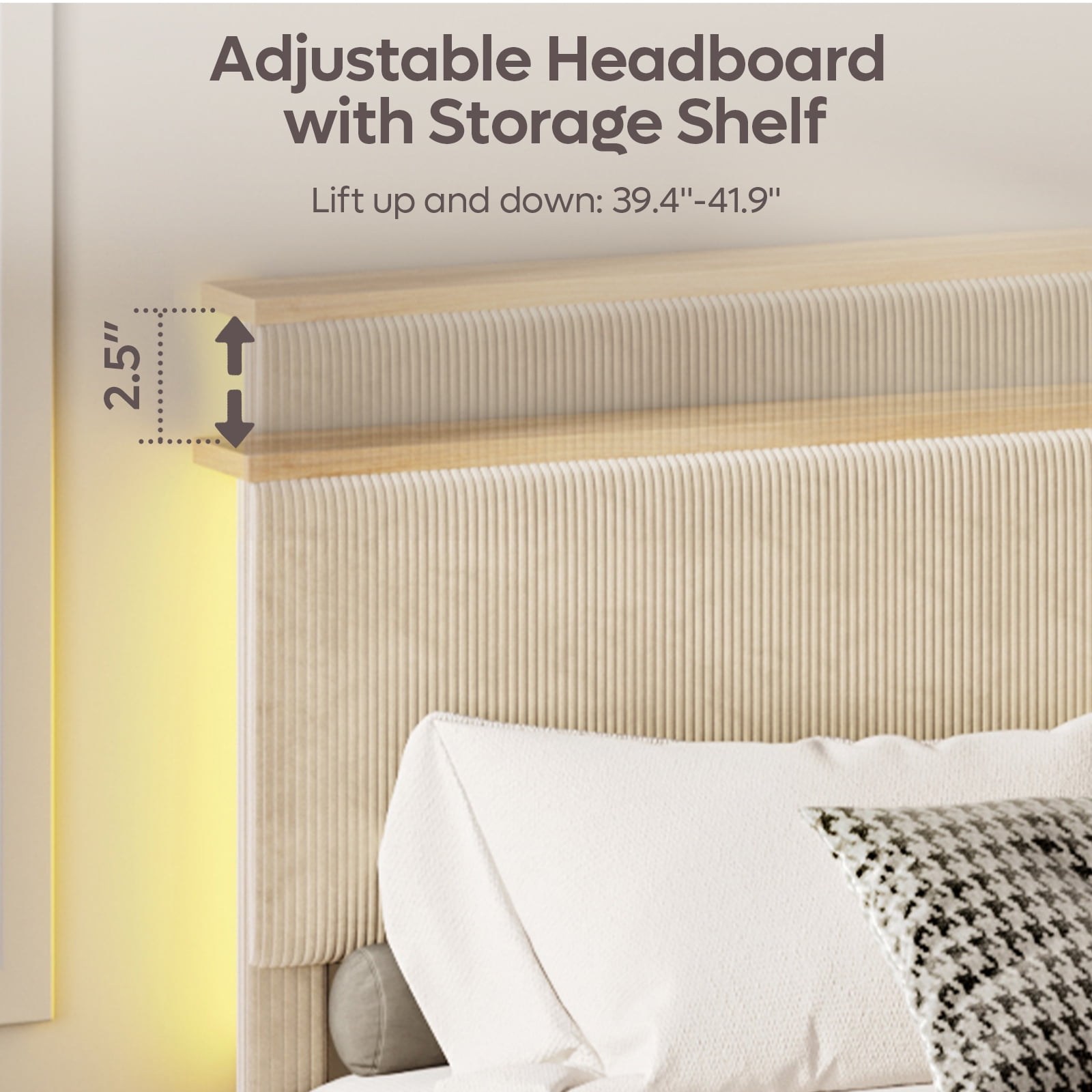 Bestier Platform Bed headboard featuring a modern vertical channel design makes a statement in any bedroom space. And luxurious corduroy not only adds softness but also completes your contemporary aesthetic. This upholstered bed frame with an adjustable headboard from 39.4’’ to 41.9’’. And 4.5 inch widened headboard design of this upholstered bed maximizes space. Store your phone, clock, glasses, and decor on the top shelving. Stay organized! The unique RGB LED light strips on both sides of the headboard support 7 colors and 22 modes, remote controlled, create your favorite bedroom atmosphere. Upholstered Bed Frame engineered with thicken solid wood frames and sturdy end legs. The six self-tapping screws connecting the bed slats, ensuring ultimate stability and durability and minimize any potential for unwanted sounds.The weight capacity up to 1100 lbs. Each part of the corduroy platform bed is clearly labeled and numbered on each and you just need to match those numbers in order to assemble. Require no bulky box spring or extra foundation. After assembling the upholstered platform bed with headboard, just put your latex, foam or spring mattress on the wooden slats, and everything is all set.