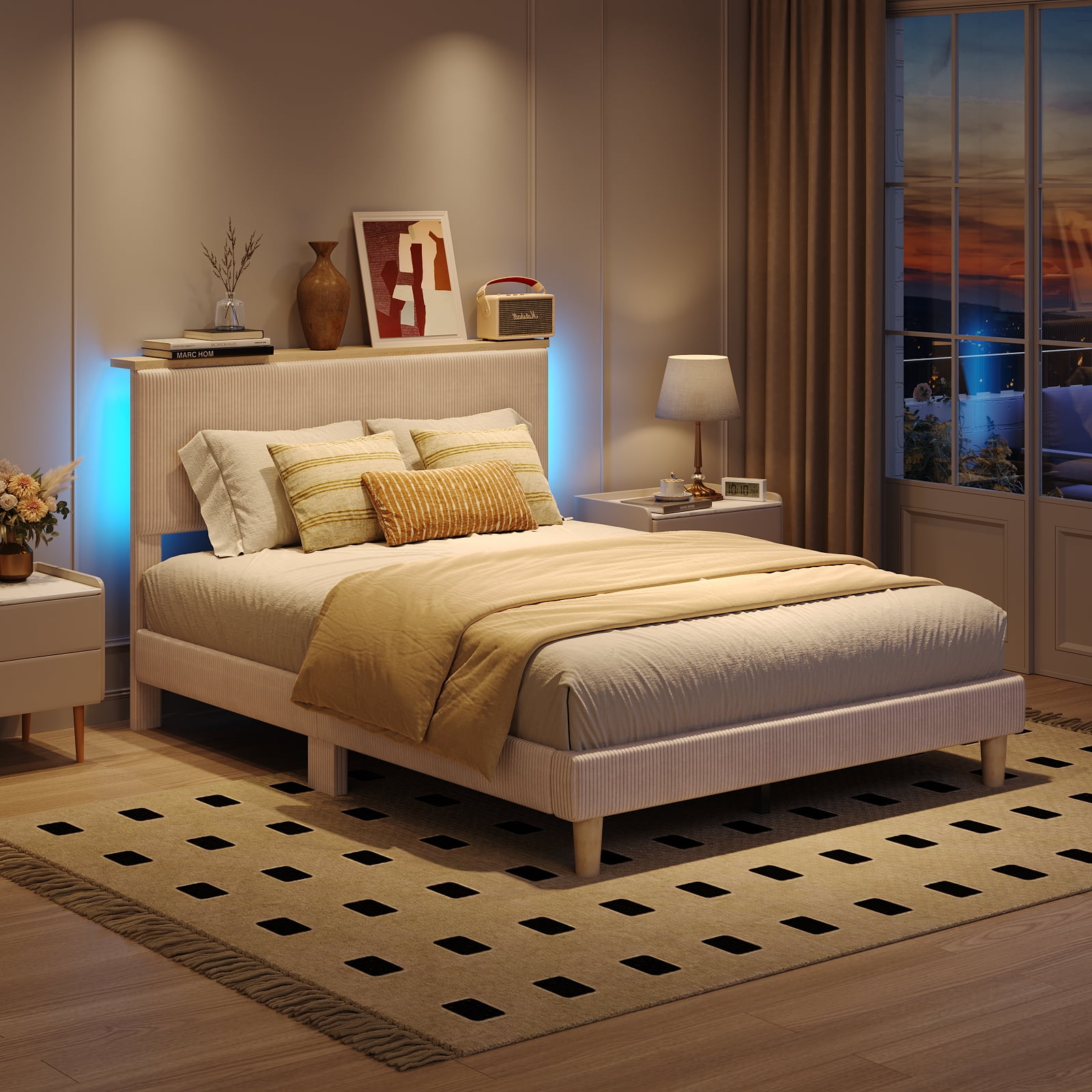Bestier Queen Platform Bed with Adjustable Storage Headboard Shelf, LED Corduroy Upholstered Bed Frame, Cream