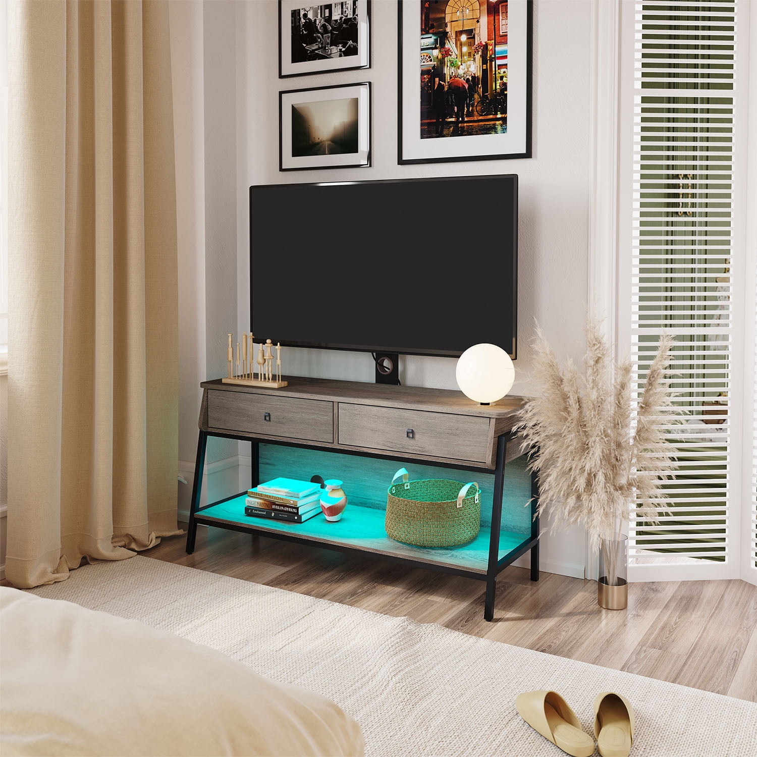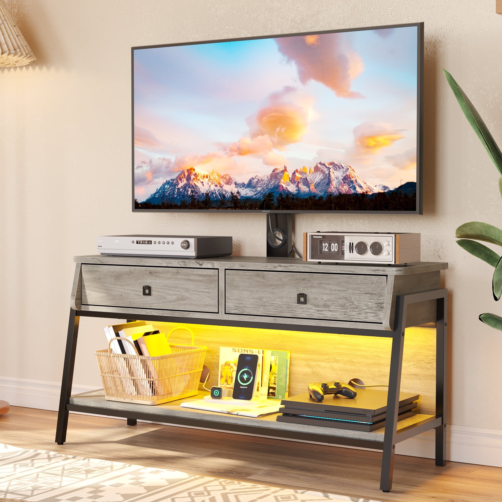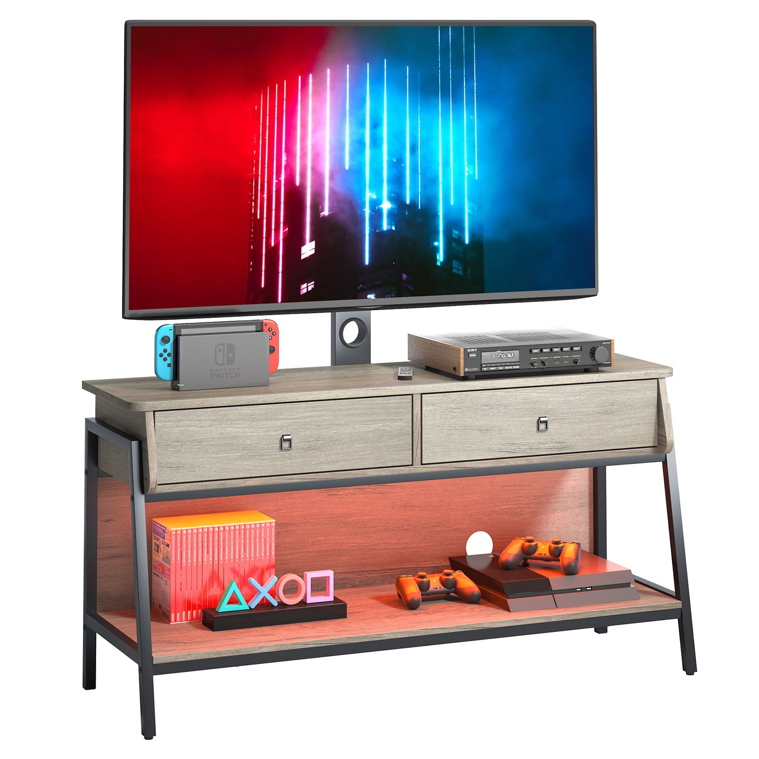 Feature Monitor Stand:With adjustable TV mounting brackets, you can mount TVs from 32 to 65 inches and weighing up to 135 lbs anywhere, and the brackets can be used in combination with cabinets, or can be disassembled and used alone as wall mounts. RGB TV Stand:Built-in LED lighting system with remote control, with 7 main colors and 22 dynamic modes to create the perfect lighting for any activity. Multi Purpose Ues:The cabinet can be used alone or as a storage cabinet. Increase the scope of use and improve utilization.The lower shelf is an open storage space with high-strength load-bearing, which can be used to place large appliances such as audio equipment.With curved corners and included anti-tip kit, it’s safe and secure for any home. Sturdy & Durable: Made of CARB certified P2 particle board, the media cabinet has greater stability and durability.sturdy trapezoidal-shaped with strong metal board frame ensures maximum durability and stability, bearing more than 100 lbs. Easy Assemble: Coming with labeled parts and illustrated instructions, it will help you put the office desk together easily. Specifications: Material: P2 Particle Board + Metal Frame Overall Dimension: 43.31″ (L) x 15.67″ (W) x 54.61″ (H) Tabletop Load Bearing: 135LBS Middle Shelf Load Bearing: 15LBS Bottom Shelf Load Bearing: 20LBS Overall Product Weight:44.42 lb Self-assembly: All fixings and tools supplied.