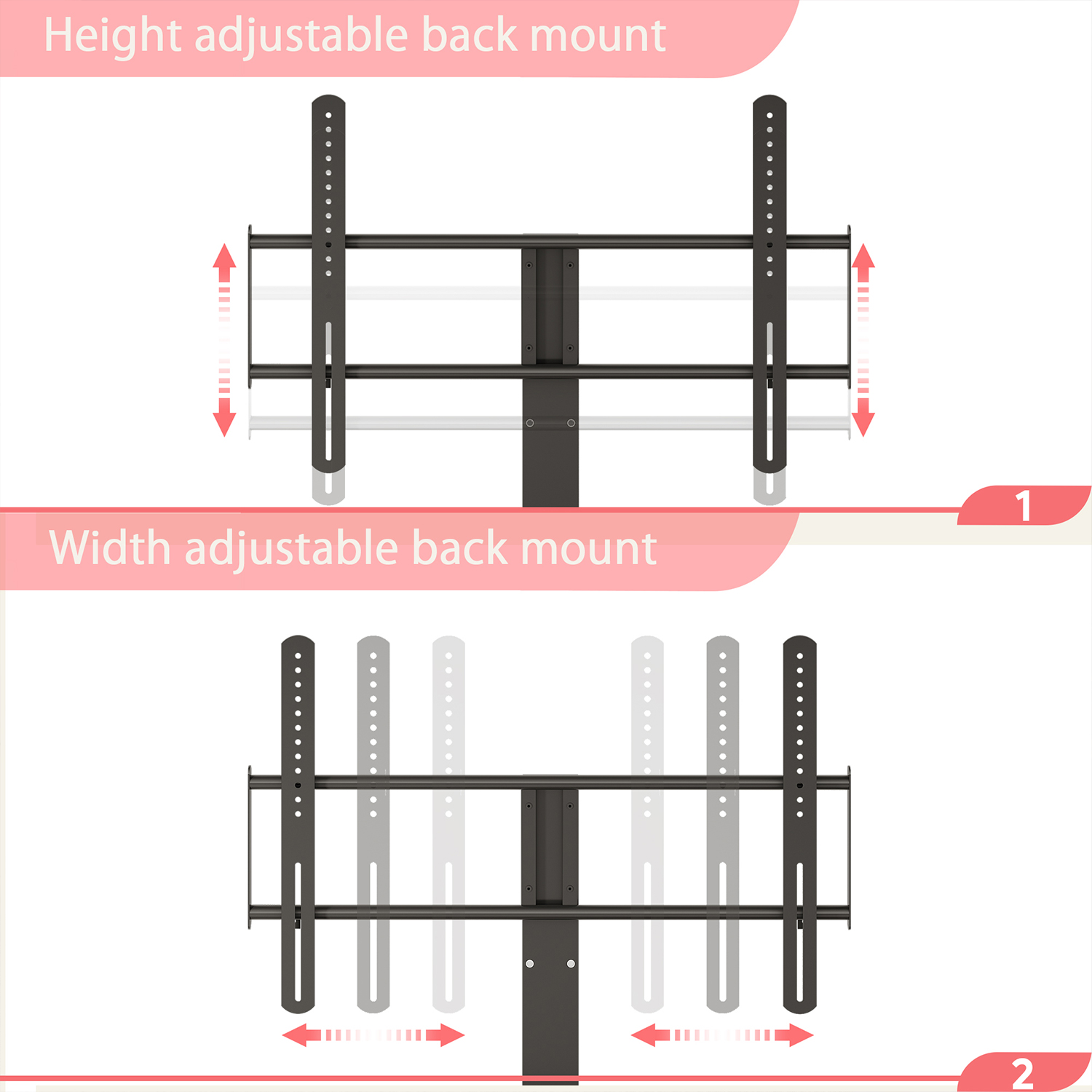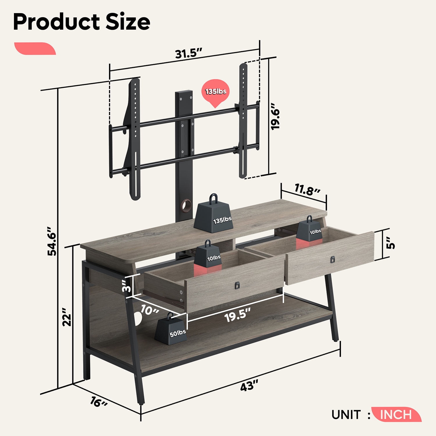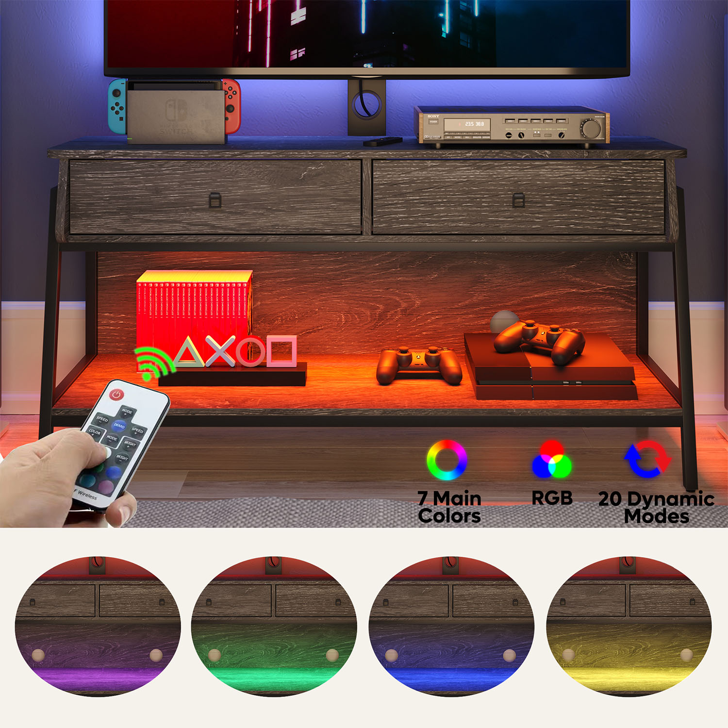 Feature Monitor Stand:With adjustable TV mounting brackets, you can mount TVs from 32 to 65 inches and weighing up to 135 lbs anywhere, and the brackets can be used in combination with cabinets, or can be disassembled and used alone as wall mounts. RGB TV Stand:Built-in LED lighting system with remote control, with 7 main colors and 22 dynamic modes to create the perfect lighting for any activity. Multi Purpose Ues:The cabinet can be used alone or as a storage cabinet. Increase the scope of use and improve utilization.The lower shelf is an open storage space with high-strength load-bearing, which can be used to place large appliances such as audio equipment.With curved corners and included anti-tip kit, it’s safe and secure for any home. Sturdy & Durable: Made of CARB certified P2 particle board, the media cabinet has greater stability and durability.sturdy trapezoidal-shaped with strong metal board frame ensures maximum durability and stability, bearing more than 100 lbs. Easy Assemble: Coming with labeled parts and illustrated instructions, it will help you put the office desk together easily. Specifications: Material: P2 Particle Board + Metal Frame Overall Dimension: 43.31″ (L) x 15.67″ (W) x 54.61″ (H) Tabletop Load Bearing: 135LBS Middle Shelf Load Bearing: 15LBS Bottom Shelf Load Bearing: 20LBS Overall Product Weight:44.42 lb Self-assembly: All fixings and tools supplied.