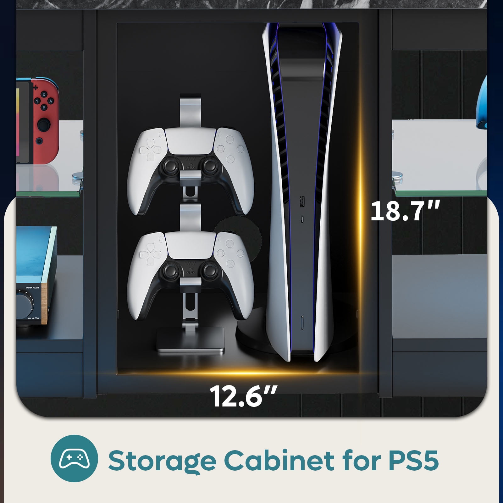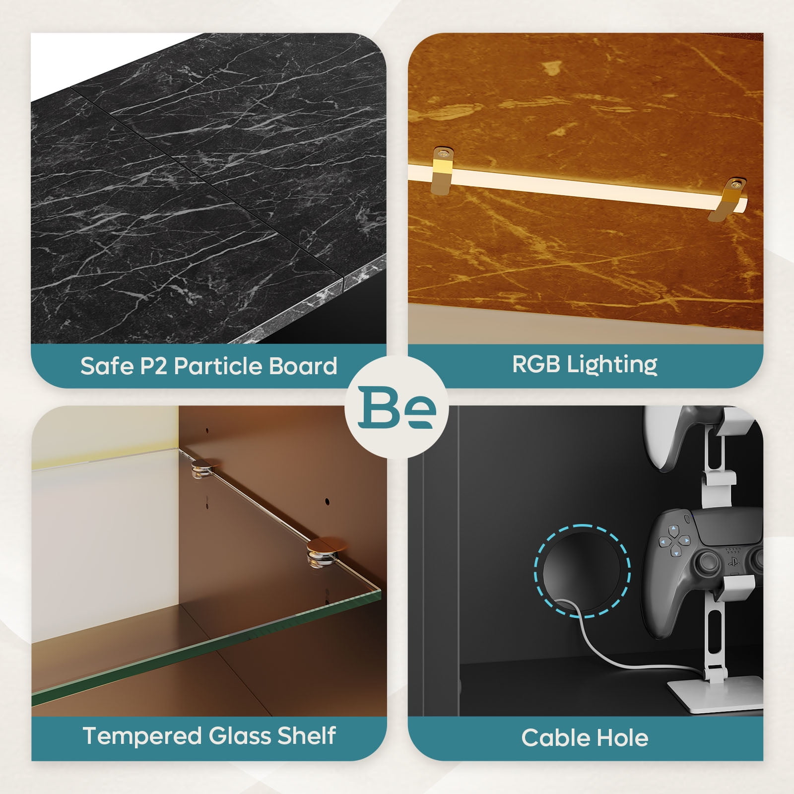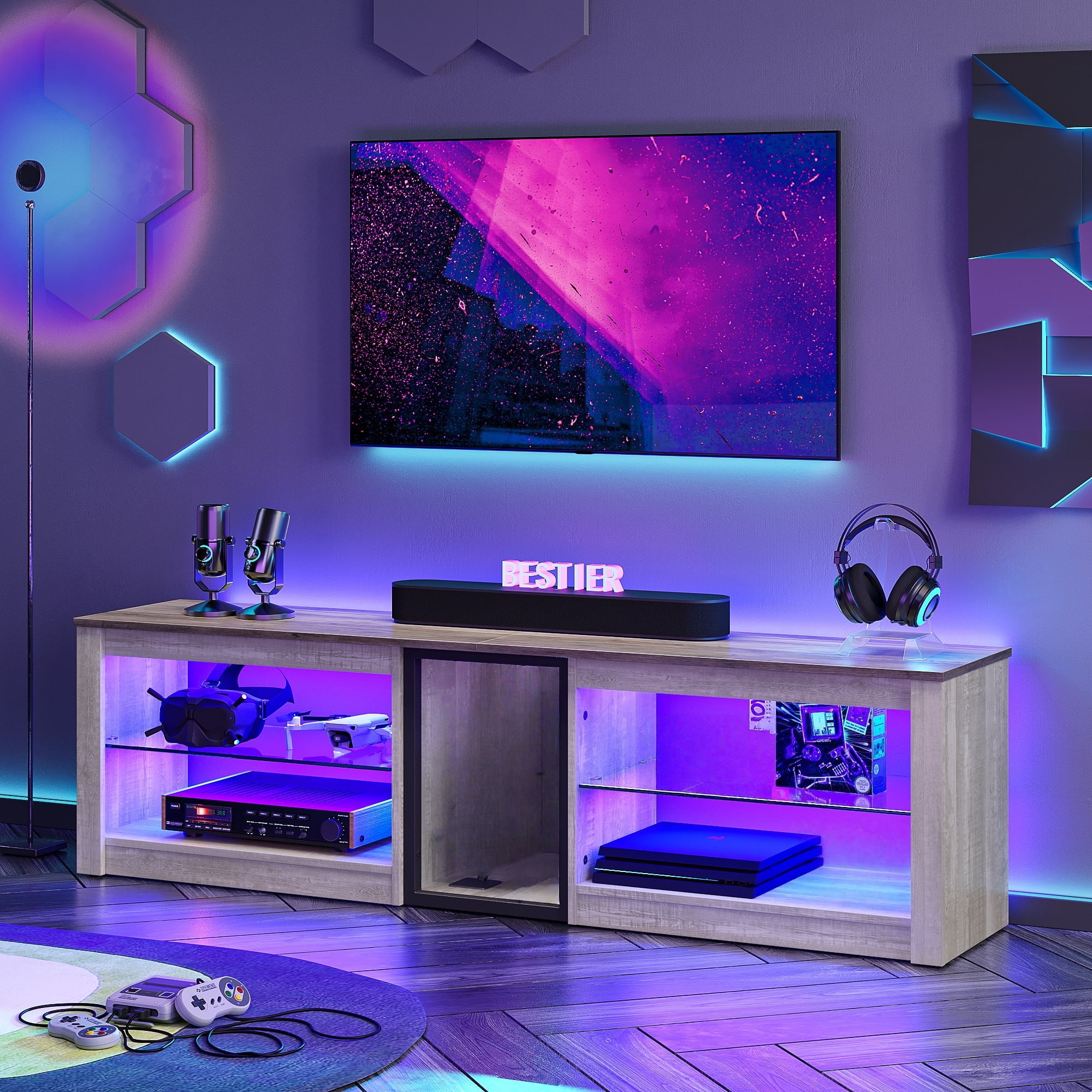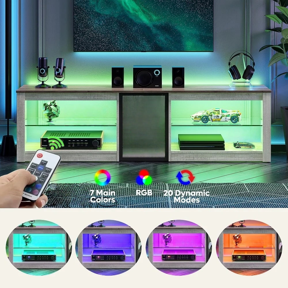 The Bestier 63-inch TV stand comes with an adjustable LED light system, featuring 7 main colors and 22 dynamic modes for personalized ambiance. Its tempered glass shelves offers three adjustable height levels, allowing customization to fit your storage needs. With five open compartments, the led entertainment center provides ample space for your PS5, DVD, router, gaming devices, electronics, books, magazines, and more. Crafted from high-quality CARB P2 Wood, this gaming TV stand is durable and stable. Its black marble finish adds a modern touch to your space. Cable management features to keep wires and cables organized.This TV console is suitable for 70, 65, 60, 55 and 50-inch TV screens.