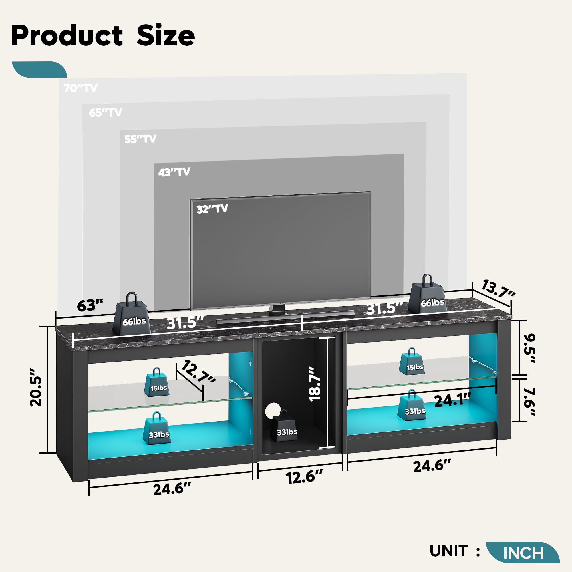 Adjustable LED Lights: This tv stand features attached LED lights in 7 different colors and 22 dynamic settings, creating a lively and entertaining atmosphere for any space. The included remote allows you to conveniently control the lighting to suit your mood and preferences. Modern TV Stand for 70″ TV: Measuring 63″L x 13.8″W x 18.5″H, the entertainment center is suitable for TVs up to 70 inches. It features a black marble finishes, adding an elegant touch to your living room, bedroom, or gaming room. Spacious Open Storage: This LED TV stand features 5 open shelves, offering ample space for DVDs, CDs, gaming devices, remotes, books, and magazines. The middle shelf is ideally designed to house your PS5 and other gaming gear. The tempered glass shelves can be adjusted to three different heights to suit your needs. Durable Construction: Crafted from high-quality P2 Wood, the tv table is designed for long-lasting durability. With a total load capacity of 305 pounds, it can easily support your living room TV and daily necessities. For added safety, it comes equipped with anti-tip kits. Easy Assembly: This tv console comes with detailed instructions for a quick and effortless assembly process. All parts and accessories of the TV stand are numbered for your convenience. If you encounter any issues, feel free to email us anytime; our team will respond within 24 hours.