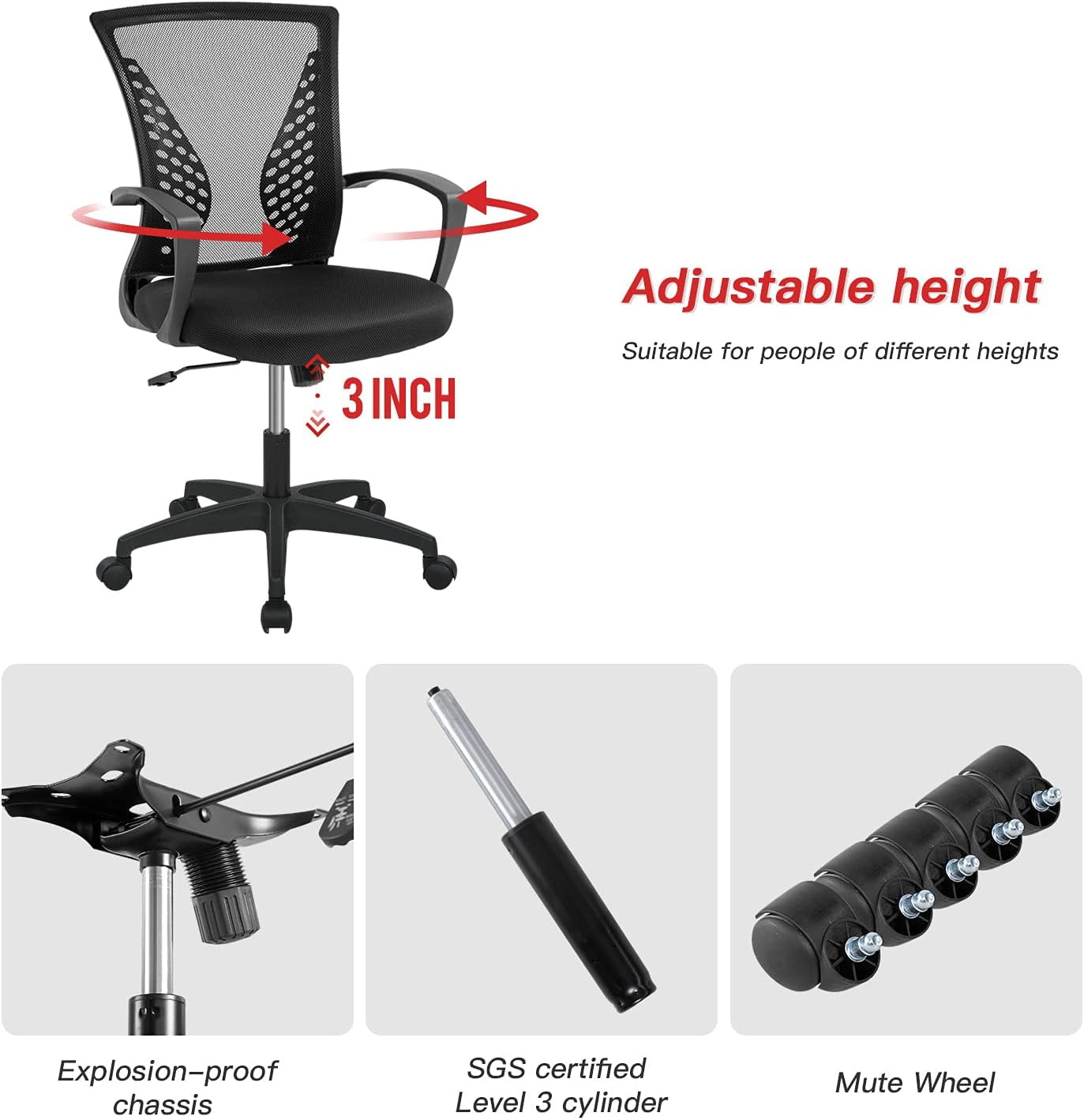 ✿【EASY TO PUT TOGETHER】 – BestOffice office chair comes with all hardware & necessary tools. Follow the desk chair instruction, you’ll found easy to set up, and computer chair estimated assembly time in about 15mins. Age group: adults and teens. ✿【EXTRA COMFORT】 – Desk chair using high-density sponge cushion, more flexible, office chair with a middle back design, rectangular ornament not only as a decoration, it can provide good Lumbar Support makes you feel comfortable. ✿【QUALITY ASSURANCE】 – All the accessories of our office chair have passed the test of BIFMA, which is a guarantee for your personal safety. The mesh chair can bear the weight of 250lbs. ✿【SAVE SPACE】 – It is a good choice to add one of our computer chair in your office or put a desk chair in your home/activity room. ✿【ERGONOMIC DESIGN&NEW PATENT】- The cushion of office chair, armrest accord with human body engineering design, let your body and mesh chair perfect fit, suit long time use, and new metal base give you creative design!