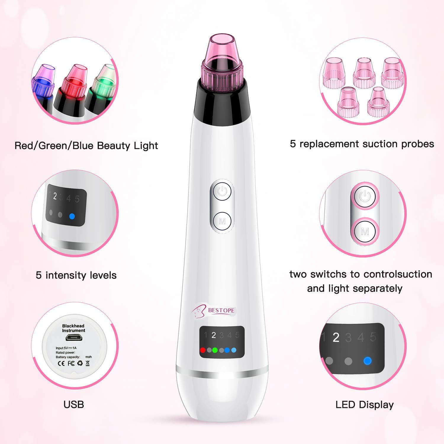 BESTOPE Blackhead Vacuum Pore Cleaner with 5 Levels Strong Suction 4 Changeable Probes 3 Cleaning Mode 5 Acne Remover Tools Electric Comedo Suction Device with LED Display for Facial Cleanser Charge USB LED Display Ergonomic Design Replaceable Tips Beauty Lights Super Suction BESTOPE 0.55 lb