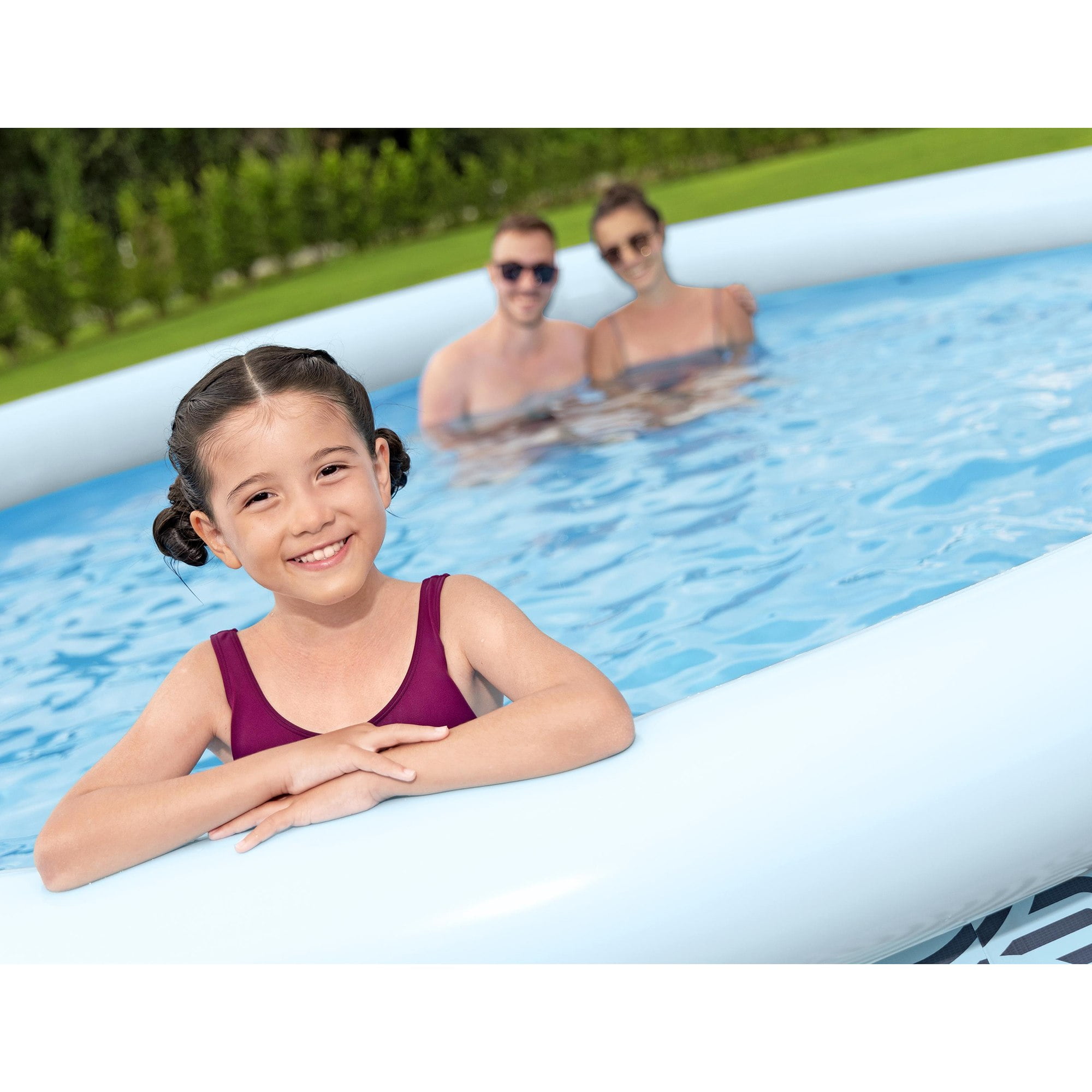 BESTWAY: FAST SET POOL SET – 15′ X 33″ – With this quick and easy Bestway Fast Set Pool Set, you’ll be ready for a pool day in no time! The Fill & Rise set-up process is simple – just select a level surface, inflate the top ring and the pool will rise as it’s filled up with water. The sturdy DuraPlus liner is made out of an ultra-durable 3-layer material that is reinforced for strength and is 85% more puncture-resistant than PVC. The attractive liner also features a realistic rattan print that will bring a classy look and feel to your backyard. When the season’s over, storage is fast and simple. The water releases easily through the flow control drain valve, and then the pool can fold up for compact off-season storage. Also included with the set is a filter pump to help keep the water clean. This pool is the ideal choice for families looking for a quick and easy pool option for their backyard. Kids will enjoy spending their summer days splashing and playing in the water, and parents can enjoy a nice and relaxing dip as well. The season won’t be complete without the convenient Fast Set Pool from Bestway! OVERVIEW: Size: 15 ft. x 33 in. Includes a 530 gal. filter pump. Fill & Rise Pool – Select a level surface, inflate the top ring, and the pool will rise as it’s filled up with water. Quickly release pool water through the adjustable drain valve. Water Capacity (80% full): 2,556 gal. DuraPlus enhanced 3-layer liner is reinforced for puncture-resistance, durability and longevity. Rattan print brings a classy look and feel to your backyard. Contents: 1 pool, 1 filter pump, 1 repair patch. Easy set up. Printed mosaic inner liner on the bottom of the pool. Heavy-duty PVC and polyester 3-ply side walls.