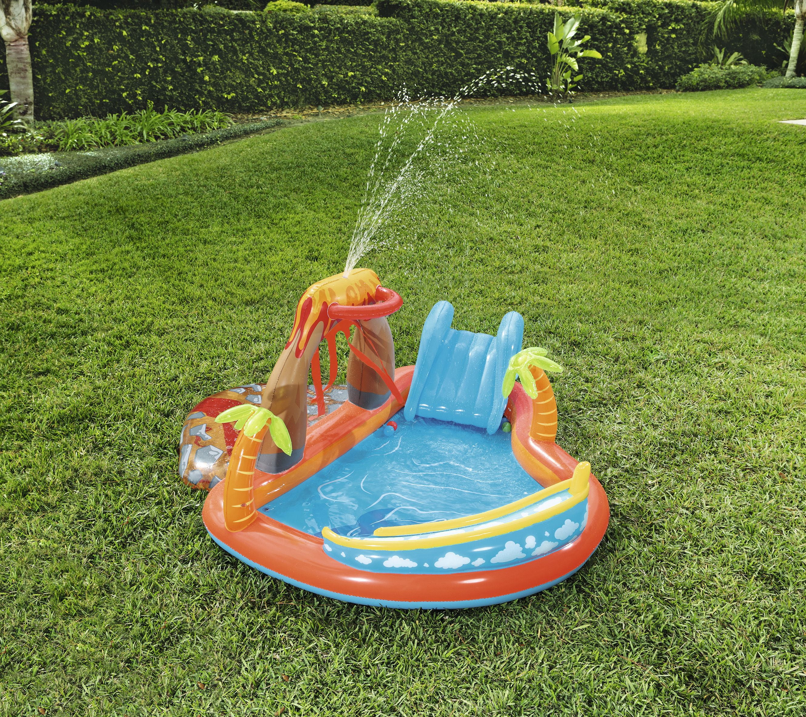 Designed to get kids moving, grooving and out of the house, the H2OGO! Lava Lagoon Play Center is quality-tested and puts the focus back on fun! There is a water sprayer which attaches to a garden hose, keeping your kids cool while they play. The Play Center kiddie pool includes 4 play balls to roll up and down the inflatable ball ramp and 1 inflatable ring to play ring toss. A removable slide with tie ropes and built-in grommets is also included. The inflatable cushion on the pool floor provides extra comfort for little ones. With inflatable palm trees, your little one will feel they are worlds away! The water sprayer attaches to garden hose, keeping your kids cool during the hot summer months! When you are done with the Play Center, release the pool water with the easy-to-use drain valve. With enough room for friends, splashing in the sun has never been more fun than with the Bestway H2OGO! Lava Lagoon Play Center!