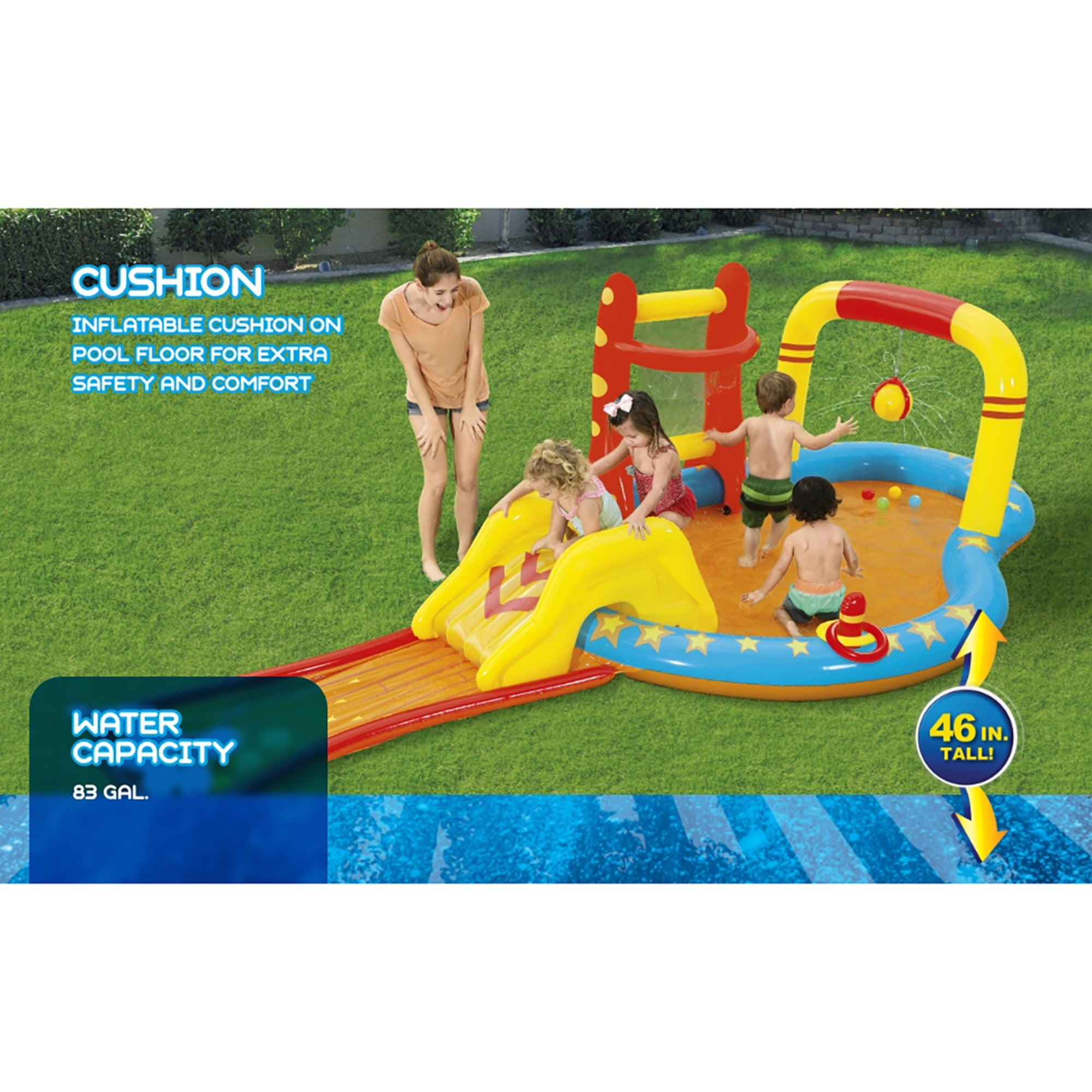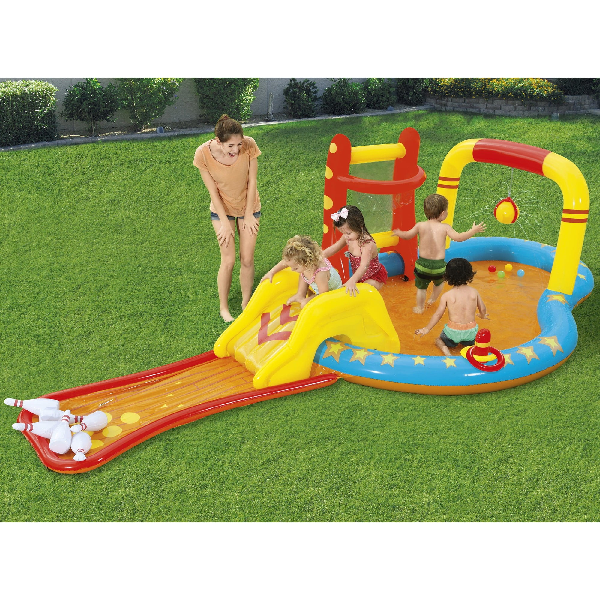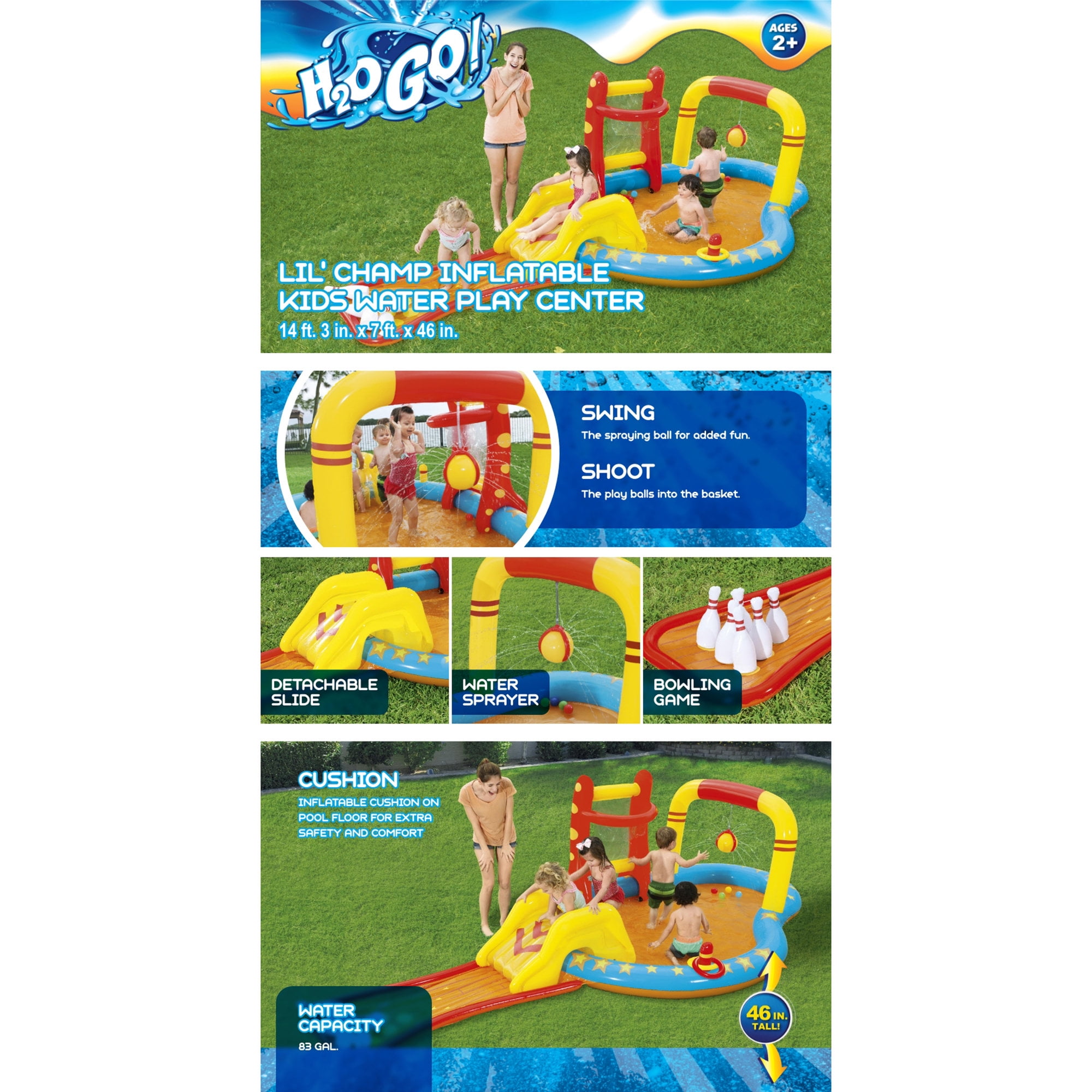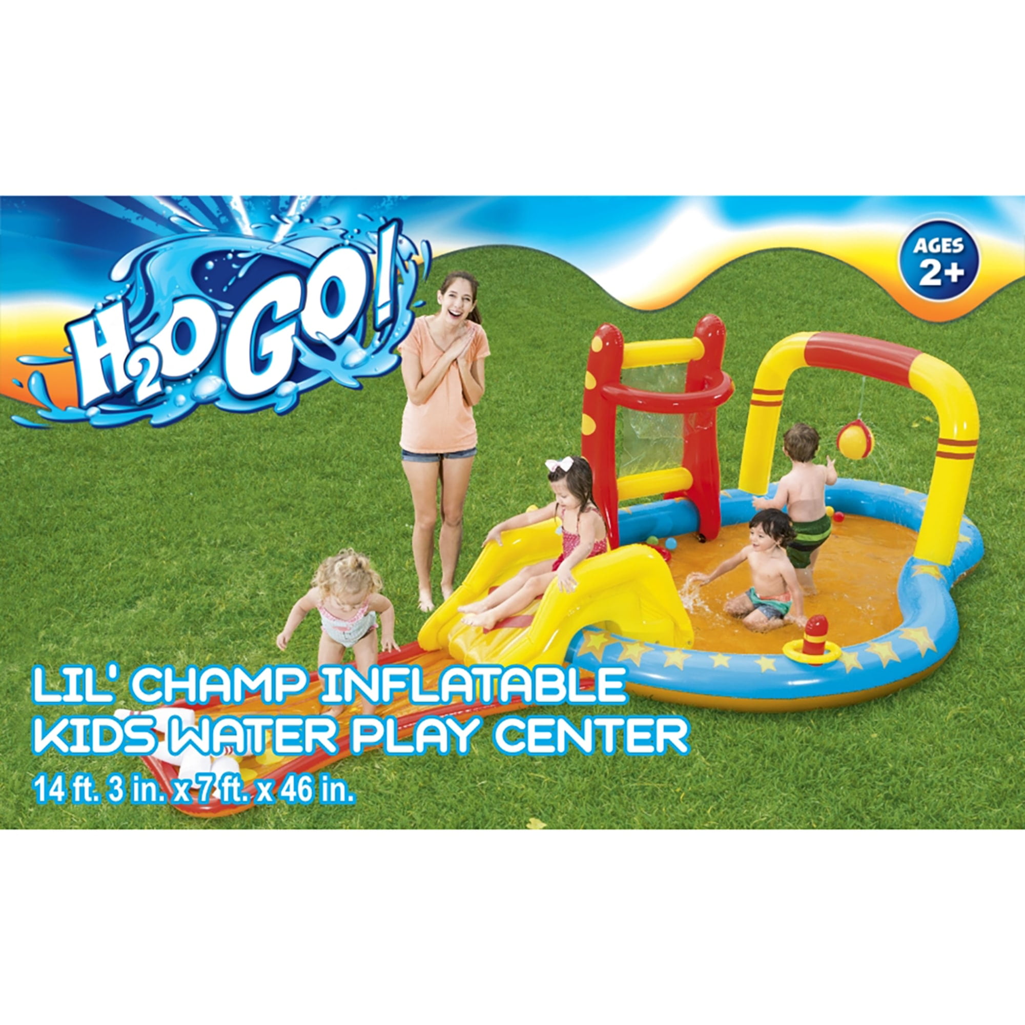 H2OGO! LIL’ CHAMP INFLATABLE PLAY CENTER – Give the kids four games in one with the H2OGO! Lil’ Champ Inflatable Kids Water Play Center. The inflatable play center is quality-tested and puts the focus back on fun! Your kids can bowl, play basketball, hit a tether ball and join in a game of ring toss as the play center turns into a mini-waterpark. The inflatable cushion on the pool floor provides extra comfort for little ones. The water sprayer attaches to your garden hose, keeping your kids cool during the hot summer months! With enough room for friends, splashing in the sun has never been more fun! ULTIMATE WATER PLAY CENTER: Provides kids with hours of fun in the sun. Your little ones can go down a slide, shoot toy balls through a hoop, splash in the pool, or play the ring toss game. SO MANY WAYS TO PLAY: Our inflatable outdoor play center has so many activities for young children, Ranging from play balls, a mini water slide, ring toss game, to inflatable bowling pins your little one will stay active. COOL OFF WITH THE KIDDIE POOL: The main area of the inflatable play center acts as a small kiddie pool for the young ones. Simply attach a garden hose to the play center to activate the water sprayer feature. Perfect for hot summer days. DESIGNED FOR SAFETY AND COMFORT: At the bottom of the slide, there’s an inflatable bowling lane that adds comfort and cushion to the landing. REMOVABLE SLIDE: The inflatable slide can be tied down in place with built-in grommets and tie ropes indicating the slide’s intended position. Remove the slide for extra room in the play center. OVERVIEW: Water Capacity: 83 gal. (314 L). Contents: 1 play center, 6 bowling pins, 1 basketball stand, 2 inflatable rings, 4 play balls, 1 repair patch. Size: 14 ft. 3 in. x 7 ft. x 46 in. (4.35 m x 2.13 m x 1.17 m).