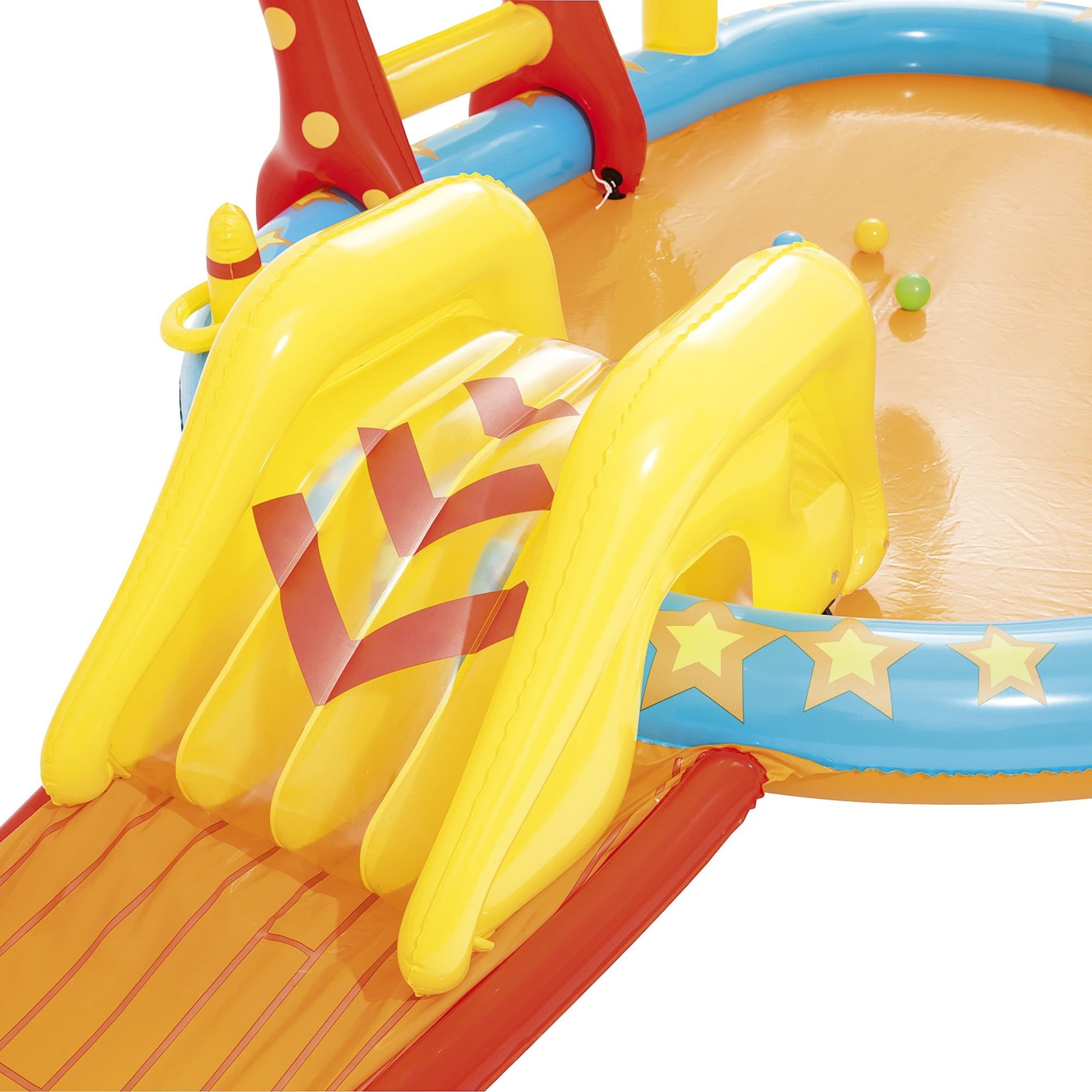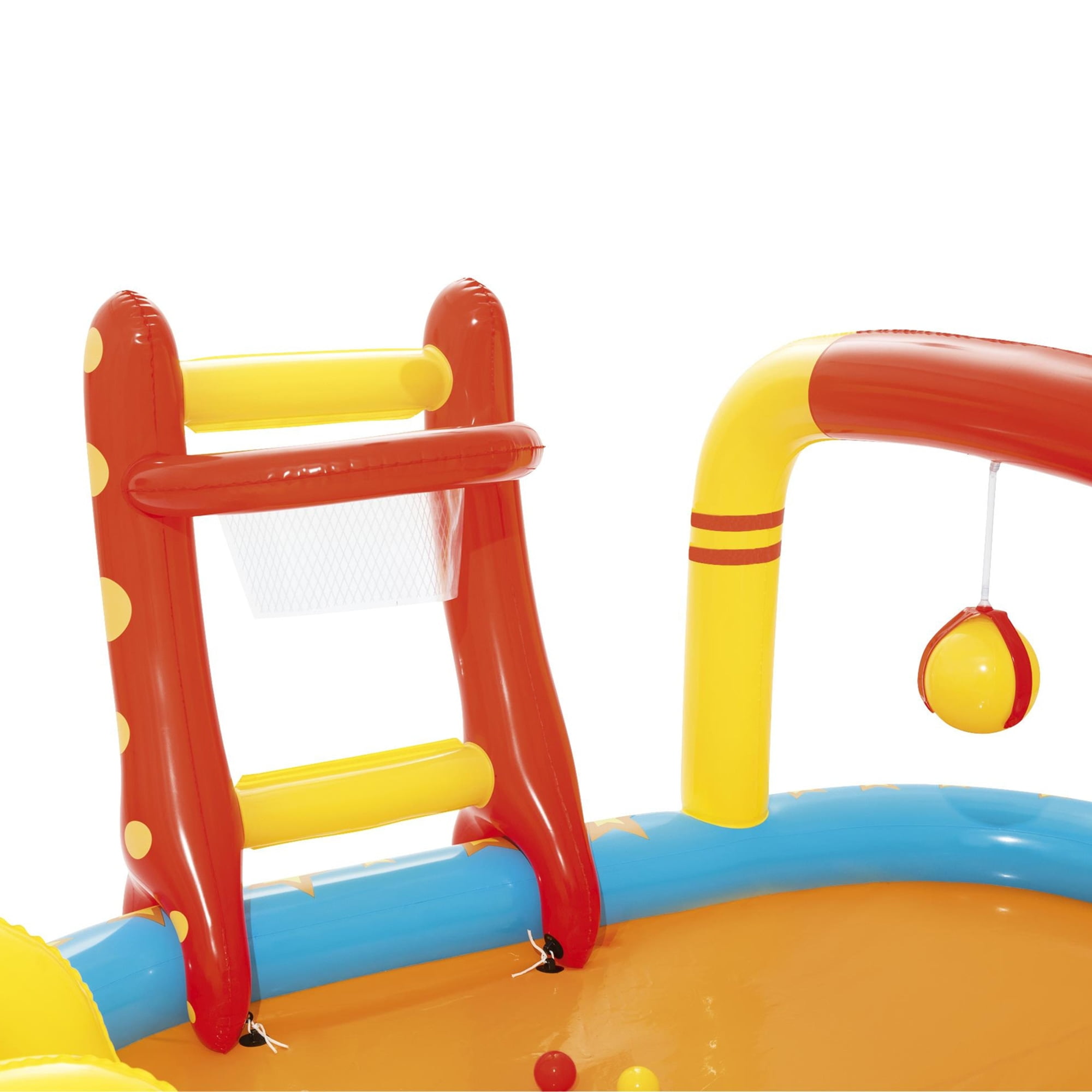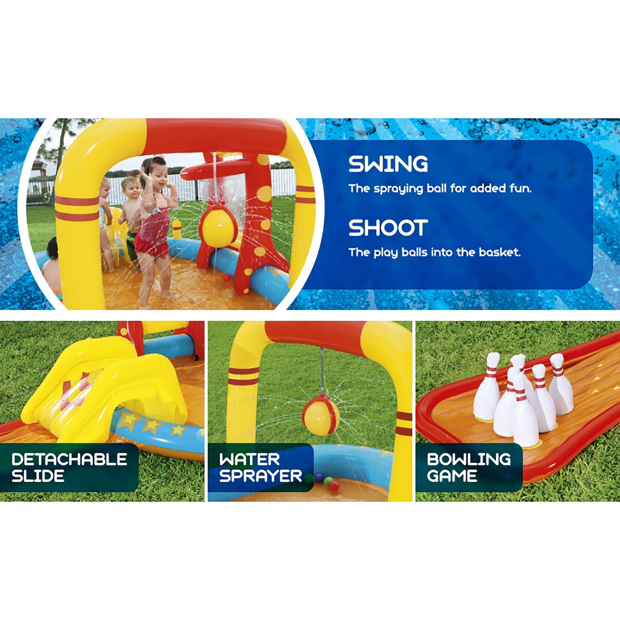 MULTI-GAME PLAY CENTER FOR ENDLESS FUN: The H2OGO! Lil’ Champ Play Center offers four exciting games in one, including basketball, bowling, tetherball, and ring toss, keeping kids entertained for hours in the sun and water. DETACHABLE SLIDE FOR ADDED FUN: This inflatable play center comes with a removable slide that can be securely tied down with grommets and tie ropes, offering safe and exciting sliding action for kids. BUILT-IN WATER SPRAYER & KIDDIE POOL: Attach a garden hose to activate the sprayer and create a cool splash zone. The main pool area offers a comfortable refreshing space for little ones to cool off during hot summer days. BOWLING PINS, RING TOSS & MORE: The play center comes with 6 bowling pins, 2 inflatable rings, and 4 play balls, giving kids multiple activities to enjoy. From shooting hoops to bowling, they’ll stay active and engaged. OMFORTABLE INFLATABLE POOL FLOOR: The inflatable cushion at the bottom of the slide provides added comfort, ensuring a soft and safe landing for your little ones as they enjoy hours of fun in the play center.