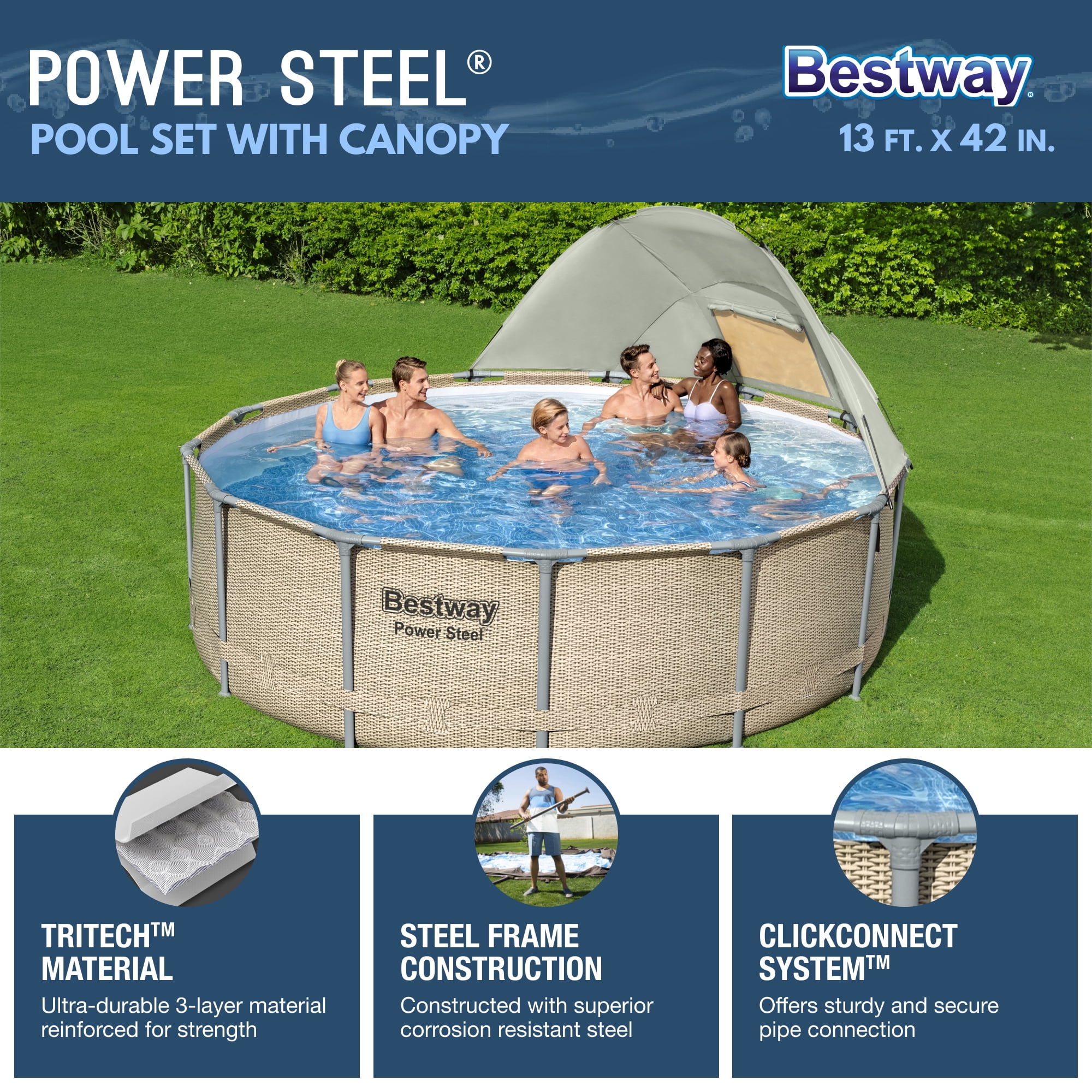 Features: Enjoy-hours of enjoyment and relief from the heat in the comfort of your very own backyard Rugged and long-lasting power steel frame with puncture-resistant liner is designed to last for-years to come 13 ft. x 42 in. pool holds up to 2,941 Gal., more than enough for the whole family ChemConnect dispenser, pump, and filter included helping keep your water crystal clear and chemically-balanced Enhanced 3-ply liner is durable and puncture-resistant Corrosion-resistant steel frame is held together with the seal and lock system to provide ultimate strength and connection Includes a 530 Gal. filter pump, ladder, pool cover, canopy, and ChemConnect chemical dispenser Easy no-tool setup and takedown process Pool cover keeps out leaves, dirt, critters, and more Dimensions (D x H): 13 ft. x 13 ft. x 42 in. Weight: 97 lbs. Manufacturer warranty: 90-day warranty