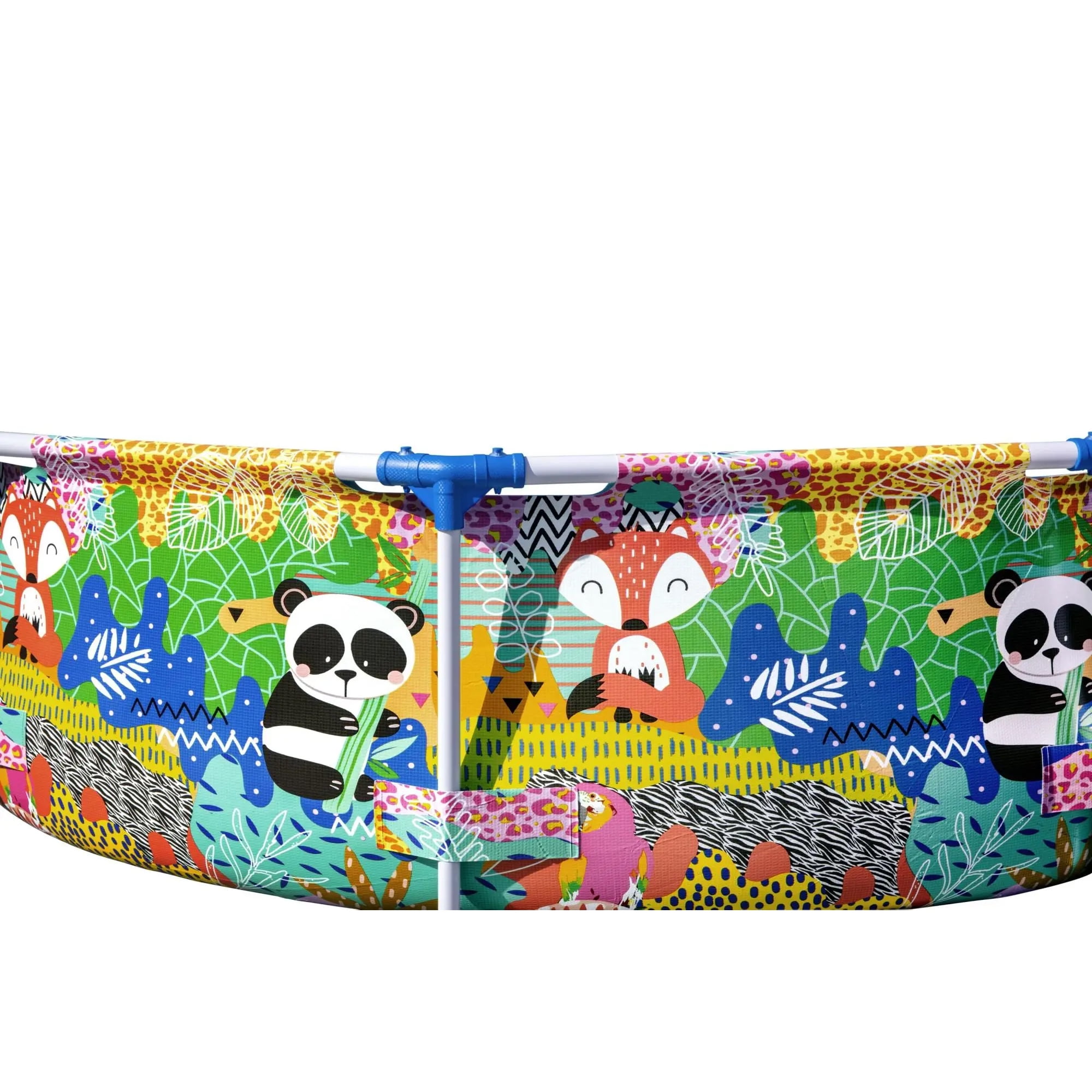 Spend your summer on the water in the large 851-gallon above-ground pool with colorful animal graphics on the side, Attractive, colorful graphics pool easily sets up and dismantles for off-season storage, requiring no tools for assembly, Round 9-foot swimming pool provides a great way for the family to splash around in the sun all summer long, Connects to a hose with a built-in flow control valve to quickly and easily fill up or drain away pool water, Built with a corrosion-proof steel frame held together by the FrameLink system to provide remarkable connection, Features a DuraPlus enhanced 3-ply liner that is durable and prevents punctures for long-lasting use, Capacity: 851 gallons, Material: Steel, Color: Multicolor, Dimensions (L x W x H): 108 x 108 x 26 inches, Weight: 30.94 pounds, Manufacturer warranty: 90-day warranty