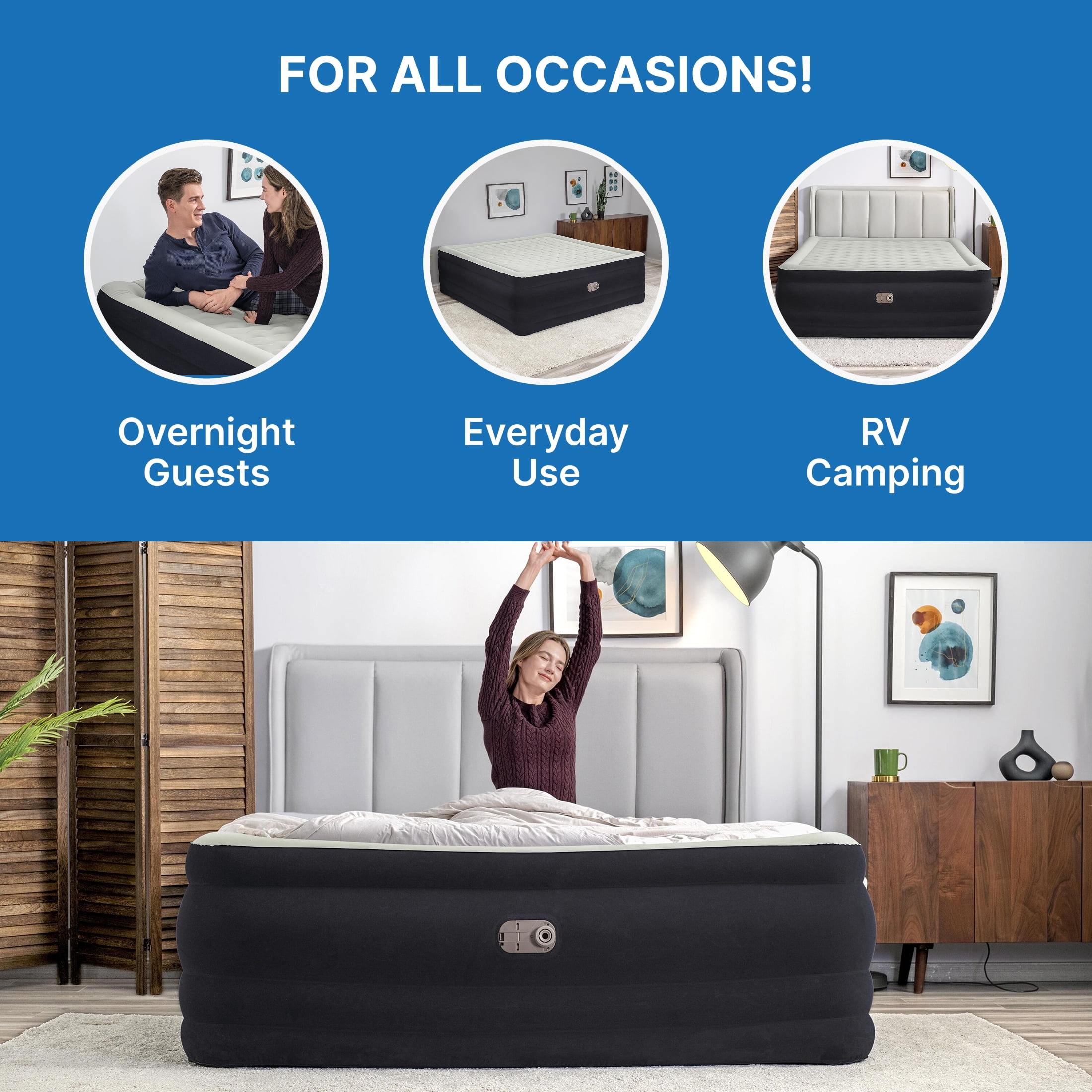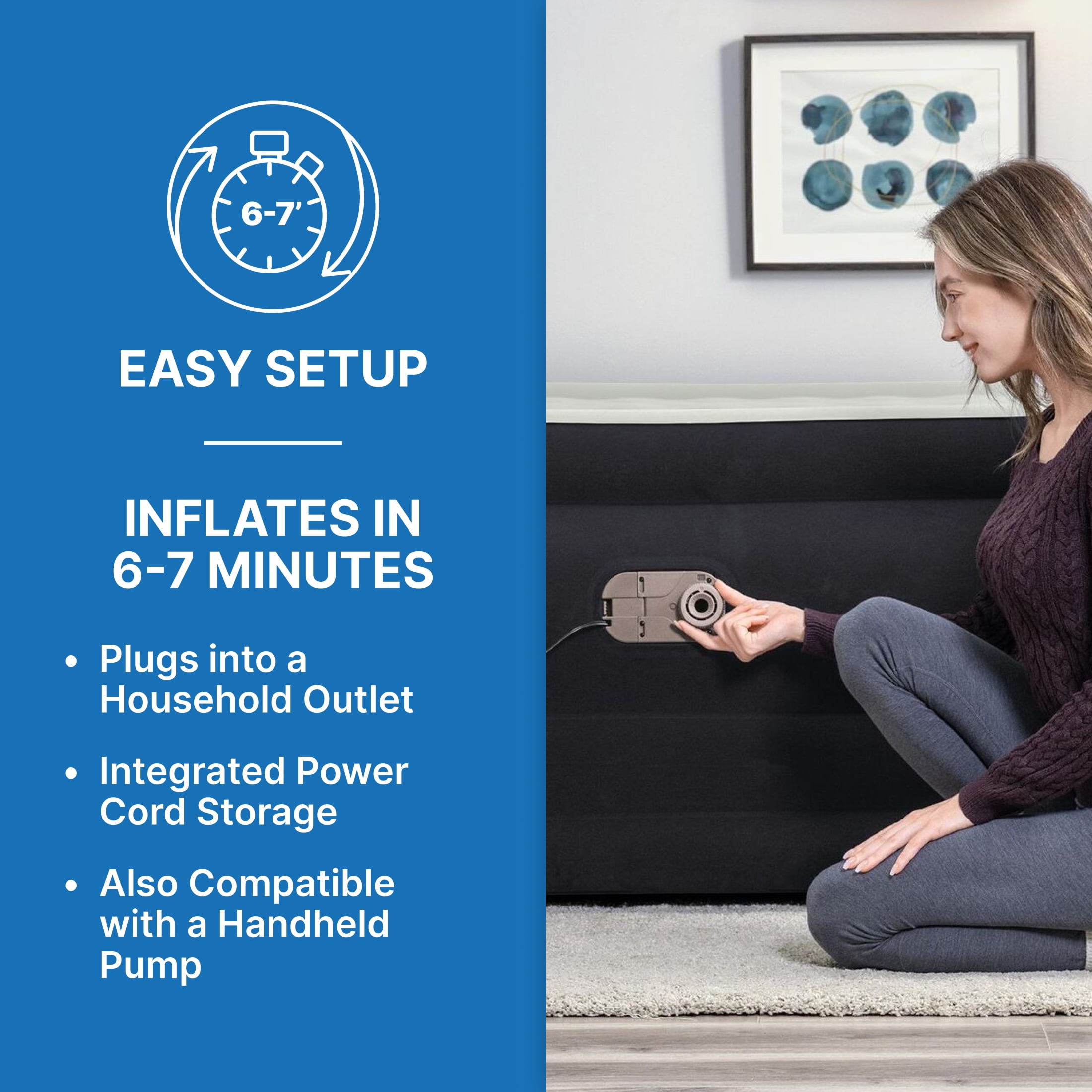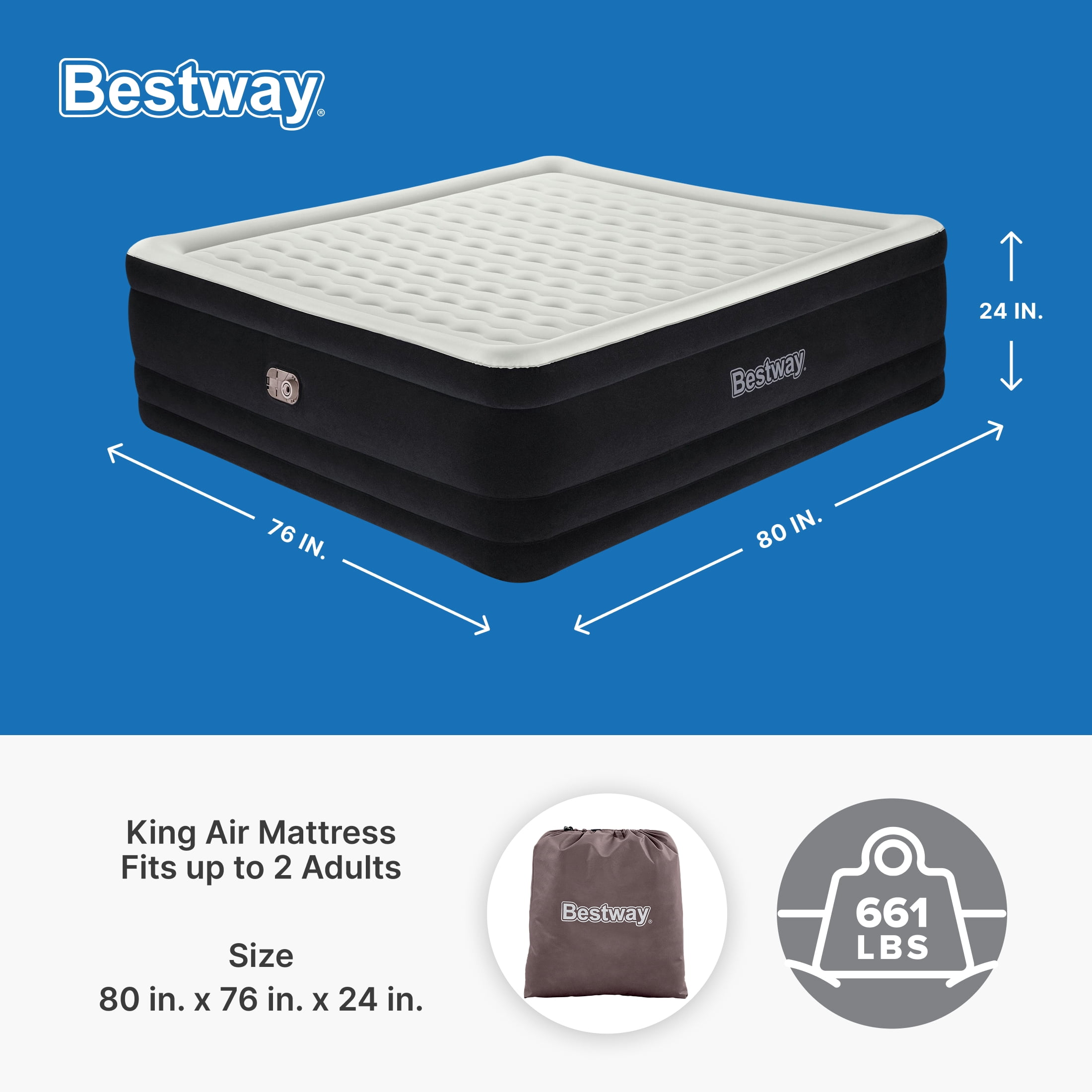 Size: 80 in. x 76 in. x 24 in. / 2.03 m x 1.93 m x 61 cm King Air Mattress – fits up to 2 adults Built-in 110-120V AC pump inflates the bed in 6-7 minutes Durable Tritech® air mattress construction can withstand the stress, weight and movement that come with a great night’s sleep Surrounding frame design prevents roll-off and increases comfort Comfortable flocked sleeping surface and sides Weight Capacity: 661 lbs (300 kg)