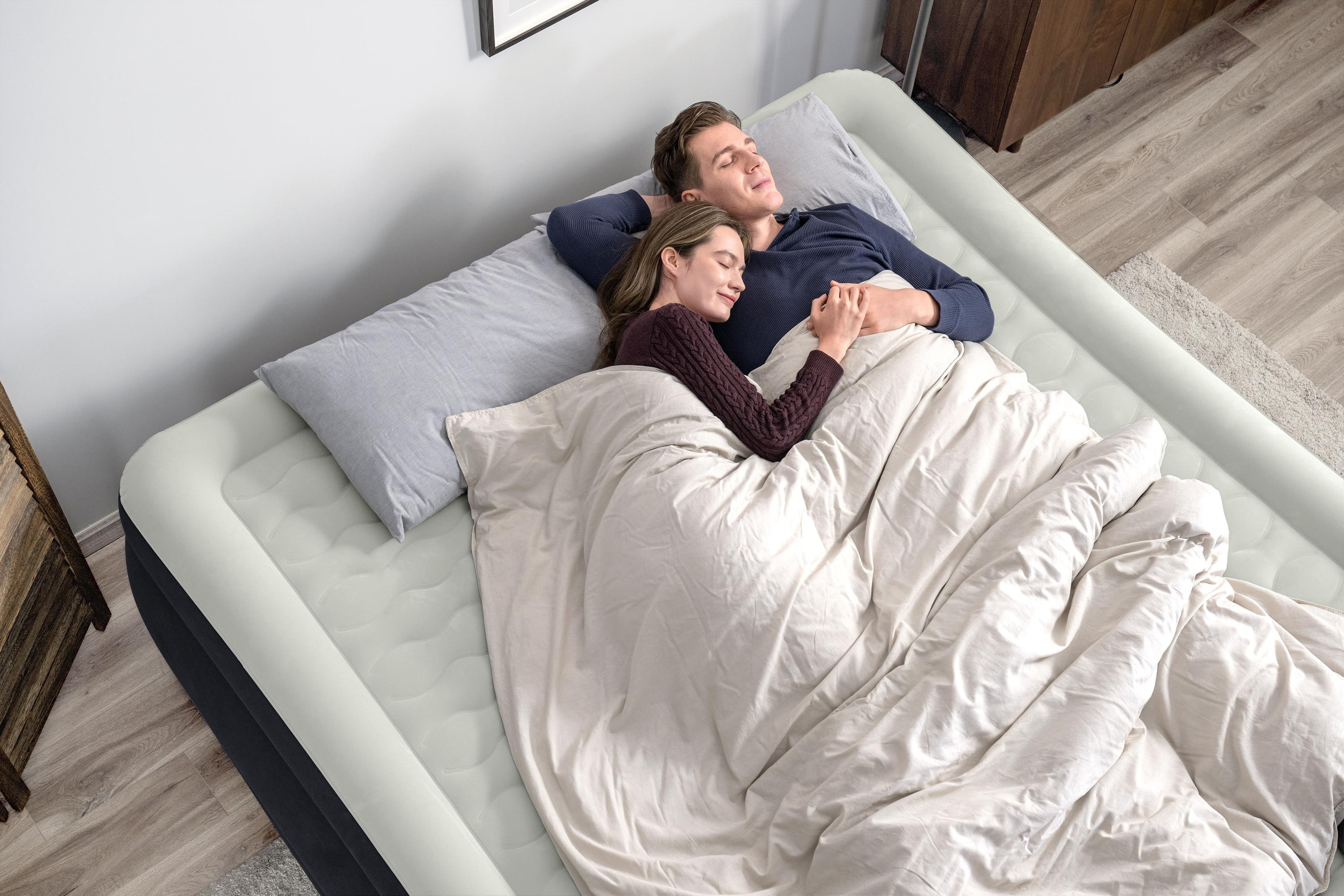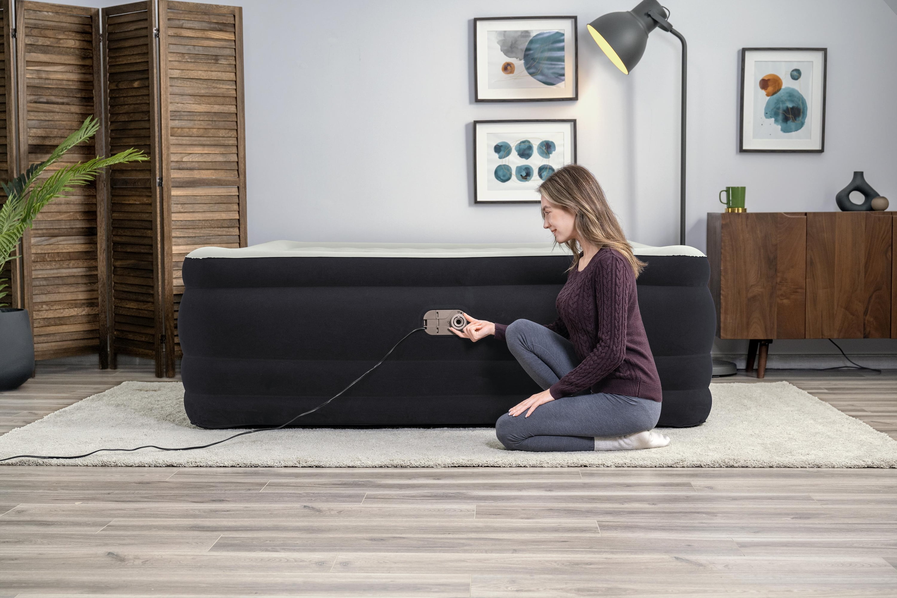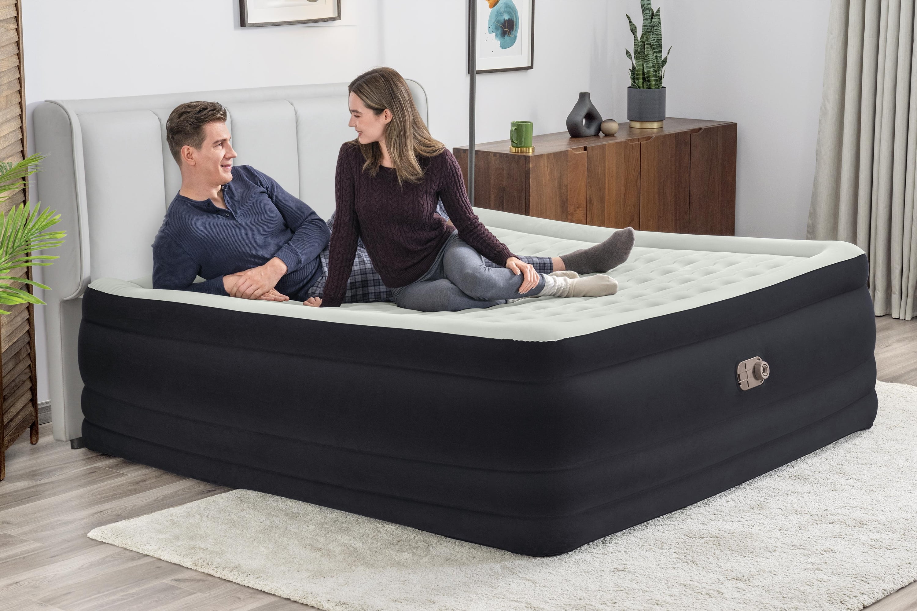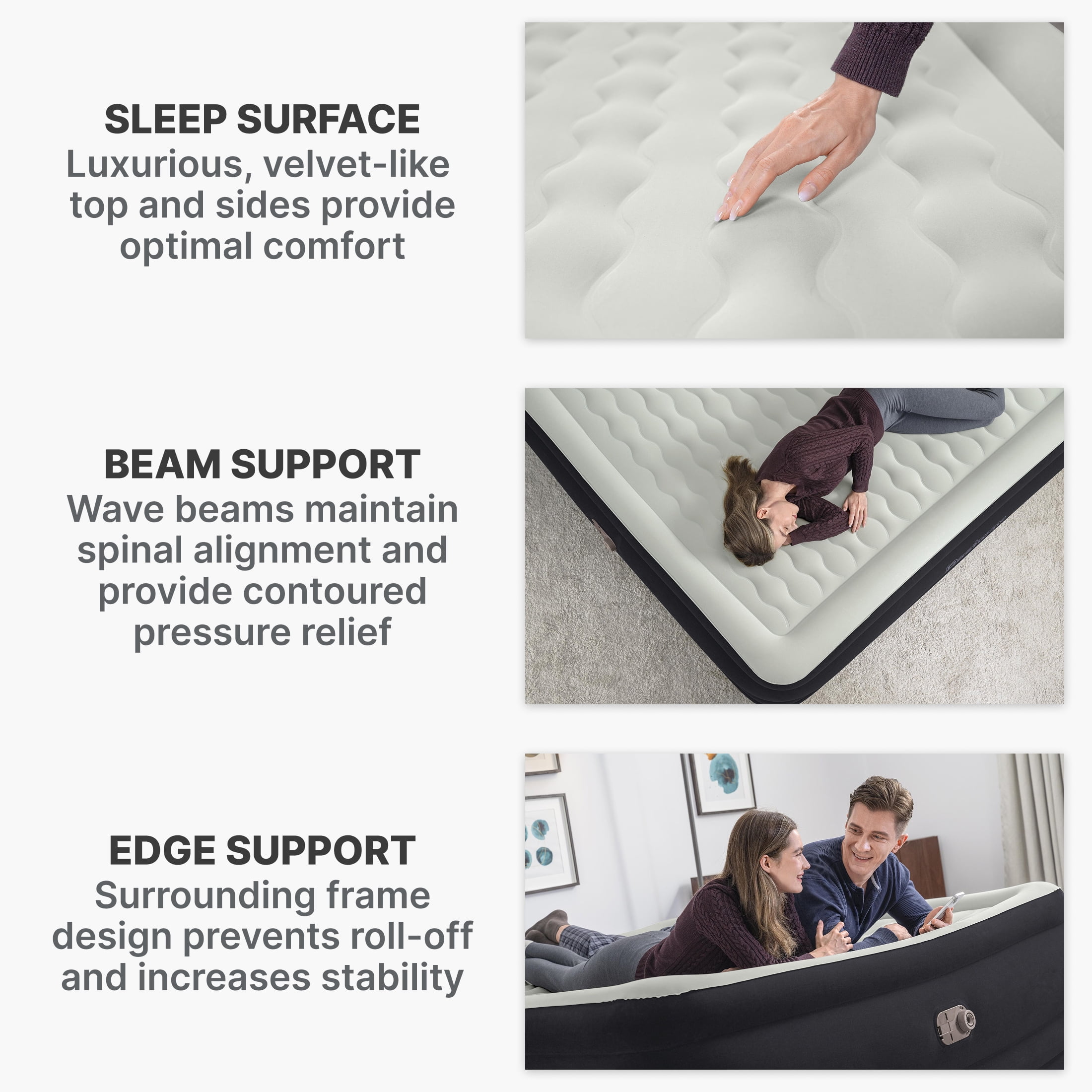 Size: 80 in. x 76 in. x 24 in. / 2.03 m x 1.93 m x 61 cm King Air Mattress – fits up to 2 adults Built-in 110-120V AC pump inflates the bed in 6-7 minutes Durable Tritech® air mattress construction can withstand the stress, weight and movement that come with a great night’s sleep Surrounding frame design prevents roll-off and increases comfort Comfortable flocked sleeping surface and sides Weight Capacity: 661 lbs (300 kg)