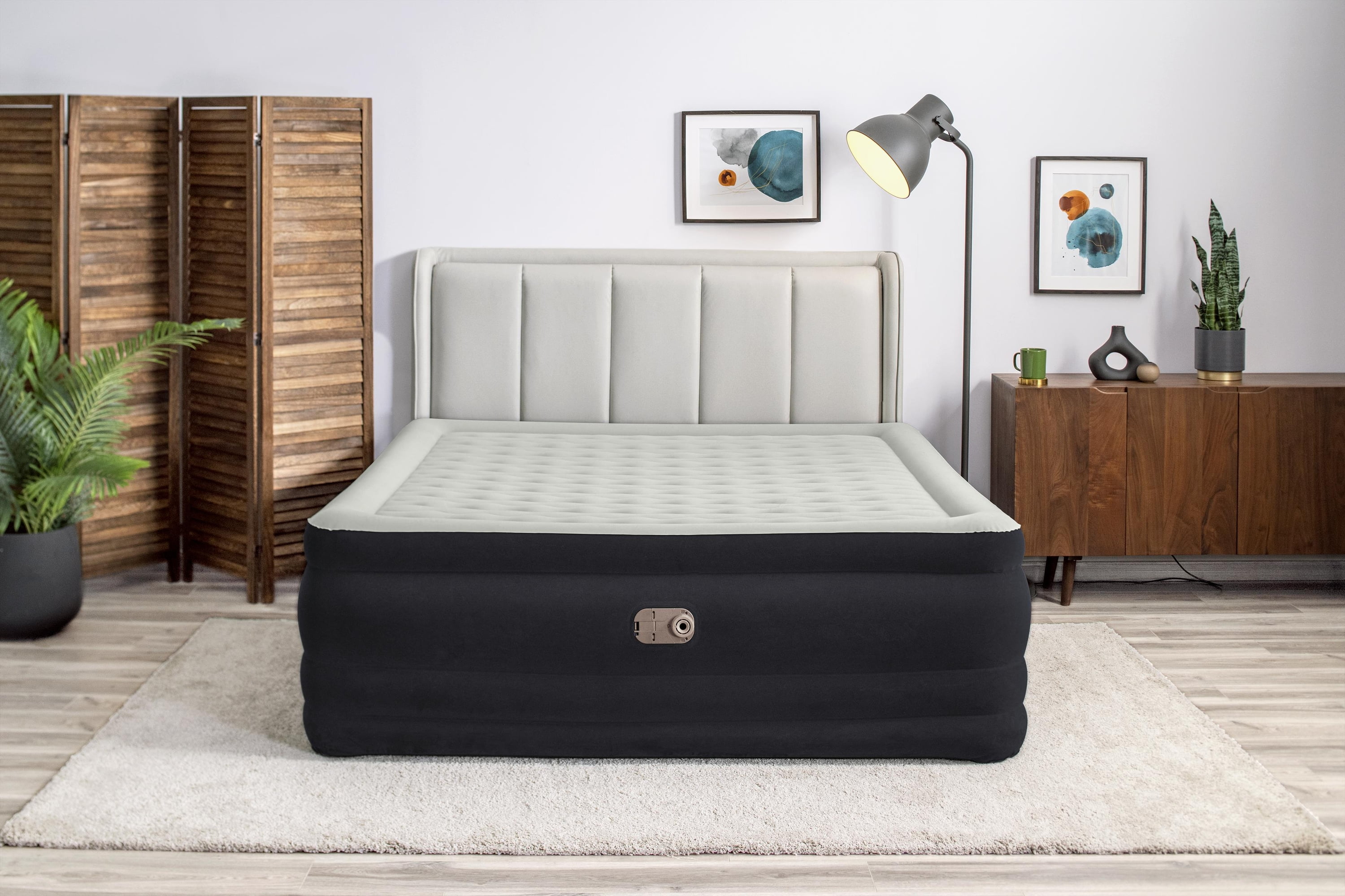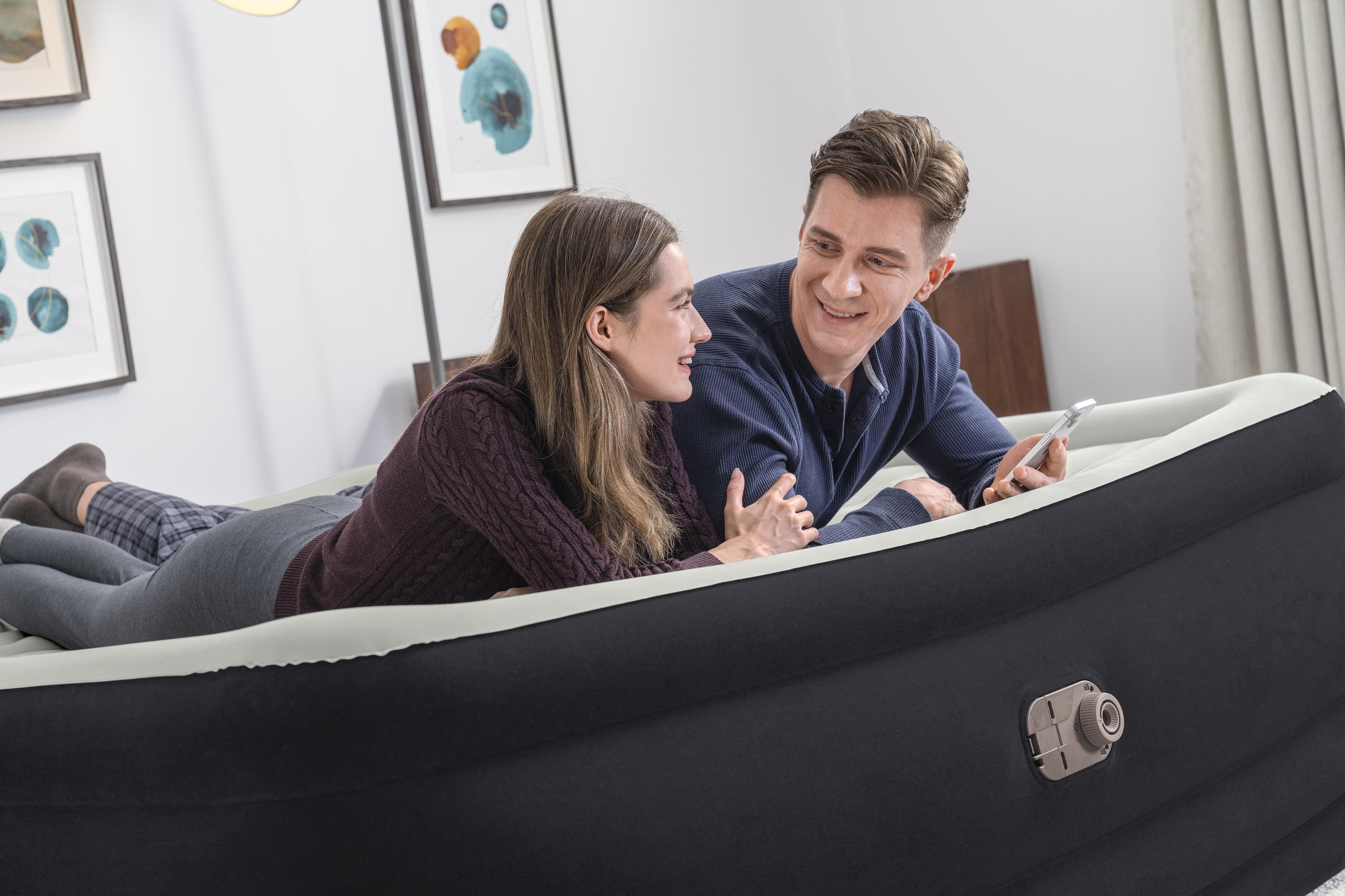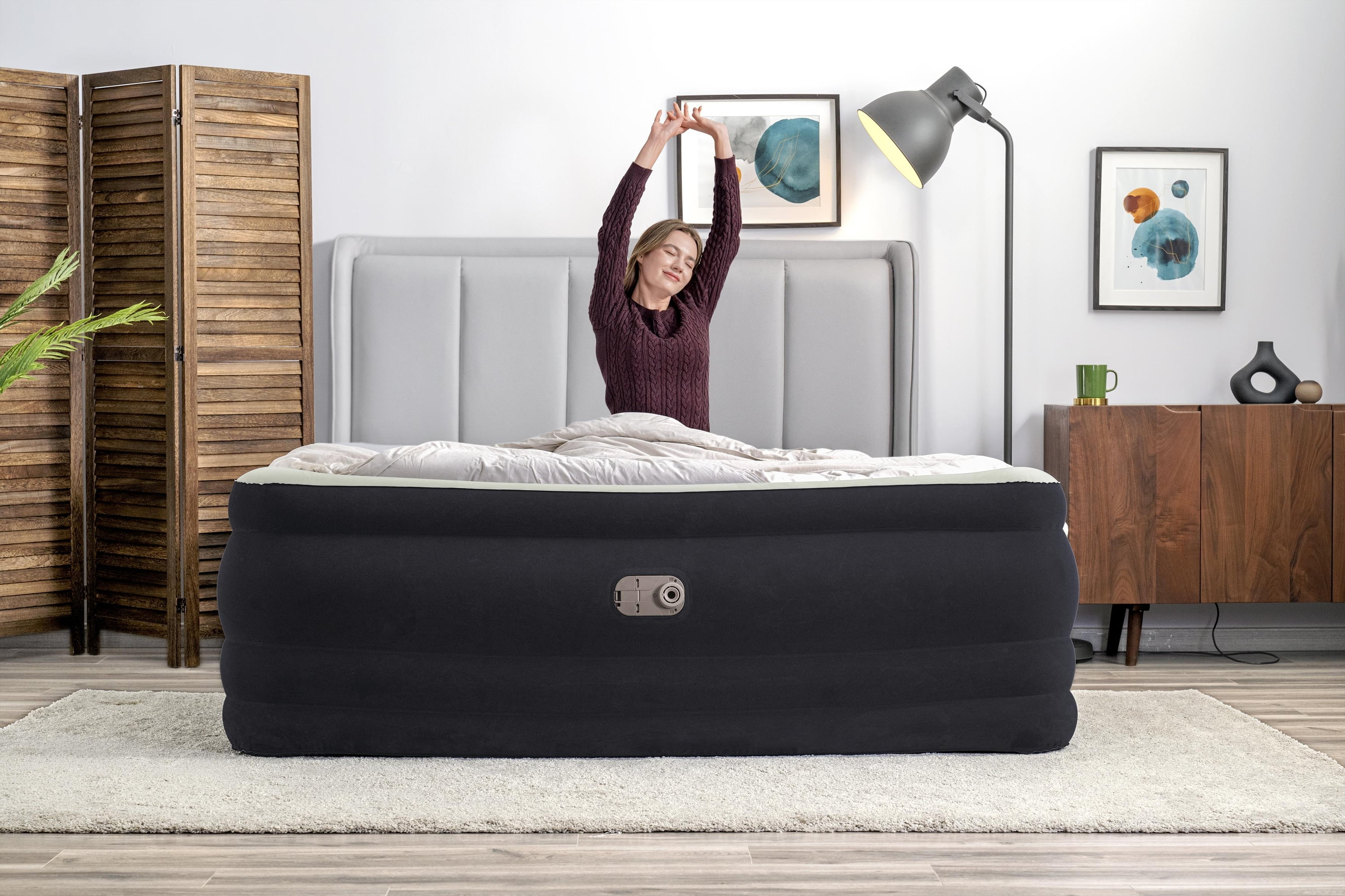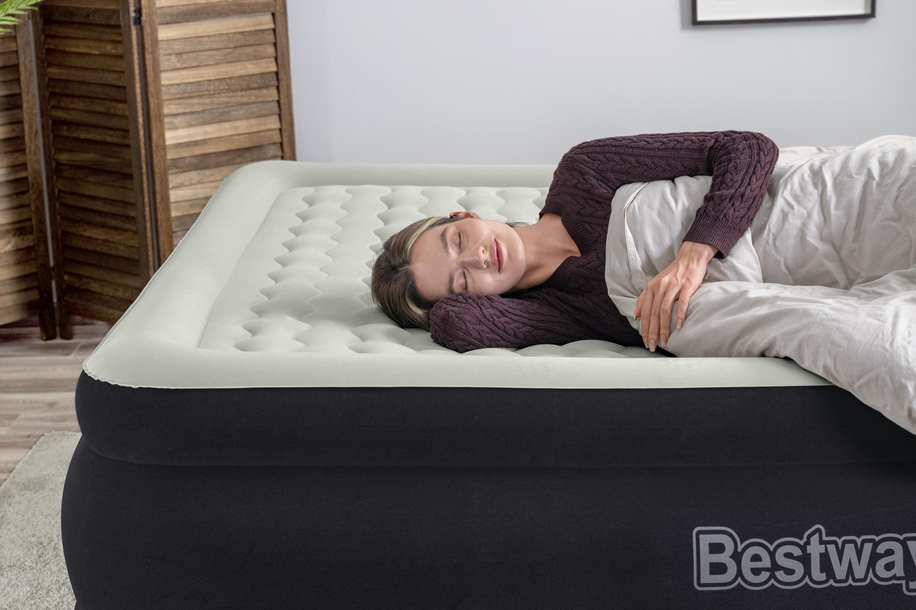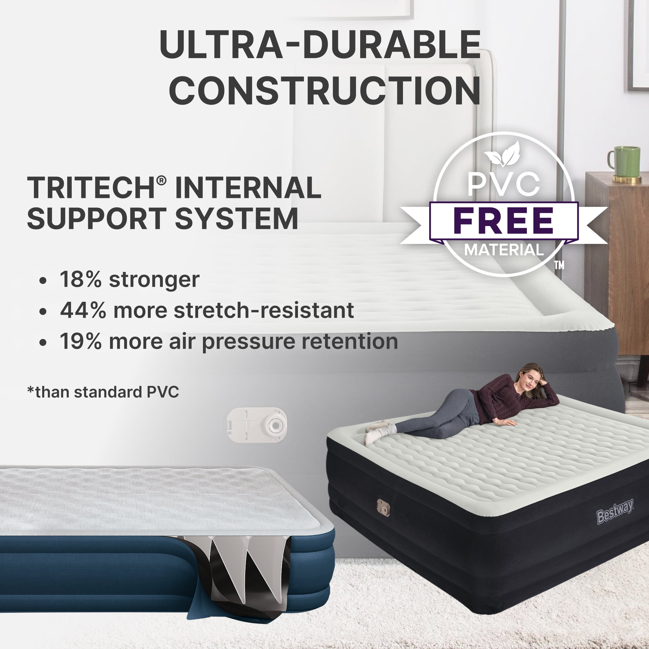 Wake up renewed and refreshed on the Bestway® Tritech® Air Mattress! This King-sized bed promises strength, durability and comfort all night long. Its compact size and built-in pump make it quick and convenient for use whenever you need it. Durable Construction: With a comfortable sleeping surface and sturdy construction, a great night’s sleep is right around the corner. The internal structure of this bed is made with Tritech material offering durability and strength, while also allowing the mattress to keep the same shape no matter how many times it’s inflated and deflated. Specifically engineered for firmness, this material minimizes air loss throughout the night. Tritech material increases internal stretch-resistance and provides contoured support for all night comfort. This durable, stress-tested material can withstand all of the weight and movement that comes with a great night’s sleep. Simple Setup: This air mattress inflates in 6-7 minutes so it is ready for bed when you are. The built-in pump allows for easy inflation, and the quick deflate screw valve allows for easy deflation after use. Simply place your flattened bed in the included carrying bag for easy transport and storage.