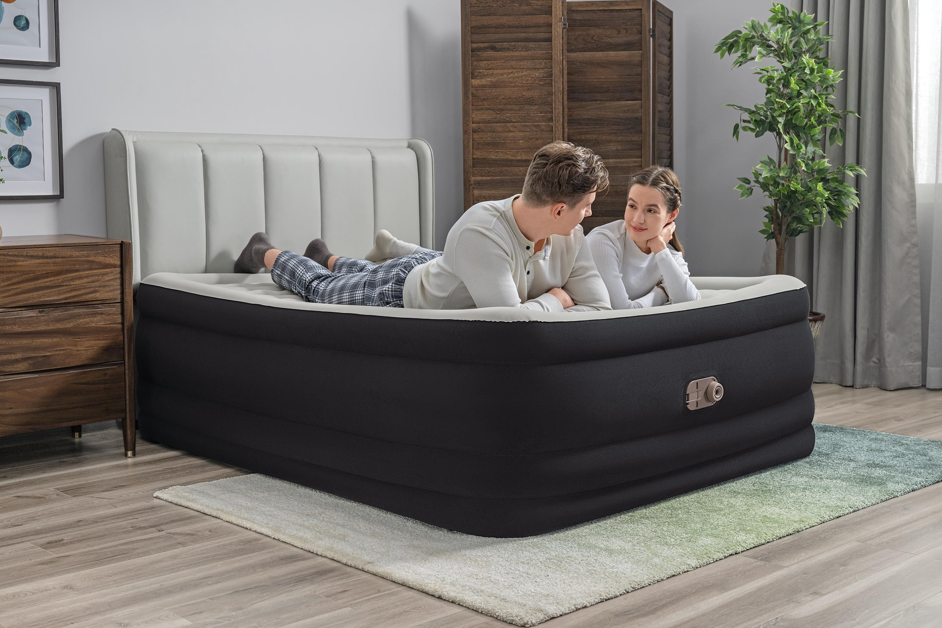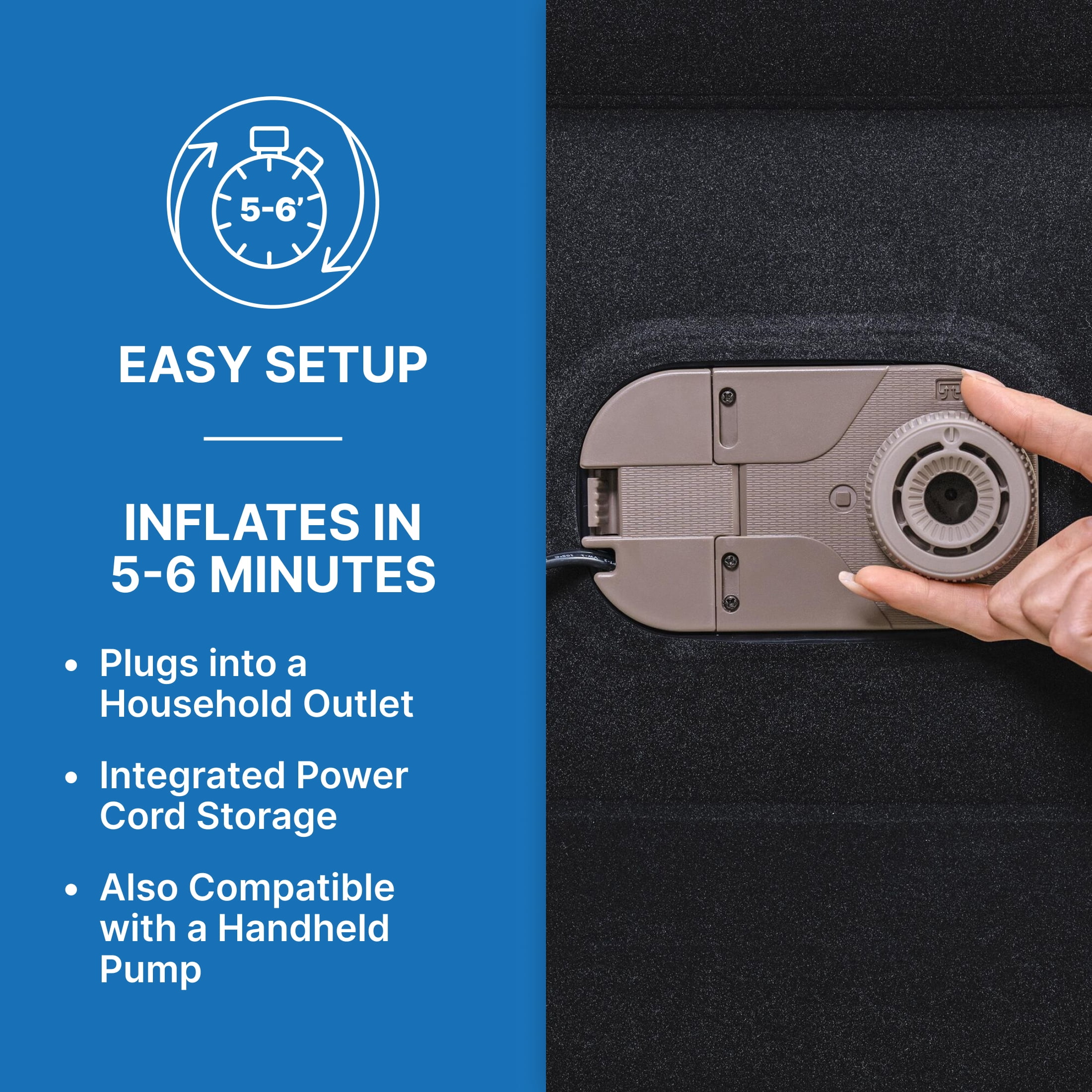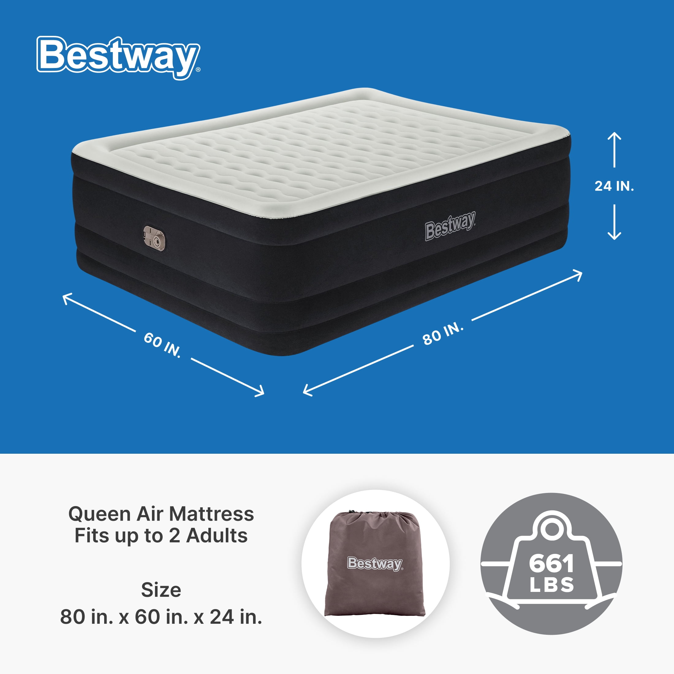 Size: 80 in. x 60 in. x 24 in. / 2.03 m x 1.52 m x 61 cm Queen Air Mattress – fits up to 2 adults Built-in 110-120V AC pump inflates the bed in 5-6 minutes Durable Tritech® air mattress construction can withstand the stress, weight and movement that come with a great night’s sleep Surrounding frame design prevents roll-off and increases comfort Comfortable flocked sleeping surface and sides Weight Capacity: 661 lbs (300 kg)