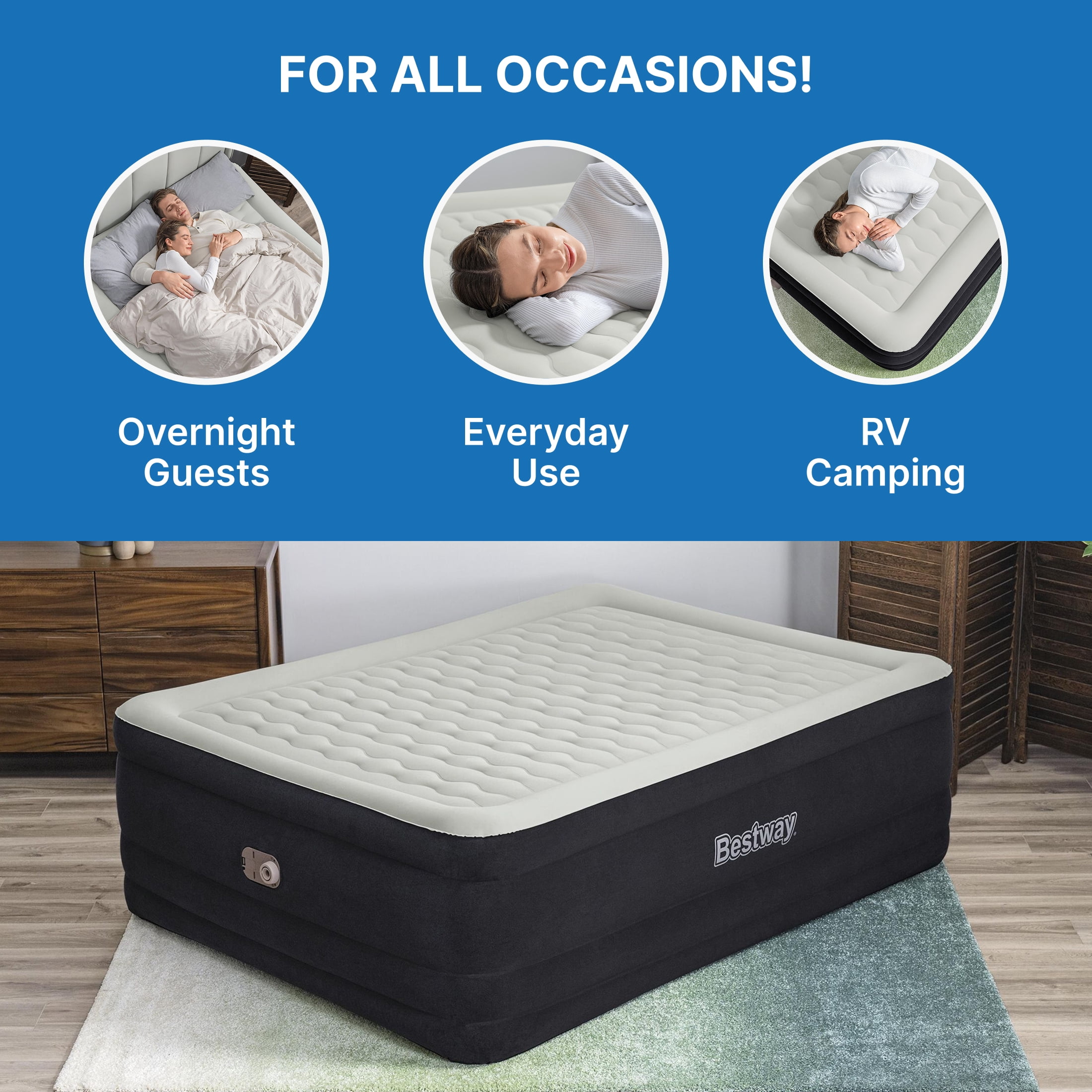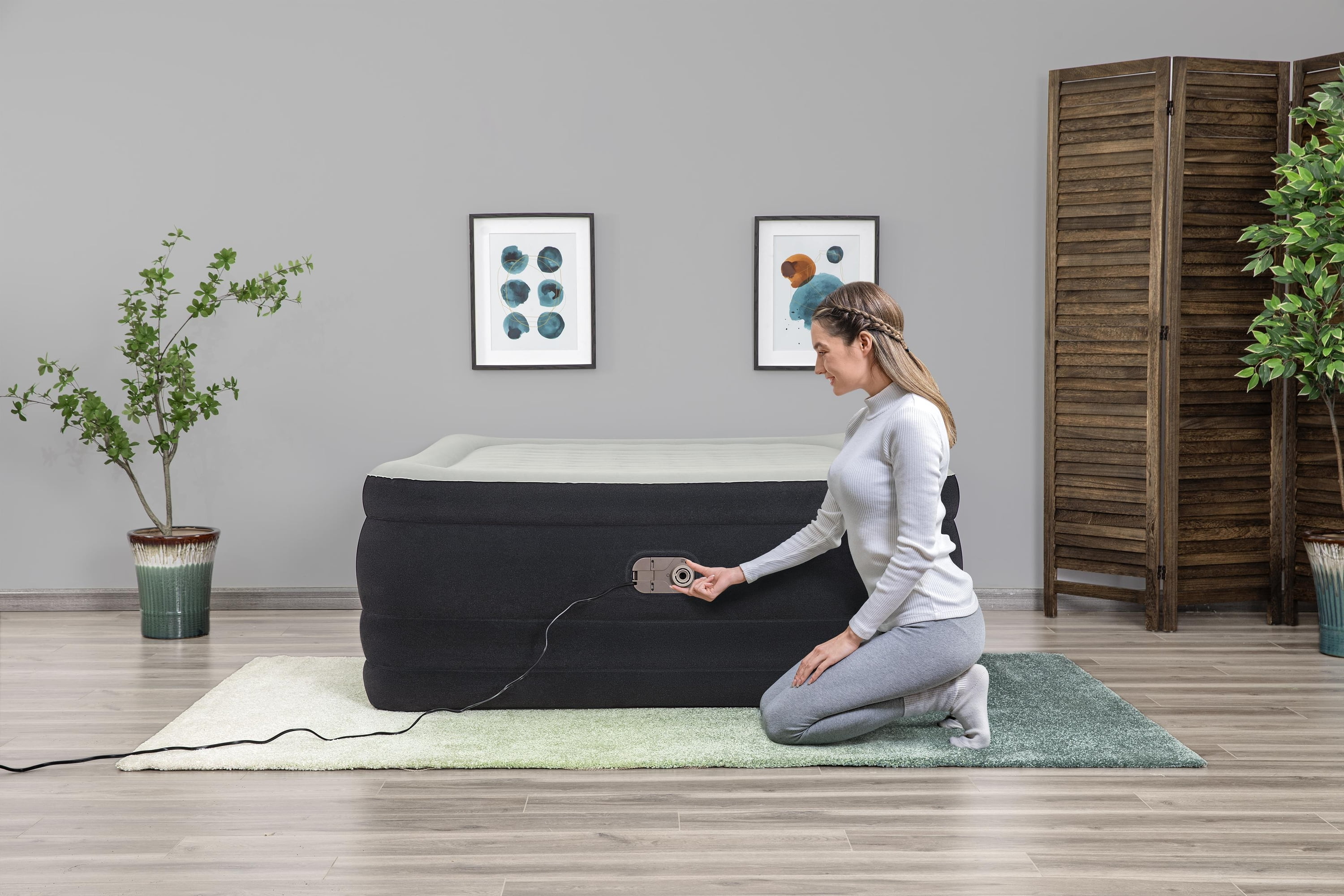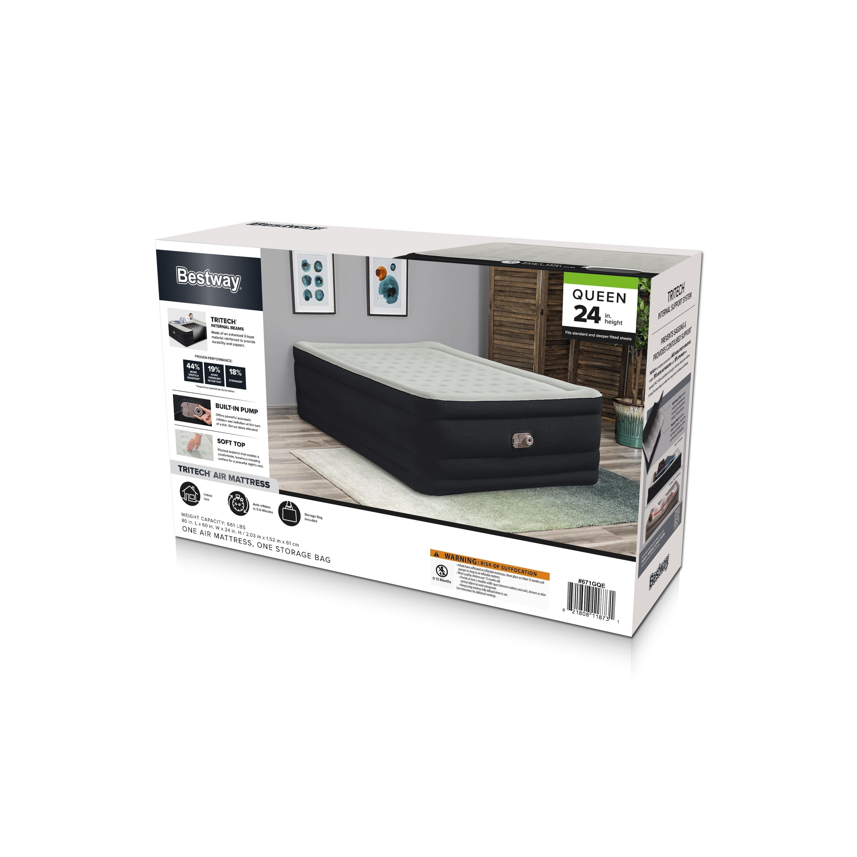 Wake up renewed and refreshed on the Bestway® Tritech® Air Mattress! This Queen-sized bed promises strength, durability and comfort all night long. Its compact size and built-in pump make it quick and convenient for use whenever you need it. Durable Construction: With a comfortable sleeping surface and sturdy construction, a great night’s sleep is right around the corner. The internal structure of this bed is made with Tritech material offering durability and strength, while also allowing the mattress to keep the same shape no matter how many times it’s inflated and deflated. Specifically engineered for firmness, this material minimizes air loss throughout the night. Tritech material increases internal stretch-resistance and provides contoured support for all night comfort. This durable, stress-tested material can withstand all of the weight and movement that comes with a great night’s sleep. Simple Setup: This air mattress inflates in 5-6 minutes so it is ready for bed when you are. The built-in pump allows for easy inflation, and the quick deflate screw valve allows for easy deflation after use. Simply place your flattened bed in the included carrying bag for easy transport and storage.