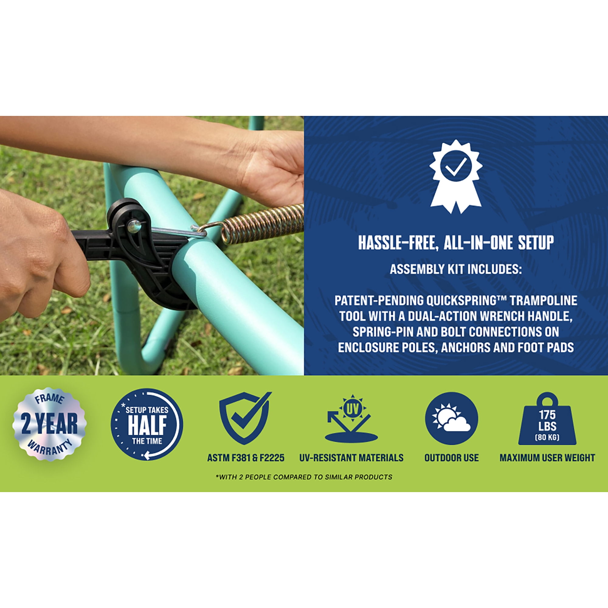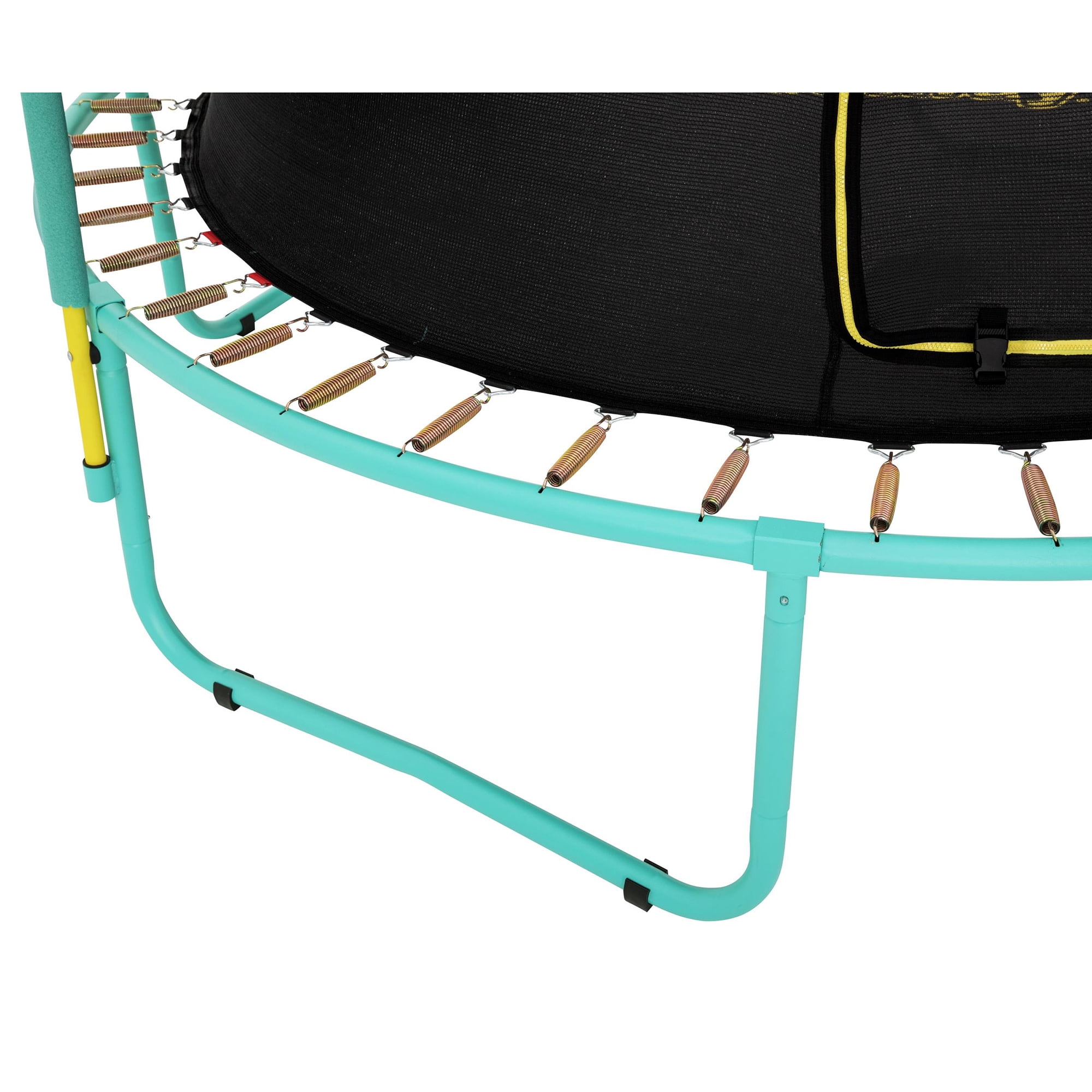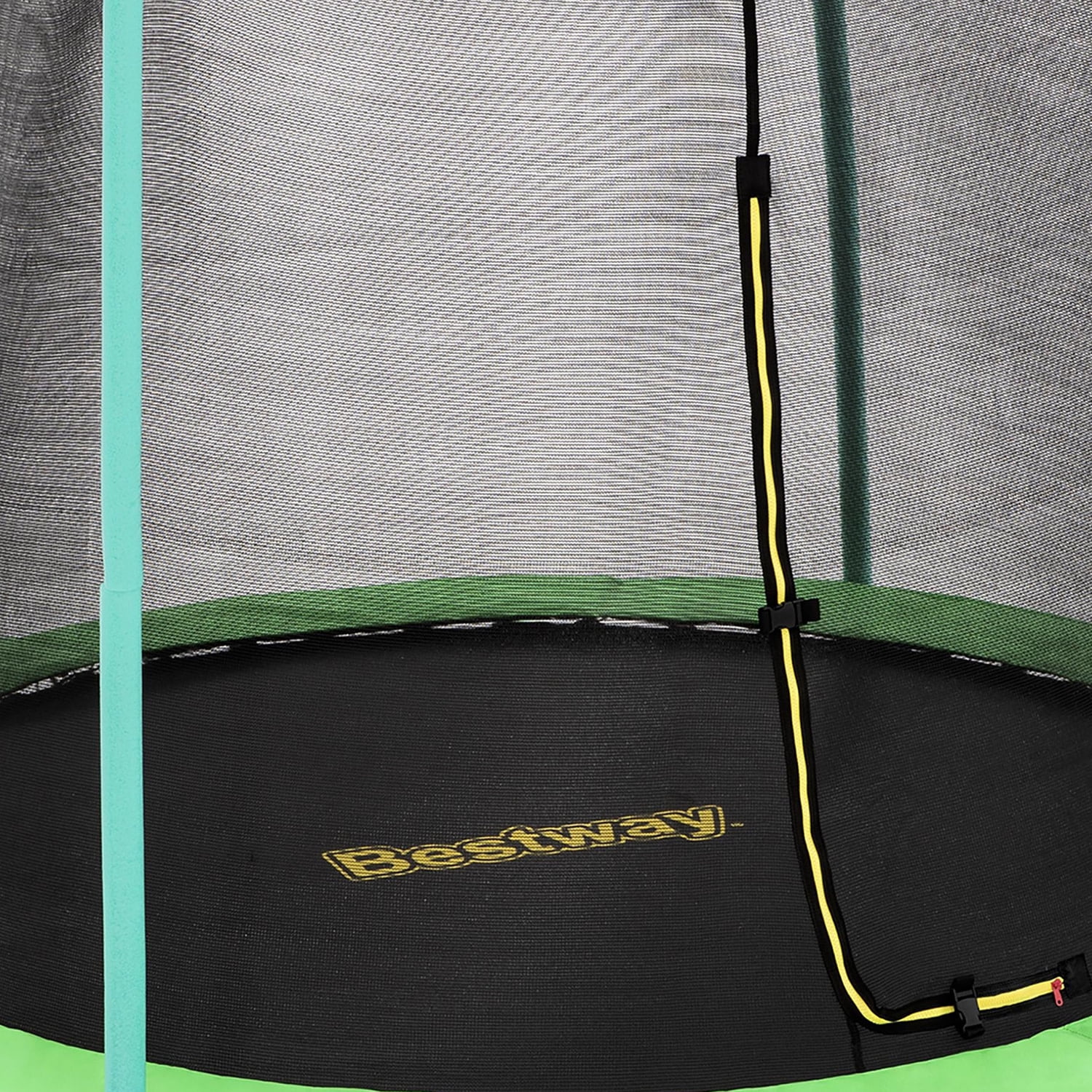 Size: 8 ft. x 7 ft. 2.5 in. (2.44 m × 2.20 m) Powder-coated galvanized steel provides extra rust and corrosion protection Features UV-resistant materials to stand up to the harsh sun Sewn enclosure with no-gap net and L-shaped zippered entry with buckles Patent-pending QuickSpring™ trampoline tool for hassle-free spring installation with a dual action wrench handle Fast & easy setup with spring-pin and bolt connections on enclosure poles Foam-padded poles for extra protection & cushioning 48 galvanized springs for improved bounce and support 2 year limited warranty on Bestway trampoline frame
