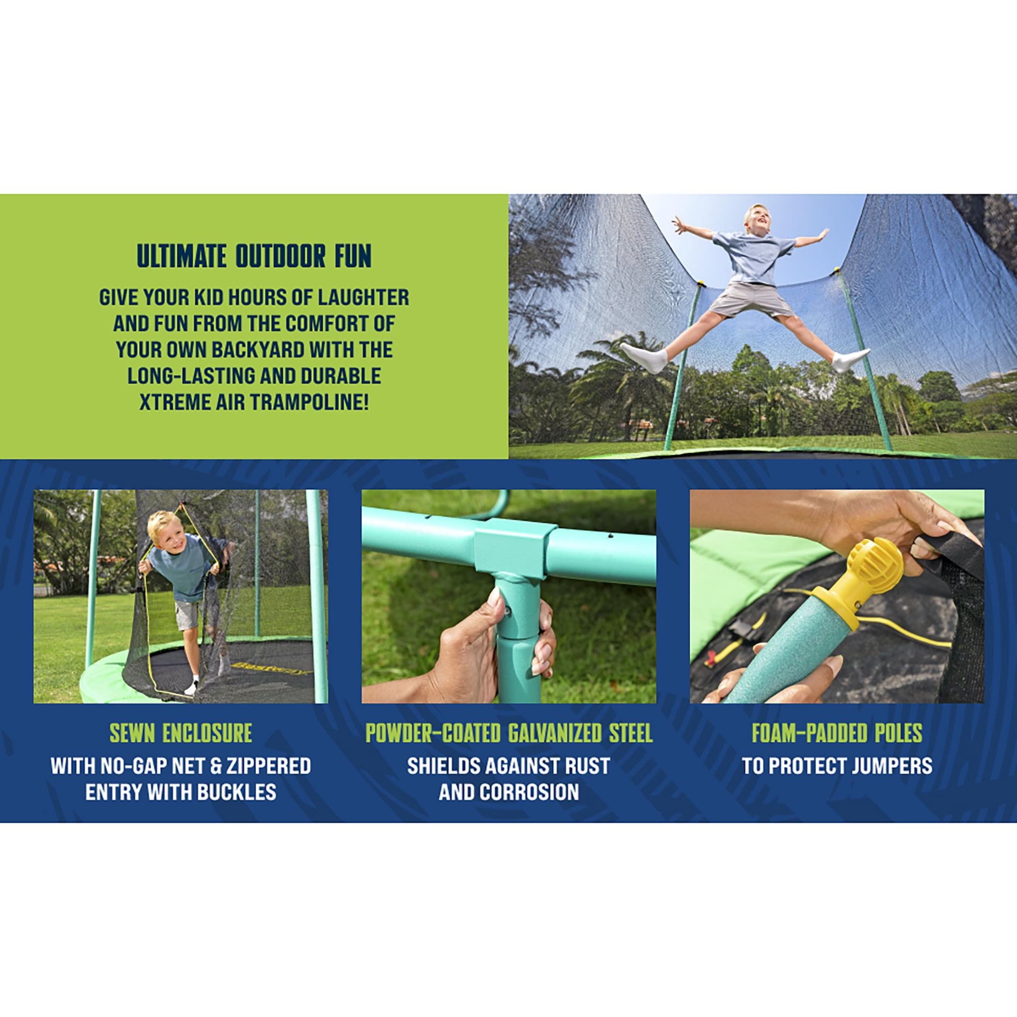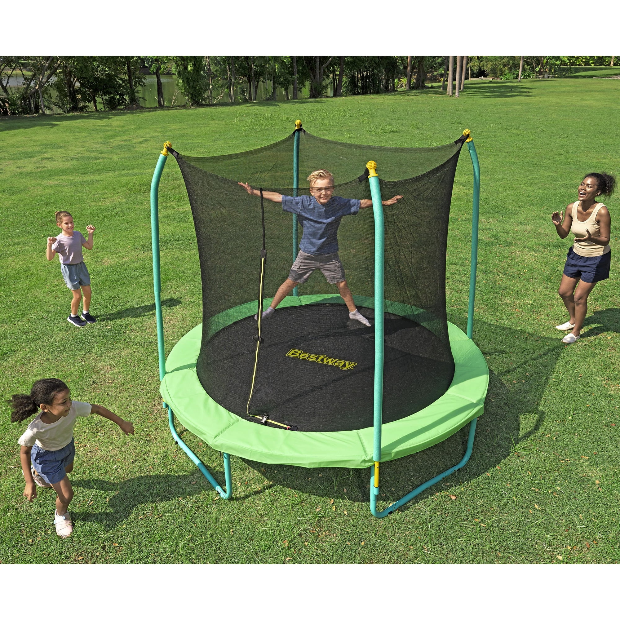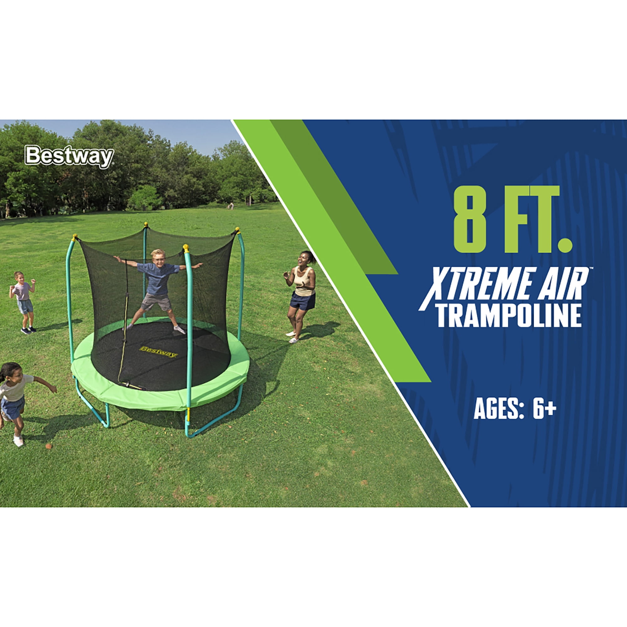Give your kid hours of laughter and fun from the comfort of your own backyard with the long-lasting and durable Bestway® Xtreme Air™ 8 ft. Trampoline. Perfect for kids ages 6 and up, the large trampoline includes a no-gap, sewn enclosure net with a zippered and buckled entry, and foam-padded enclosure poles, making it as secure as it is fun. All-in-One Setup: The Xtreme Air trampoline has all you need for a complete trampoline, including an easy assembly kit that includes Bestway’s patent-pending QuickSpring™ trampoline tool for hassle-free spring installation with a dual action wrench handle, plus spring-pin and bolt connections on the enclosure poles for simple setup. Made to Last: Built from powder-coated galvanized steel to shield the trampoline’s frame from rust and corrosion, the Xtreme Air trampoline is durable and ready to handle the outdoor elements season after season. Featuring a weather-resistant enclosure net, spring pad and jumping mat, you and your family will enjoy making memories together around the trampoline. Give your kids the ultimate way to get their energy out and have even more fun every day with the Bestway Xtreme Air 8 ft. Trampoline!