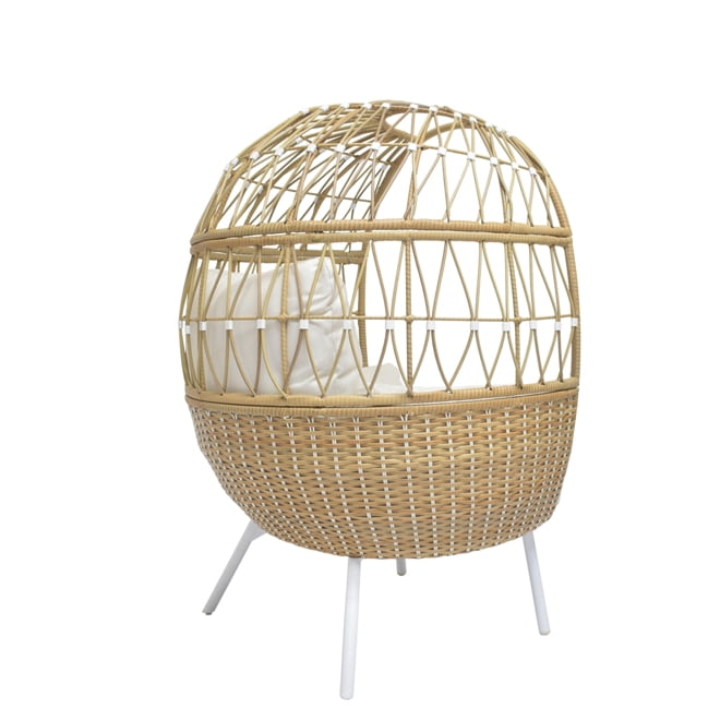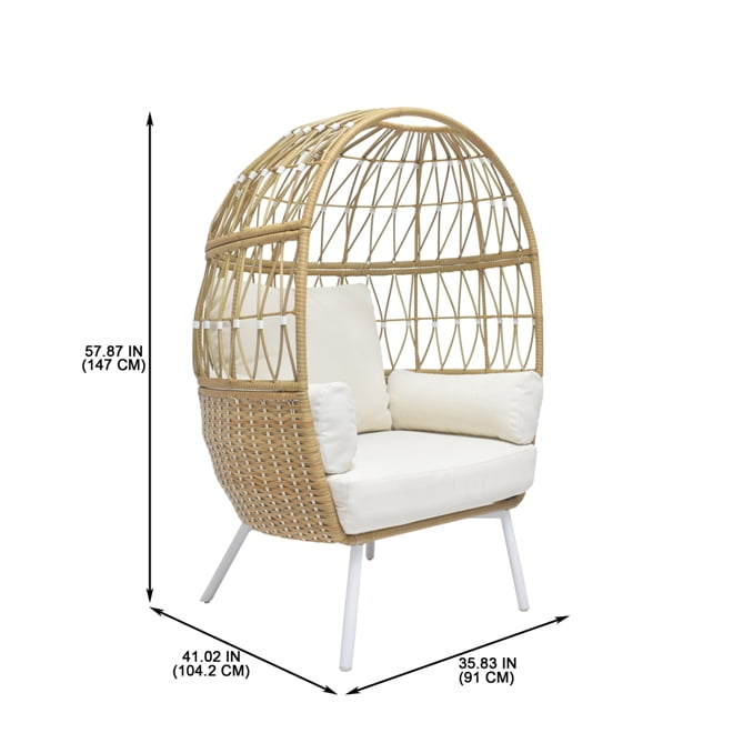 Better Homes and Gardens Lilah Boho Outdoor Stationary Wicker Egg Chair; Cream Egg Chair dimensions : 37.5″L x 41″W x 57.75″ H Plush Solution-Dyed Polyester cushions provide weather-resistant comfort with Scotchgard 3M Heavy-duty, rust-resistant, e-coated & powder-coated steel frames Handwoven, all-weather resin wicker Assembly required. Instructions, hardware kit and tools included. Part of the Better Homes & Gardens Lilah Collection Coordinating neutral tones match almost any outdoor decor style 1-year Limited Warranty Wipe clean with a damp cloth. Air dry. Do not use bleach or solvent. Furniture cover recommended.