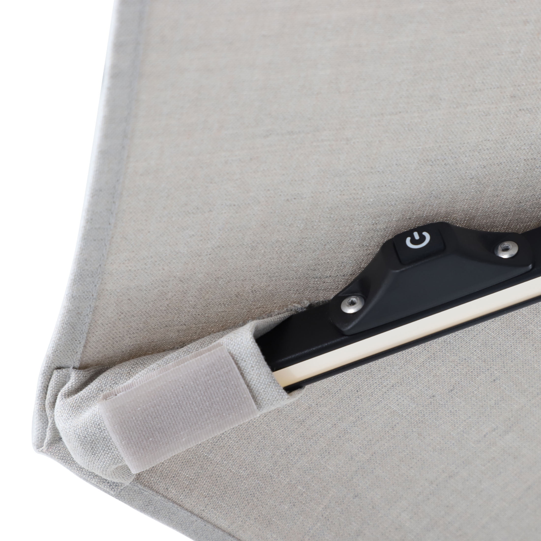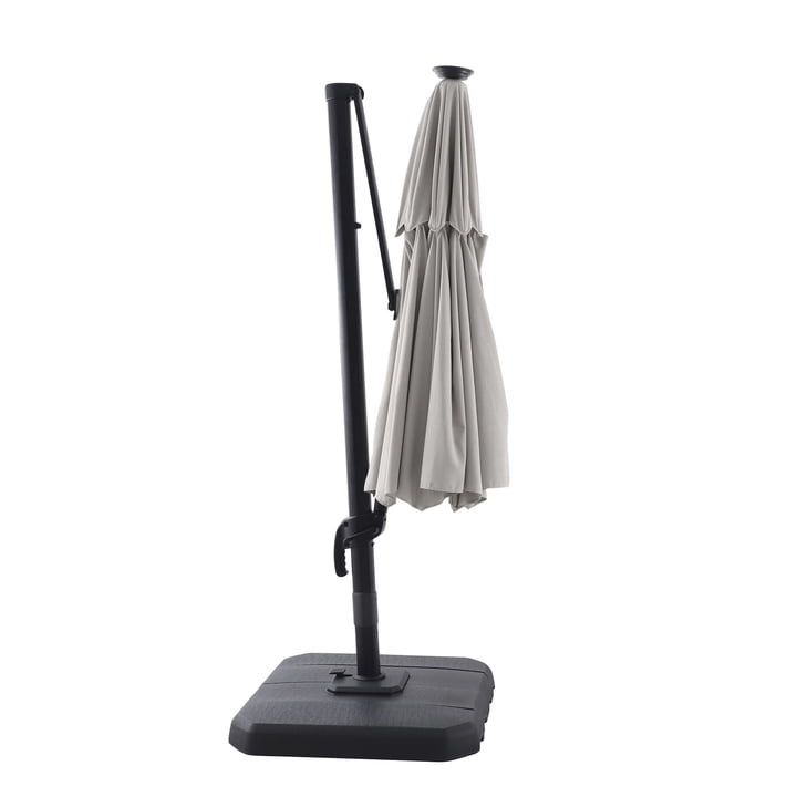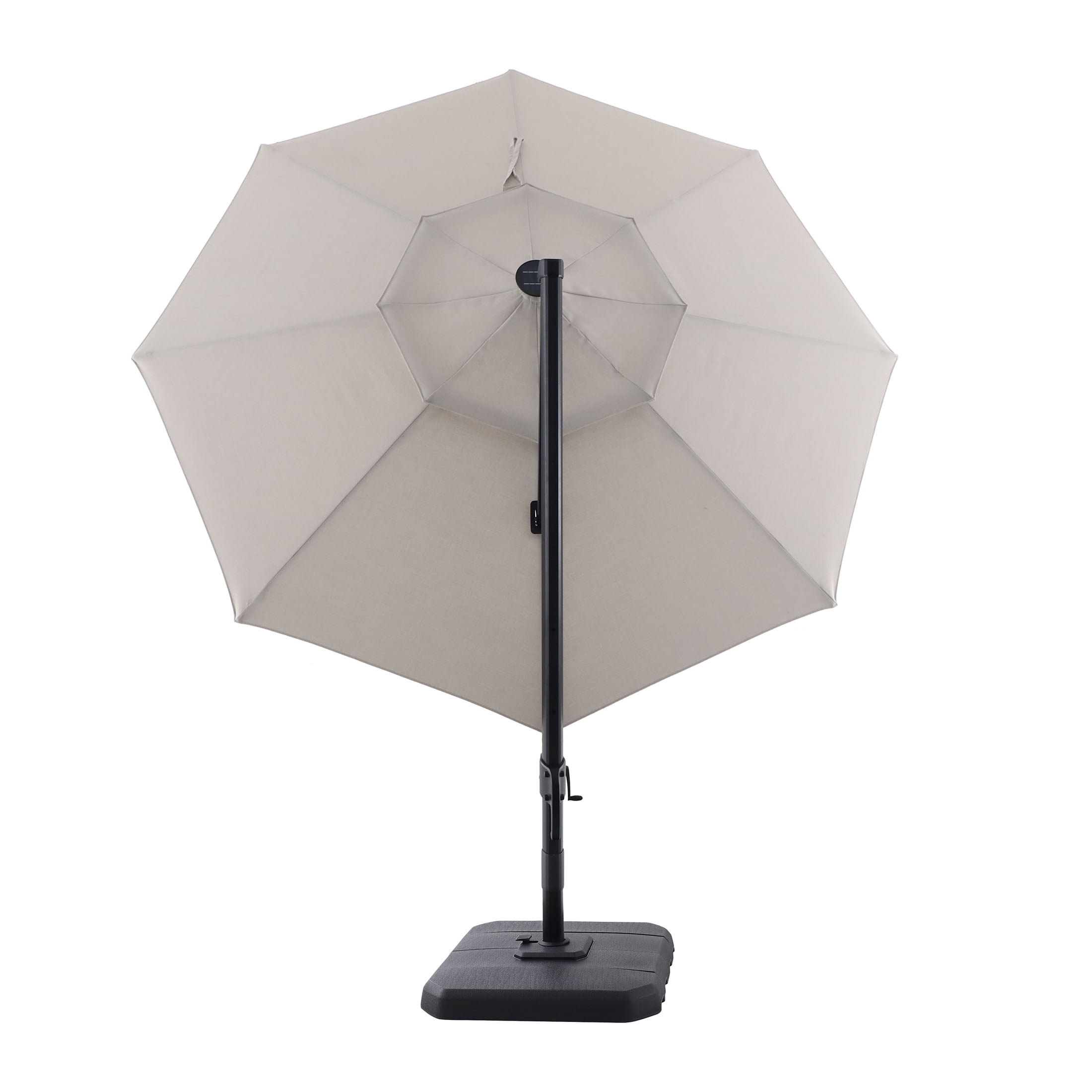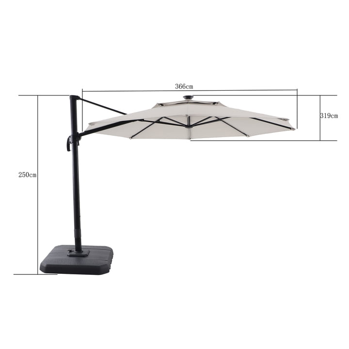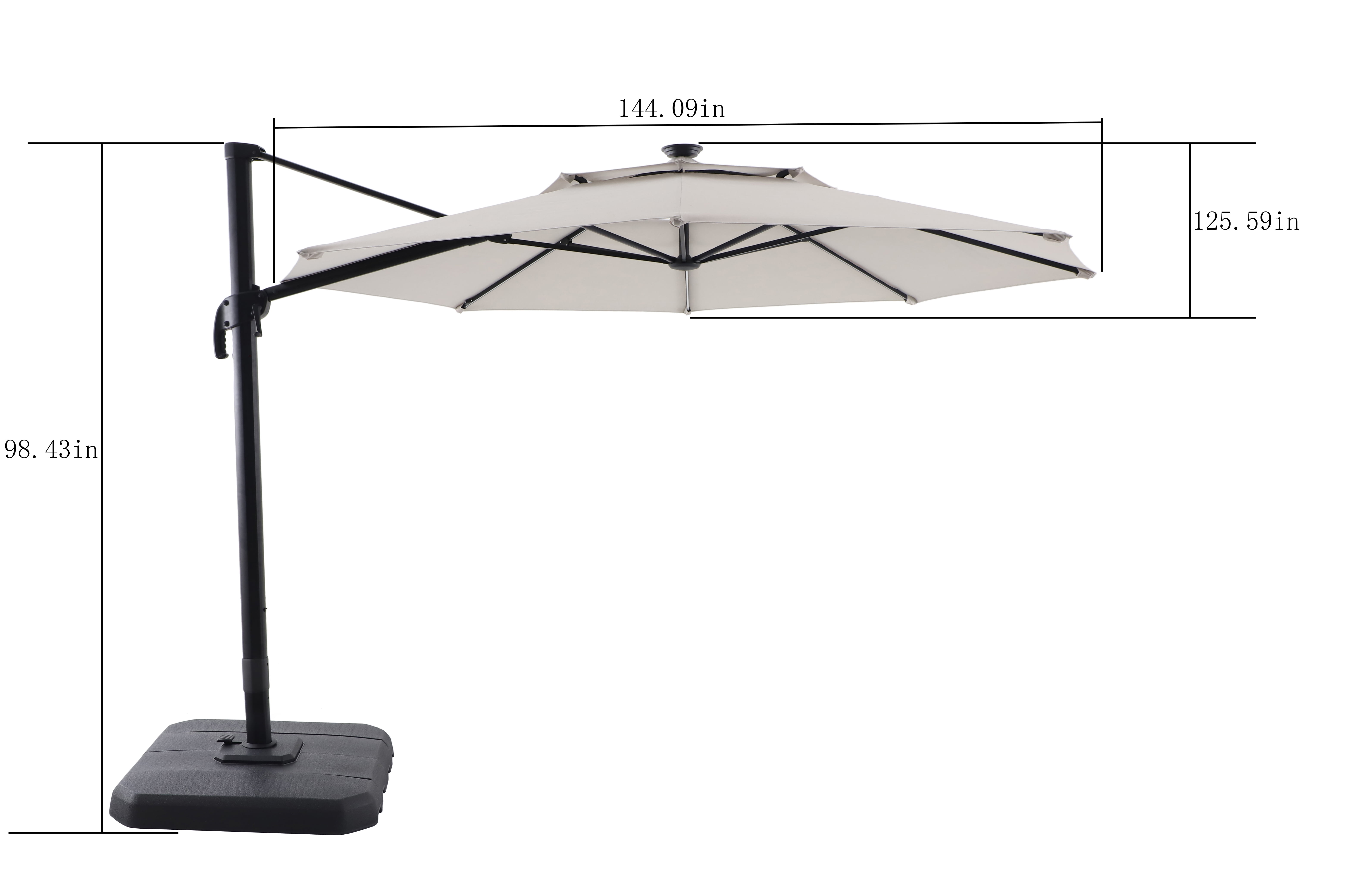 Comforting, long-lasting, offset, patio umbrella ideal for providing shade and protection from the elements for conversation, reading, or relaxing Features a black frame and weighted base, gray, all-season fabric, and an octagonal canopy with 360-degree rotation and tilting ability for maximum shade Includes warm, white, LED lights powered by solar panels and AC/DC adapter Designed for long-term use, rust resistance, and durability with powder-coated aluminum and steel construction and a weather-resistant, acrylic canopy Complements almost any other outdoor furniture and decor for years of comfort Materials: Aluminum, steel, acrylic Dimensions: 144.09″L x 125.59″W x 98.43″H Weight: 75 lbs Care: Before using, wipe product completely with soft, dry cloth; always store and/or cover patio furniture in a cool, dry place and away from direct sunlight when not in use