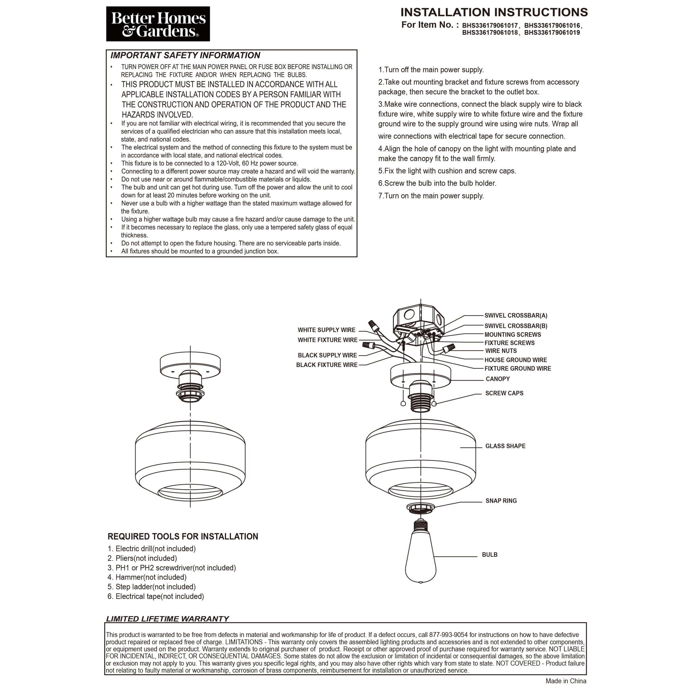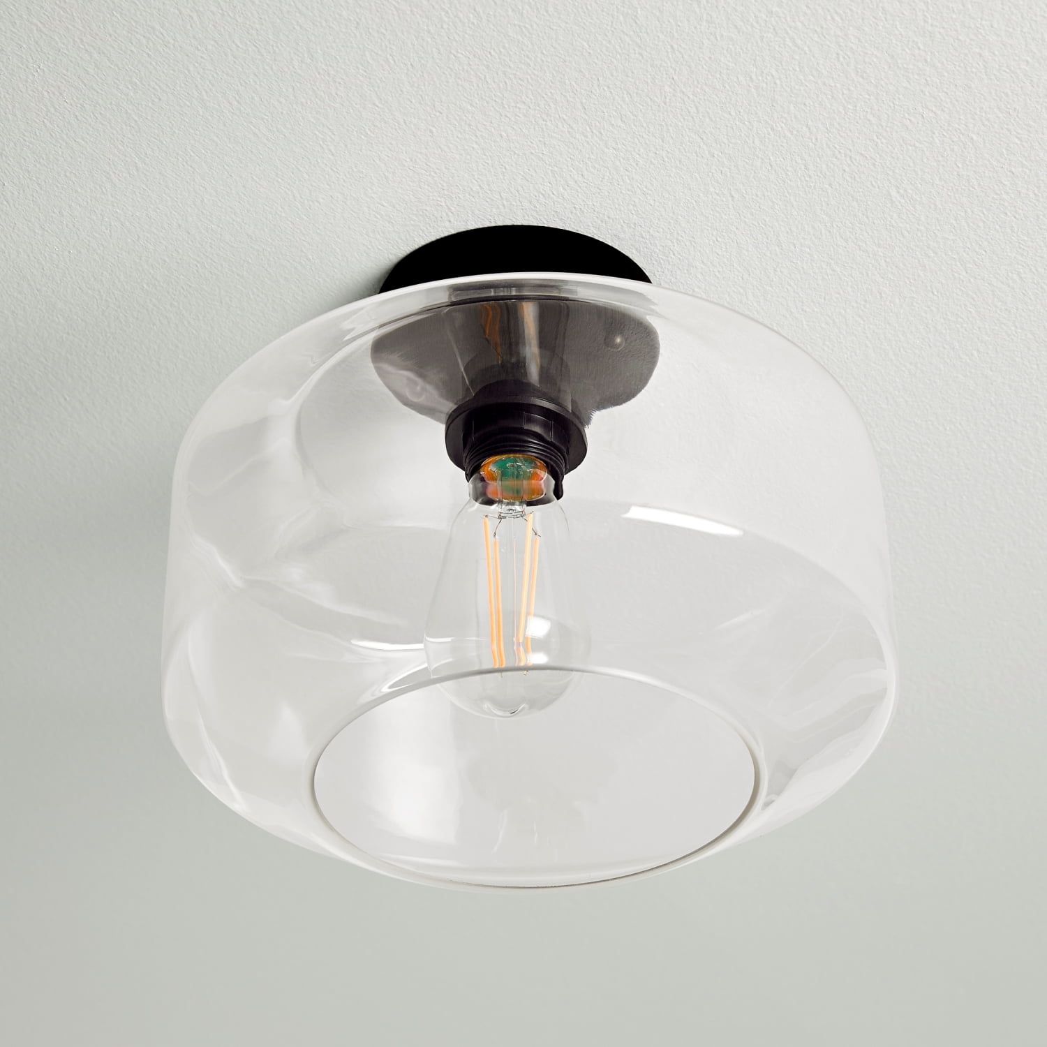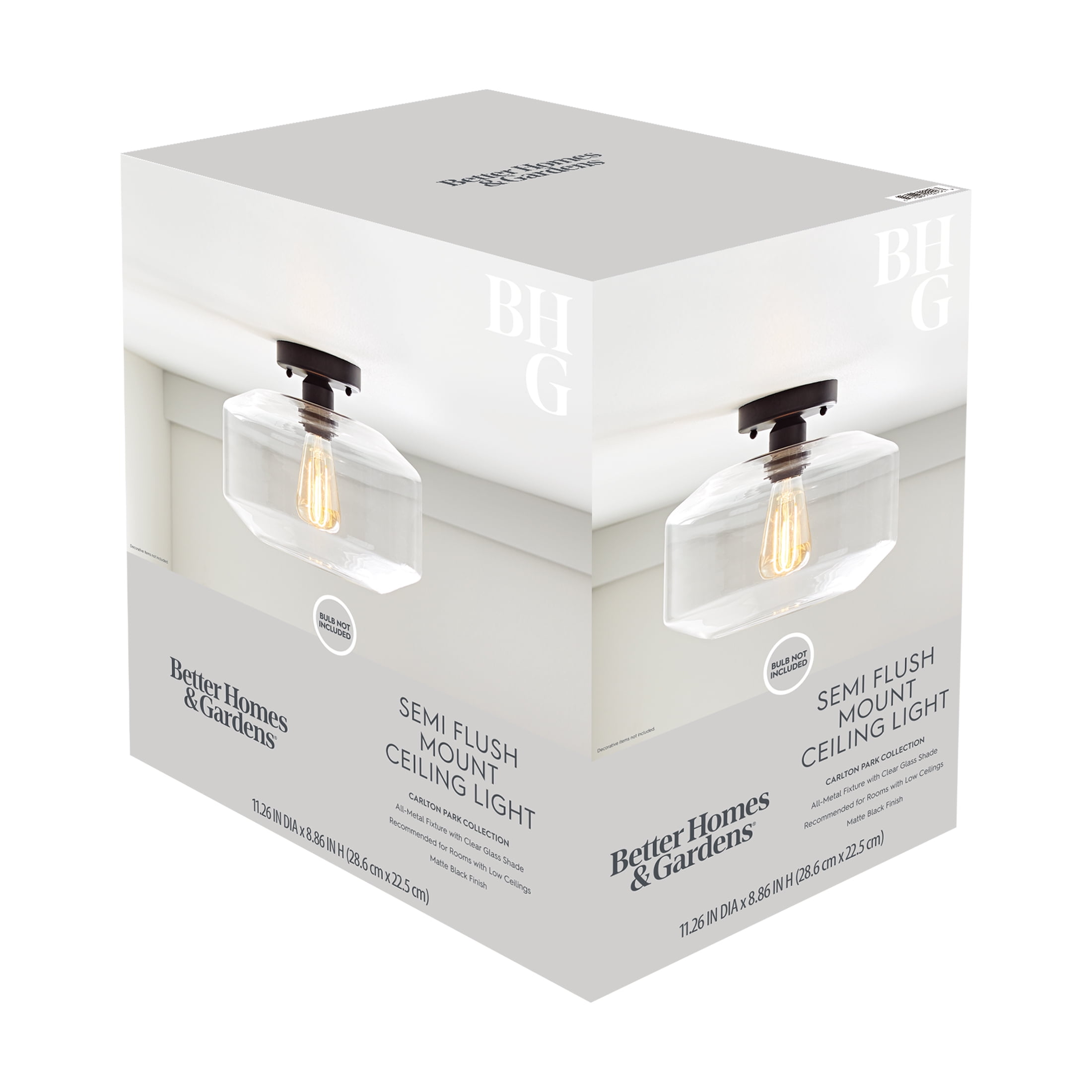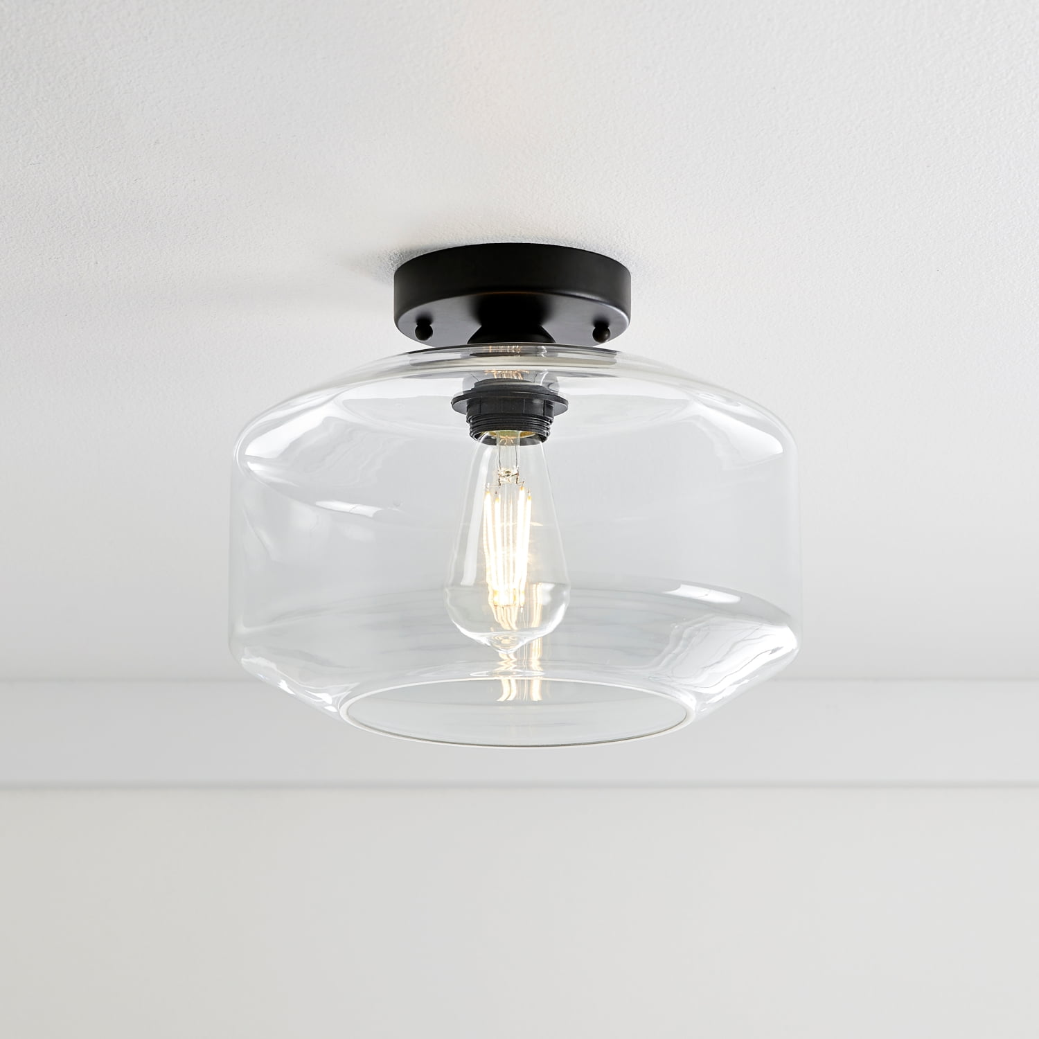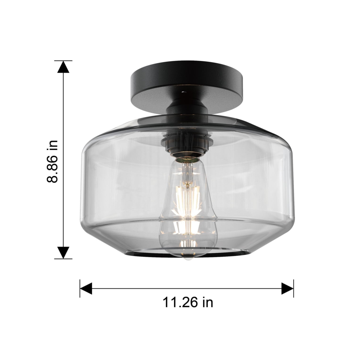 Better Homes & Gardens modern indoor clear glass ceiling light Matte Black Finish Classic design with one clear glass shade 5 years limited lifetime warranty for defects in material and workmanship ENERGY STAR® certified Size: 11.26×11.26×8.86IN Include 1 dimmable ST19 8.5W filament bulb Light output: 800 Lumen x 1 Color temperature: Soft white 2700K Estimated energy cost is $1.02 per year 15000H lifetime BHS336179061017