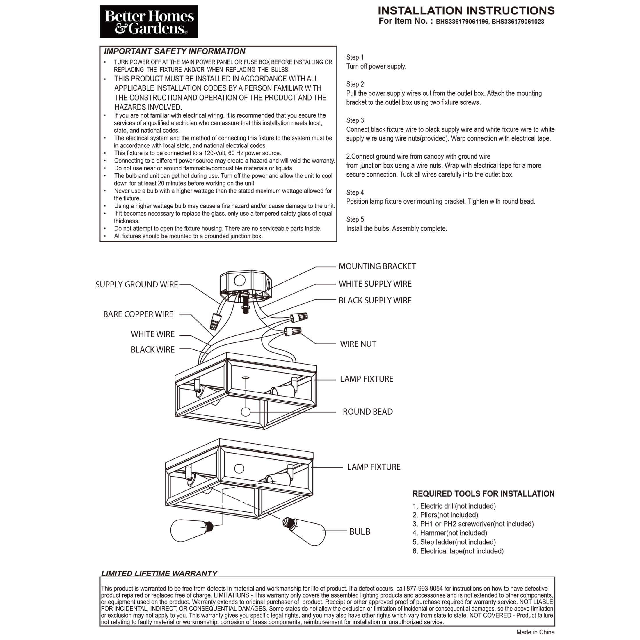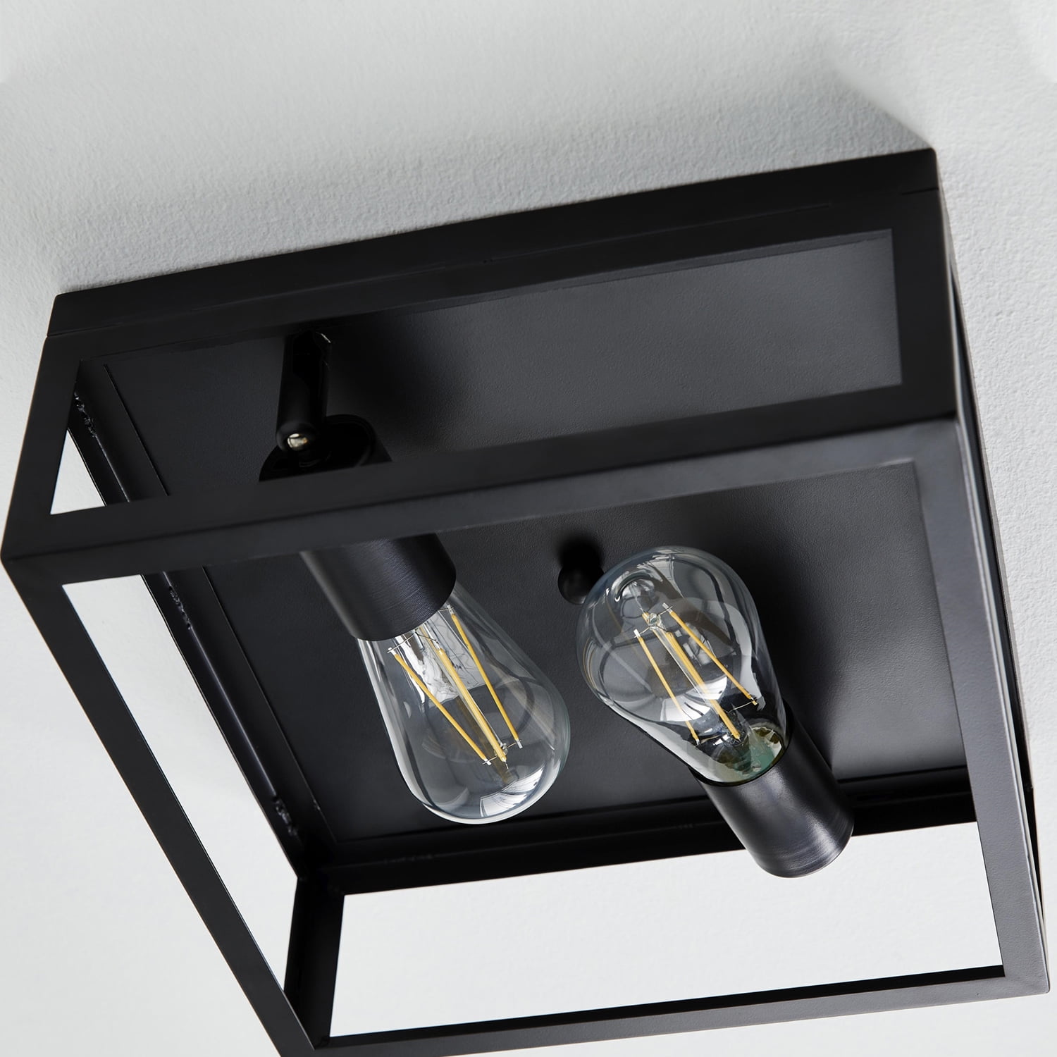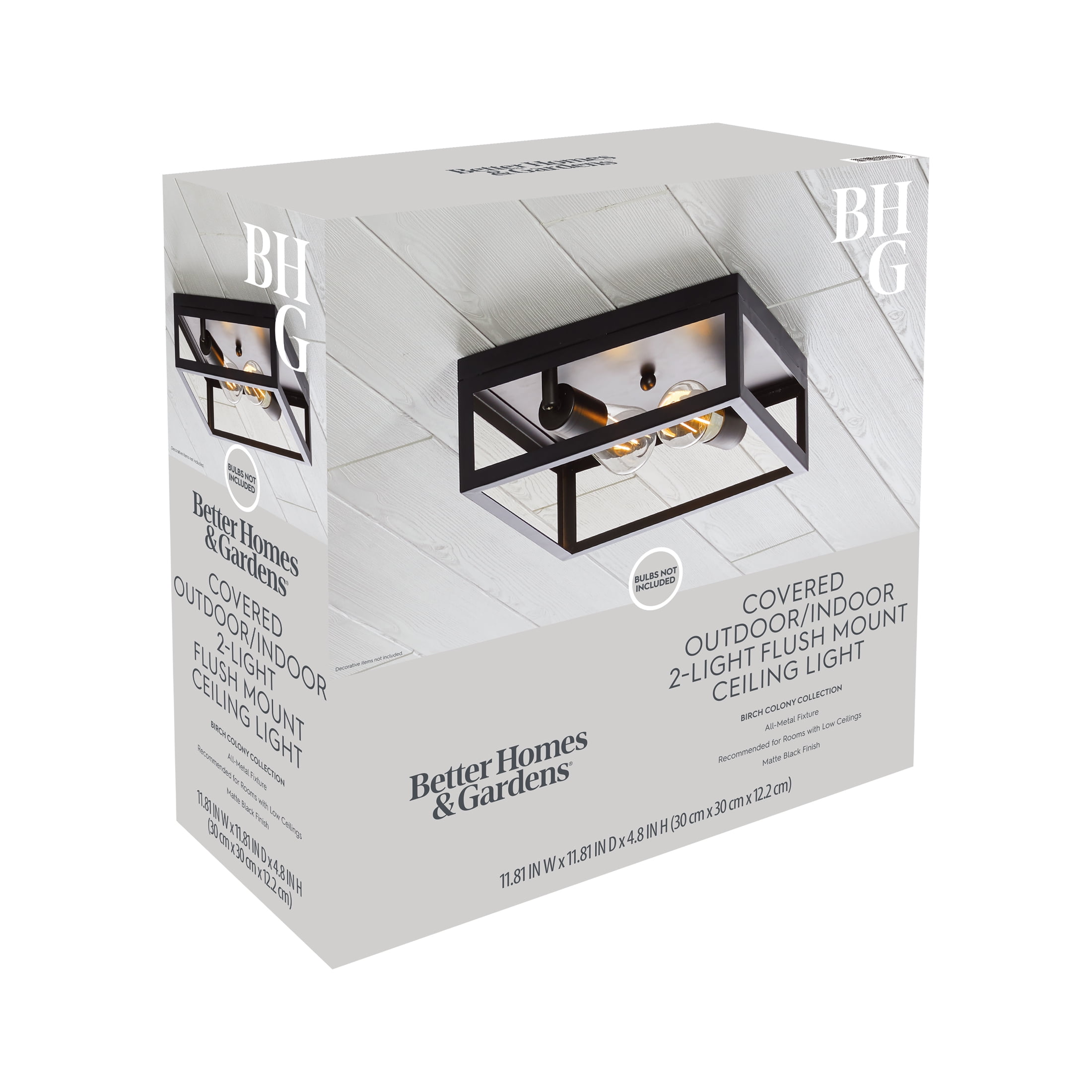Better Homes & Gardens Flush Mount Ceiling Light Modern style Matte black finish E26 base socketed, suitable for used with most E26 screw in base light bulbs (2) Edison bulbs are required (sold separately) Assembly dimensions: 11.81×11.81×4.8IN Model #BHS336179061023