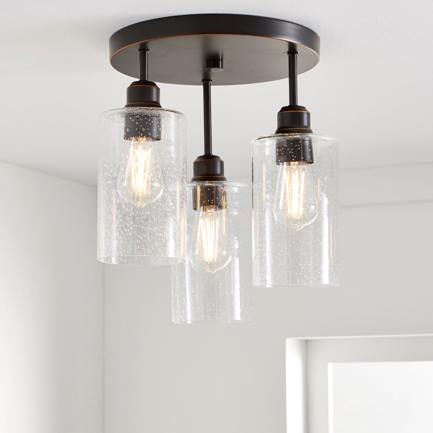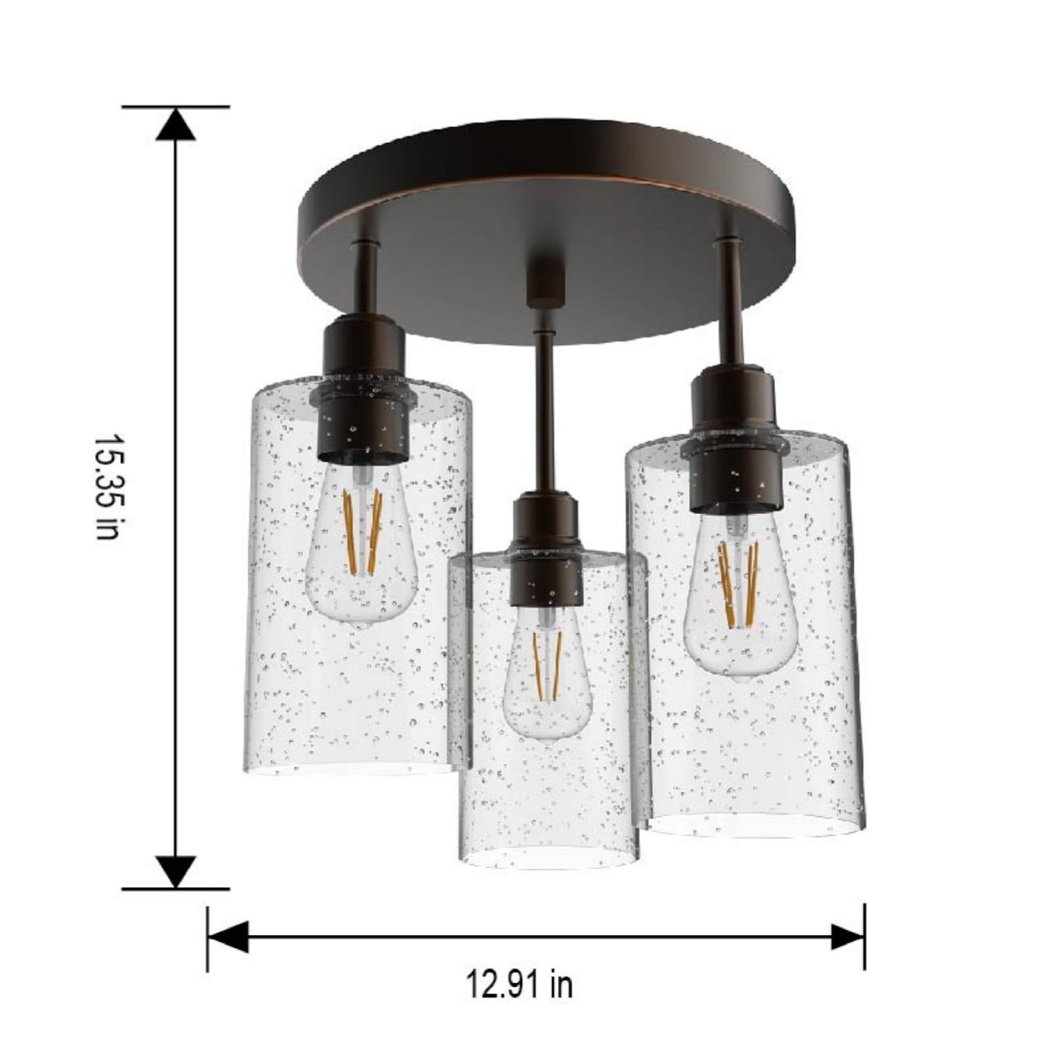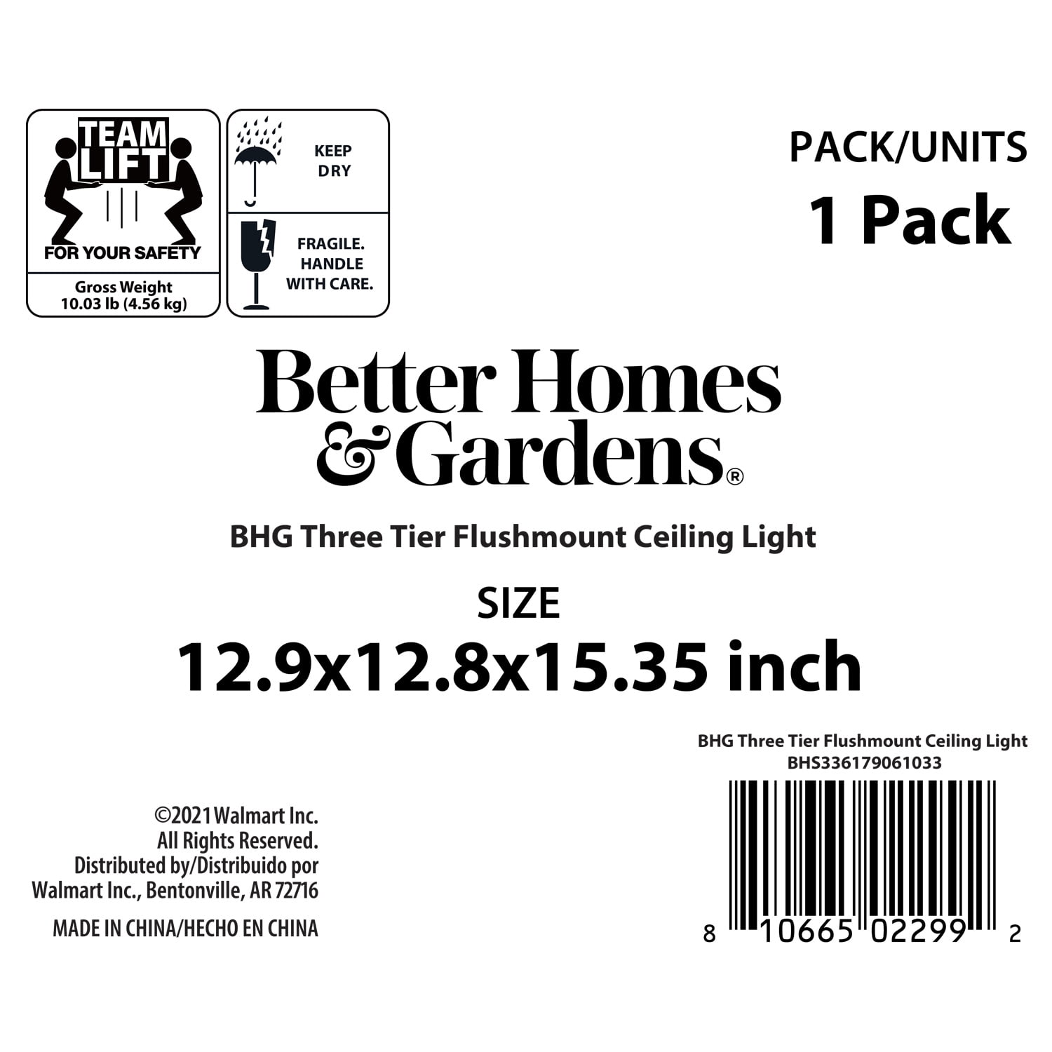 Better Homes & Gardens Three Tiers Flushmount Ceiling Light 3 Light Included Bronze Finish Classic design with three clear glasses and includes three 40W Equivalent ST19 filament bulbs 5 years limited life time warranty for defects in material and workmanship Size: 12.91×12.91×15.35IN ENERGY STAR® certified Light output: 450 Lumen x 3 Color temperature: Soft white 2700K