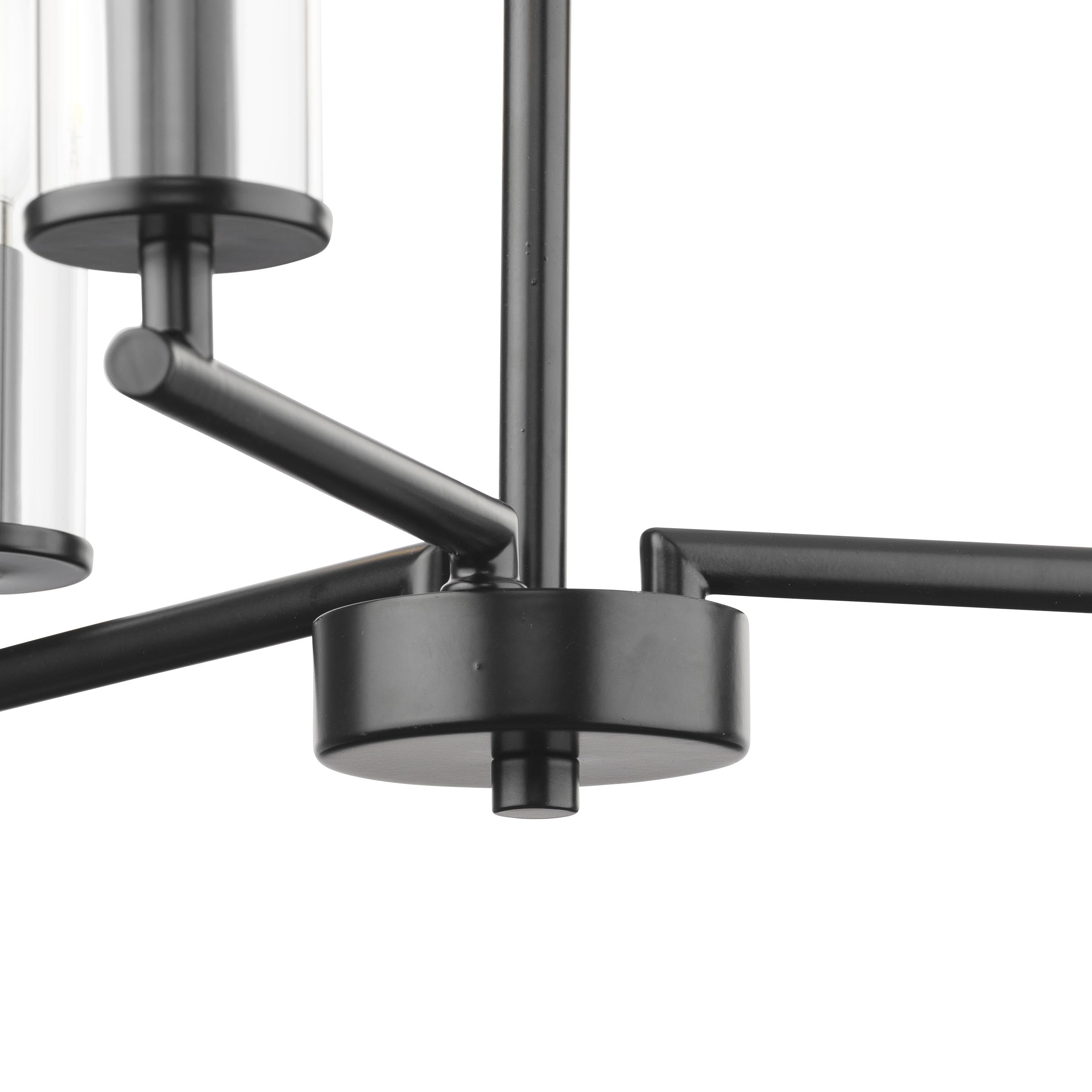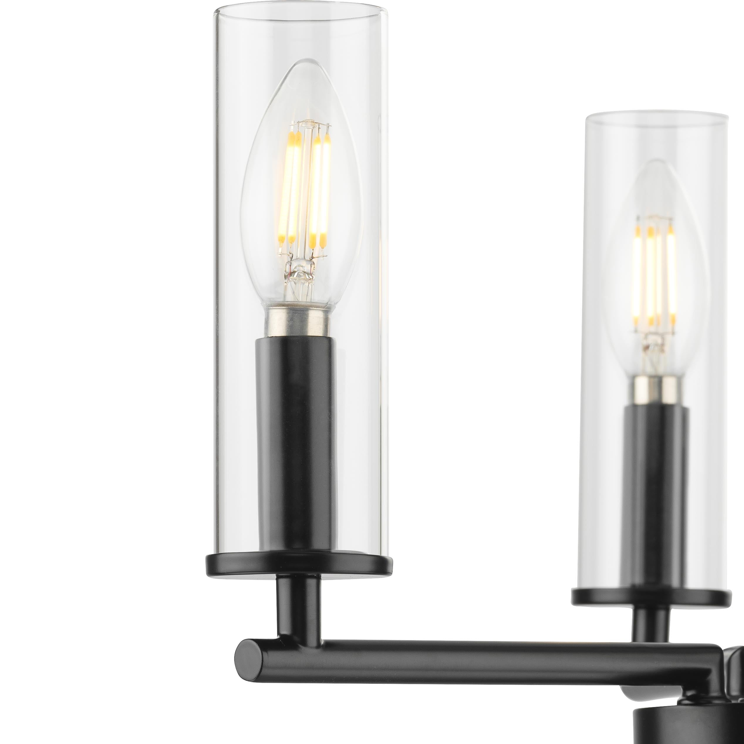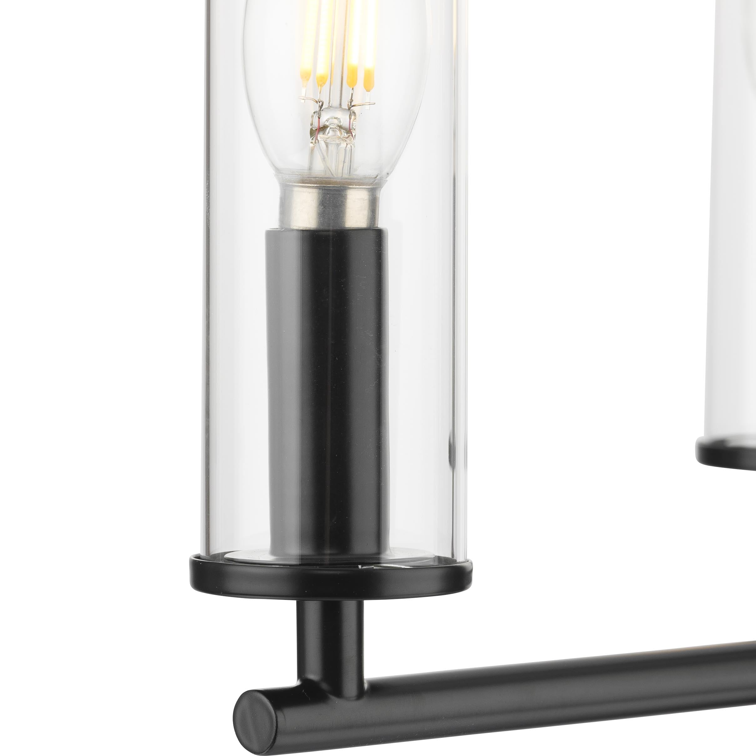 Features a sleek matte black finish, adding a touch of sophistication to a area such as a dining room Clear glass shades provide a modern and elegant look, while allowing the light to shine through for a radiant ambiance Hanging height of the chandelier can be easily adjusted to fit your space and desired aesthetic Boasts a contemporary style that will complement a variety of interior designs, adding a stylish touch to your home
