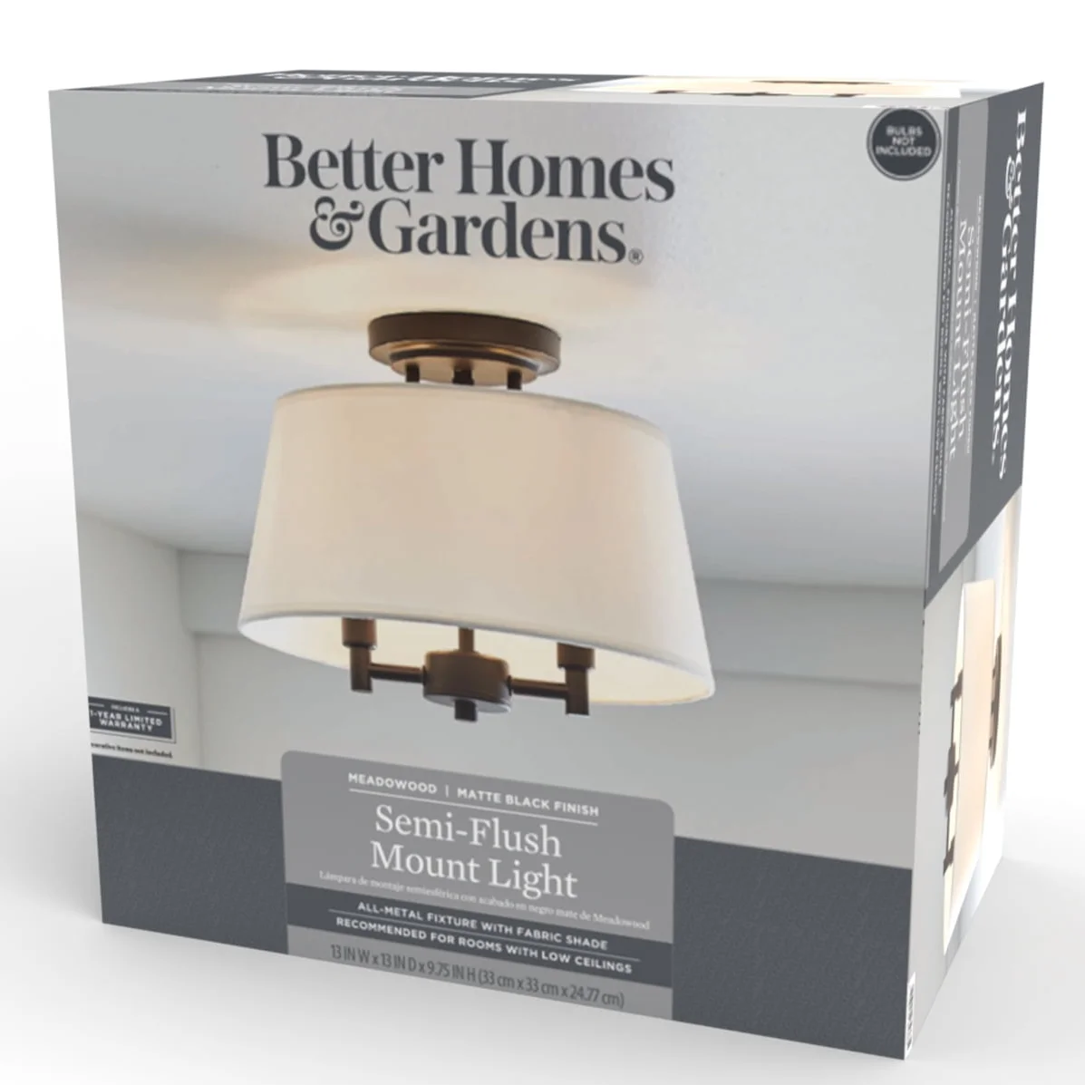 Better Homes & Gardens 2-Light Matte Black Indoor Flush Mount Light, Fabric Shade, Bulbs Included