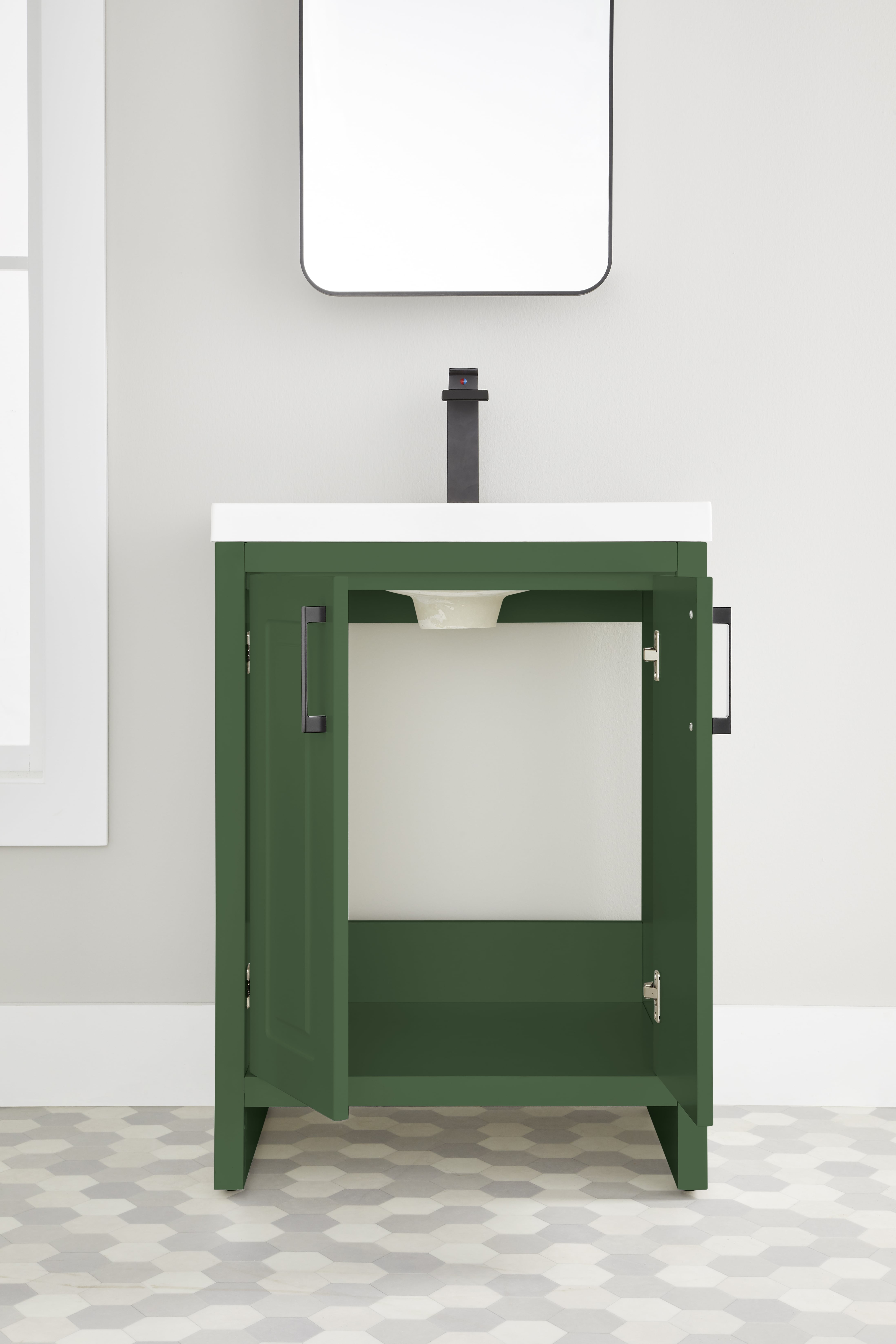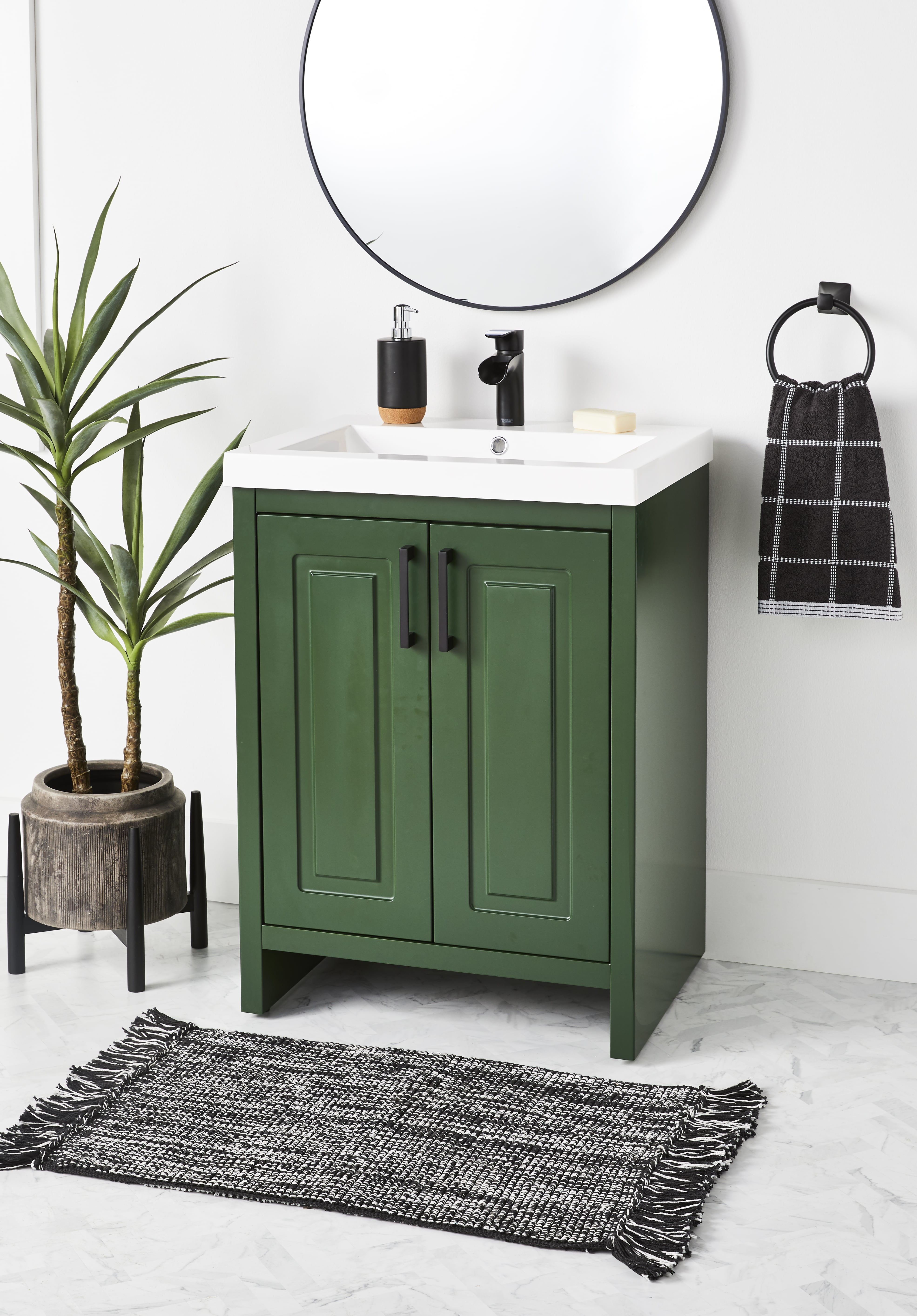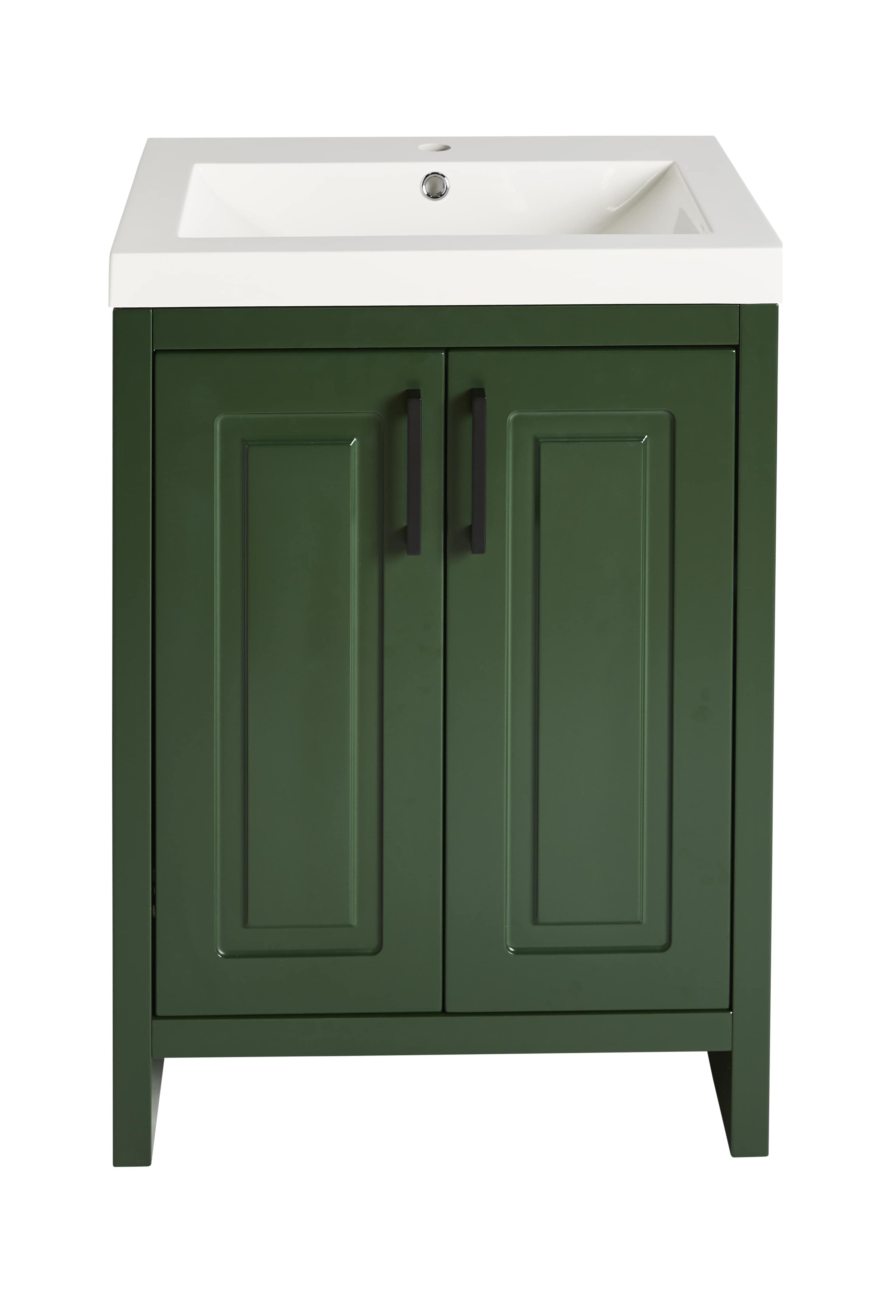 “Better Homes & Gardens 24.5 inch Single Sink Green Paint Bathroom Vanity Assembly Required Save Space and Enhance Your Bathroom’s Style with a Free-Standing Full-Length Single Sink Vanity (faucet and drain not included). When you’re ready to replace that old, tired-looking bathroom vanity with a fresh Better Homes & Gardens Full-Length Single Sink Vanity. Designed with a white resin sink, soft-close doors, plenty of storage space, and a free-standing shape that makes it easy to install these vanities are the perfect choice for people looking for a modern touch without sacrificing style or functionality.”