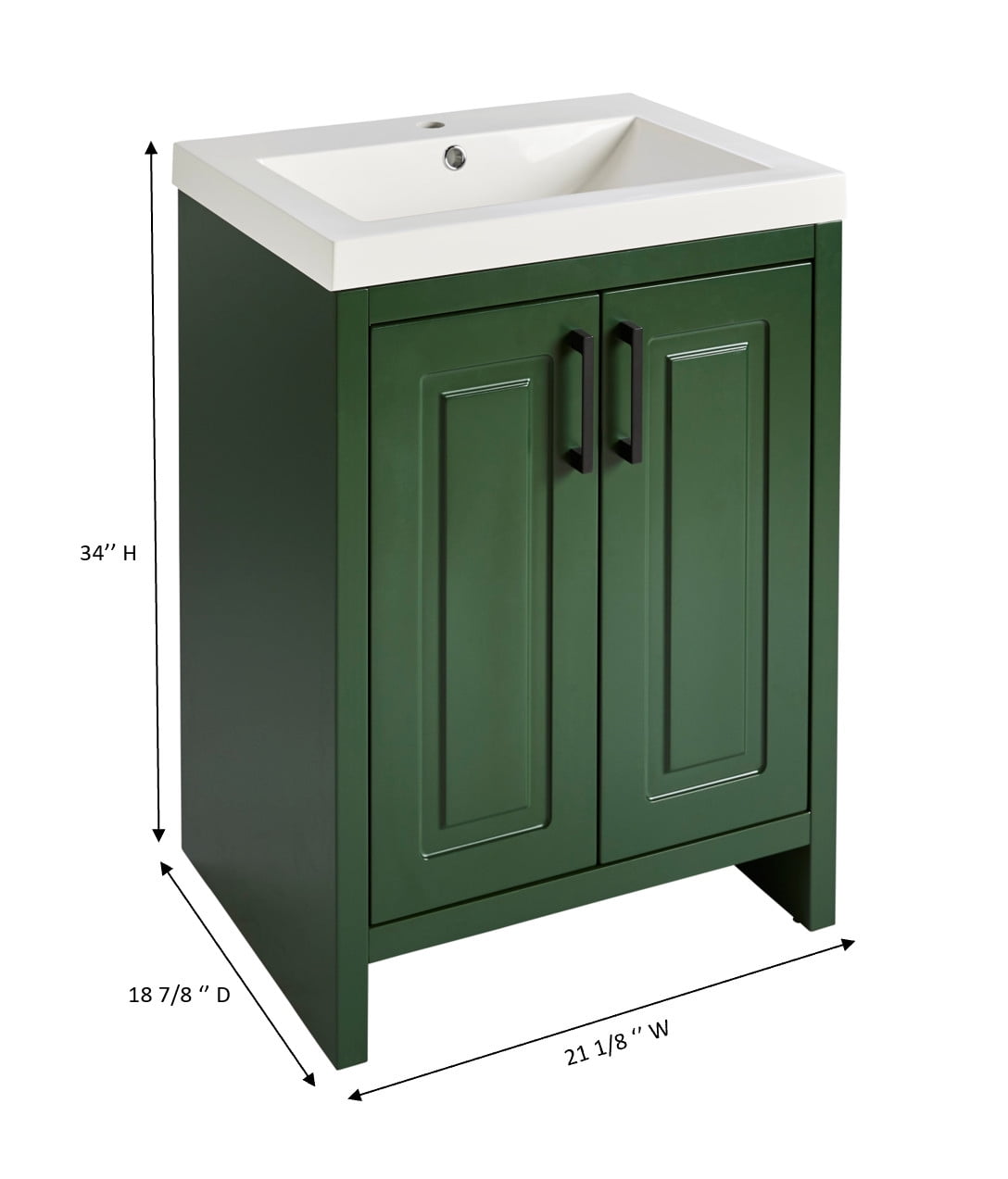 Better Homes&gardens Hi Vanity Cabinet Green painting with Sink (24 1/2” W x 18 7/8” D) At 24.49”L x 33.94”H x 18.9 ”W in size these sink vanities are easier to place as individual set pieces in a large master bathroom or standalone pieces in smart, more compact guest bathrooms where space is a necessity. Great for homes or apartments! Made of MFC MDF One (1) predrilled faucet hole. Sink Dimensions: 24.49 inches Front to Back x 18.9 inches Wide x 4.5 inches Deep Does not include faucet and drain