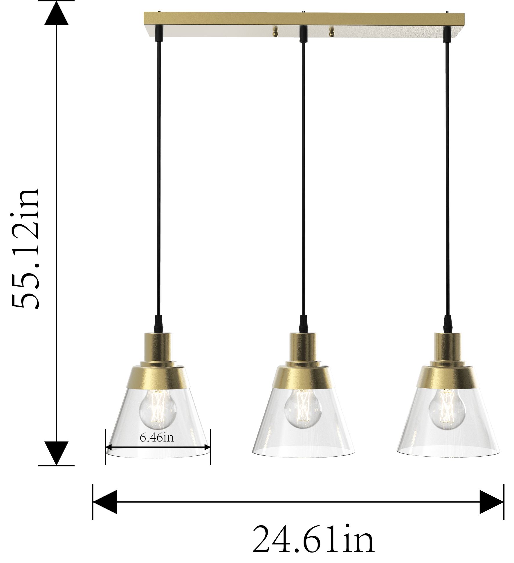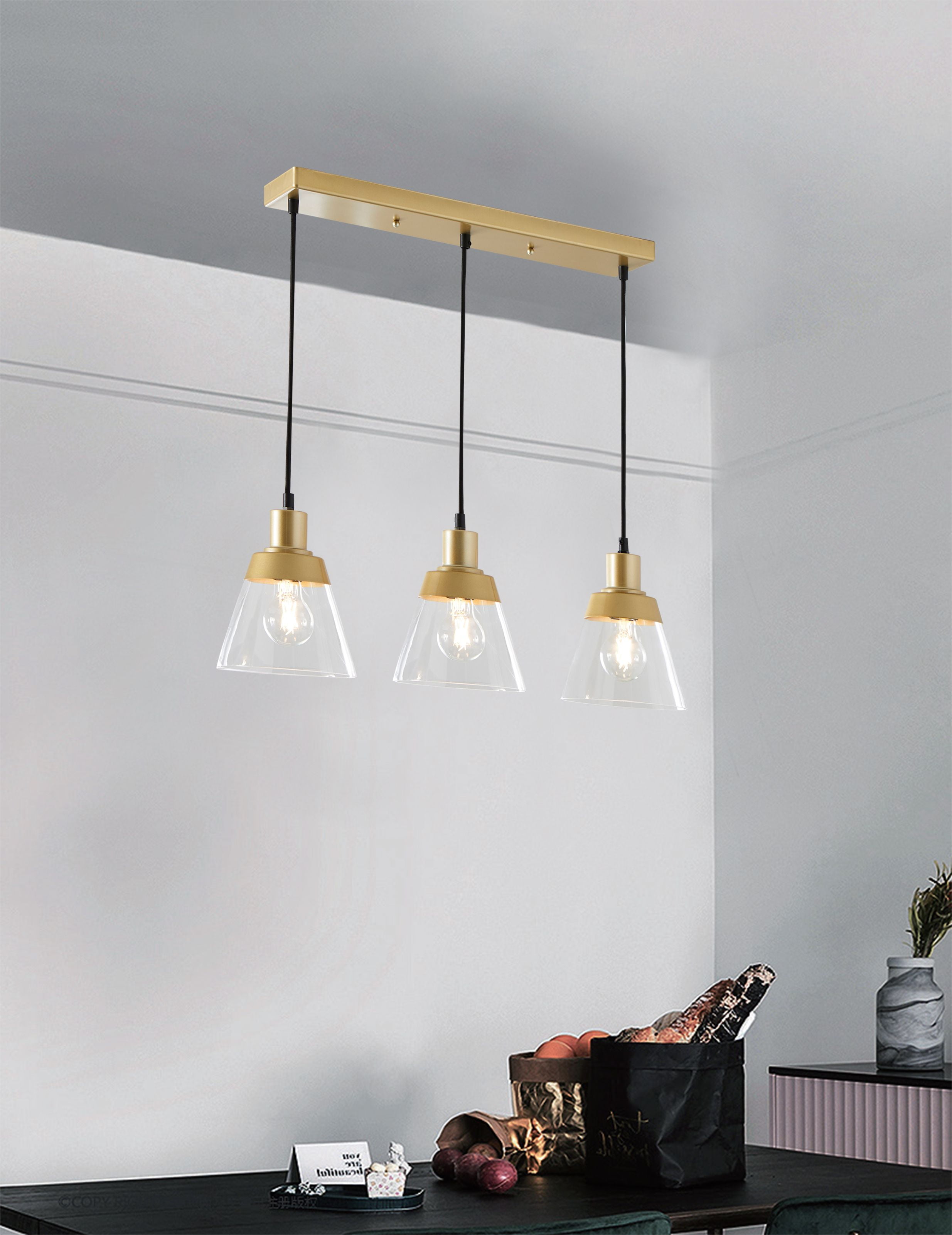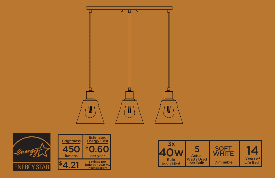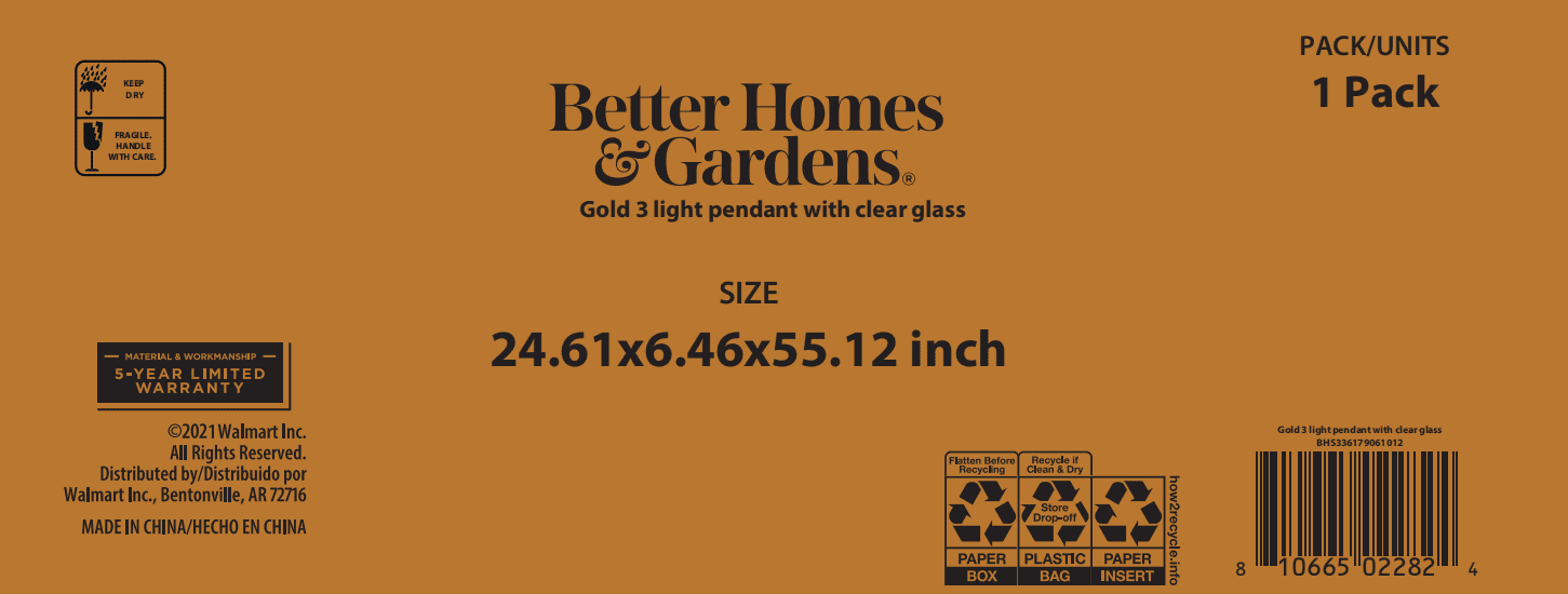 Better Homes & Gardens 3-Lights clear glass Pendent Light, 3 Bulbs Included Burnished Brass Finish Classic design with three clear glass shades and includes three 40W Equivalent A19 filament bulbs 5 years limited lifetime warranty for defects in material and workmanship Size: 24.61×6.46×55.12IN Hardwired and ceiling mount Includes 3 Dimmable A19 5W filament Light bulbs E26 base Light output: 450 Lumens x 3 Color temperature: Soft white 2700K