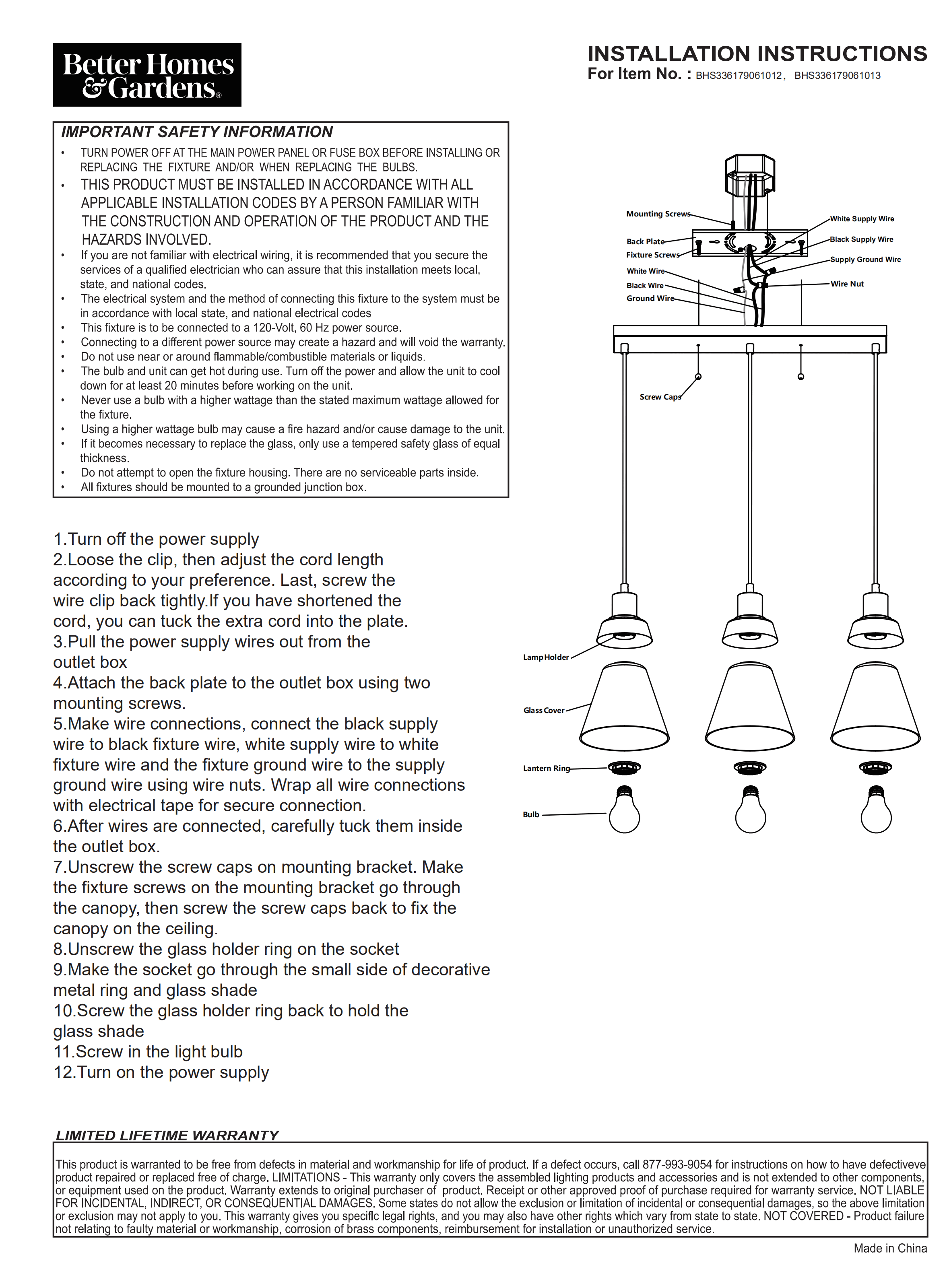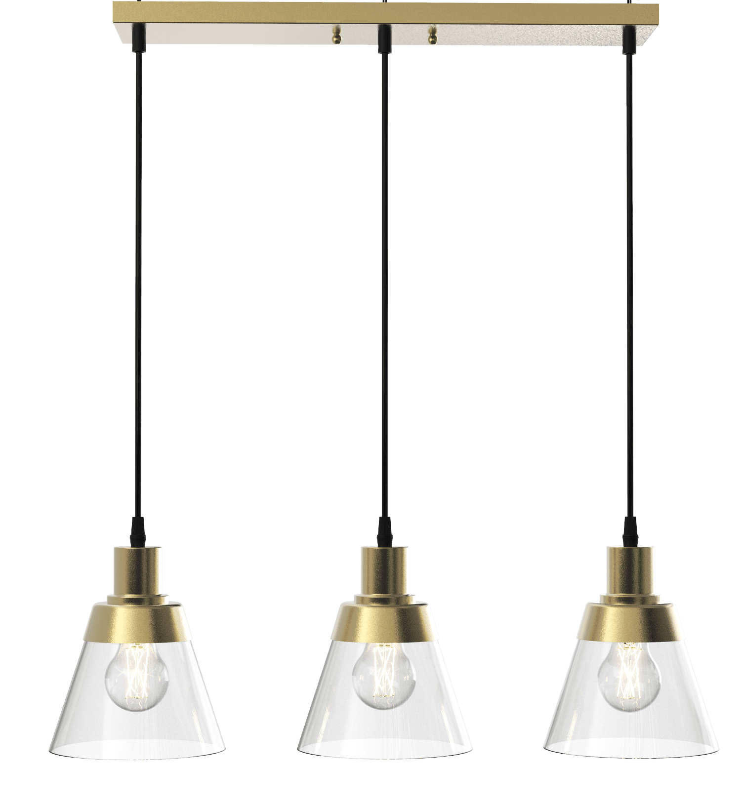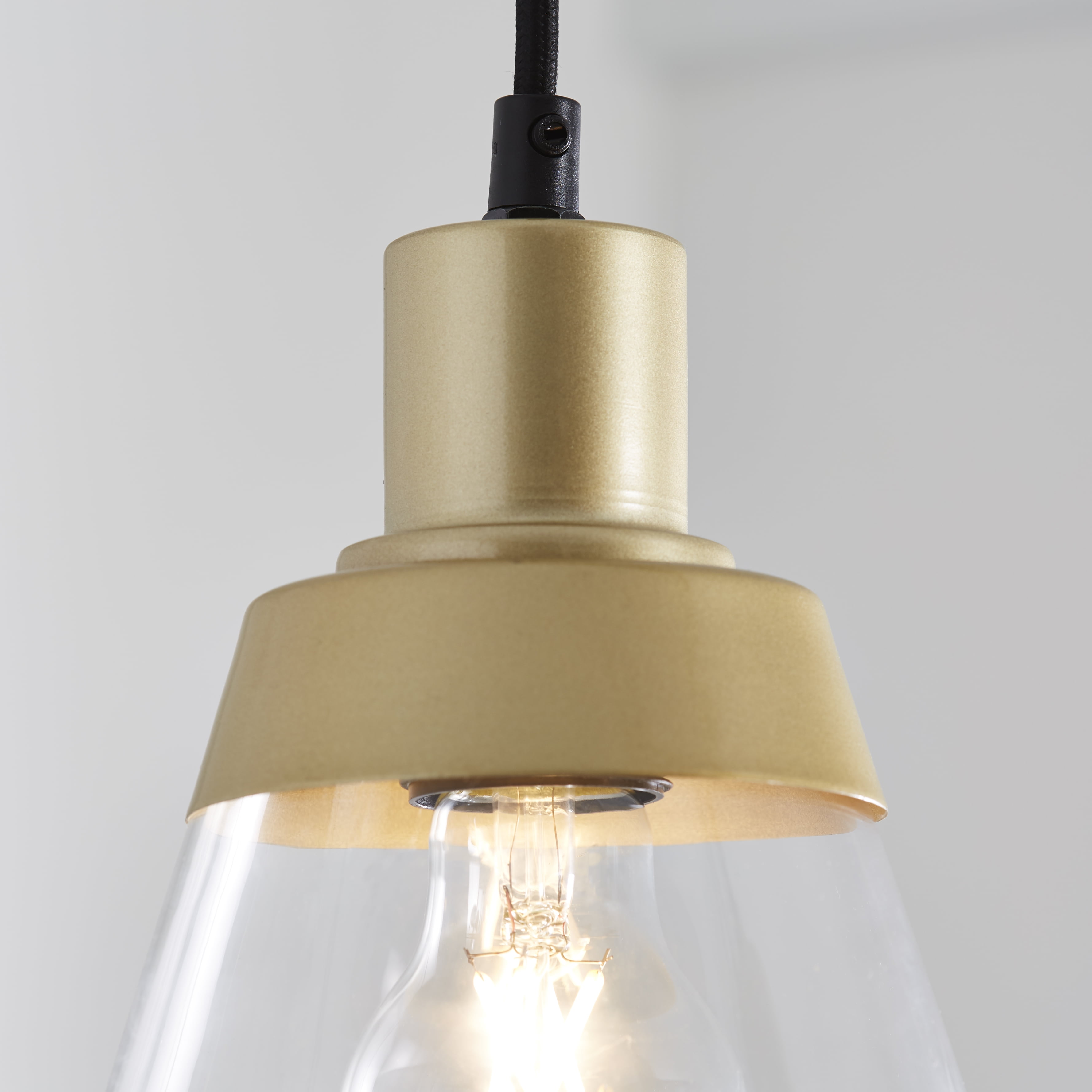 Better Homes & Gardens 3-Lights clear glass Pendent Light, 3 Bulbs Included Burnished Brass Finish Classic design with three clear glass shades and includes three 40W Equivalent A19 filament bulbs 5 years limited lifetime warranty for defects in material and workmanship Size: 24.61×6.46×55.12IN Hardwired and ceiling mount Includes 3 Dimmable A19 5W filament Light bulbs E26 base Light output: 450 Lumens x 3 Color temperature: Soft white 2700K