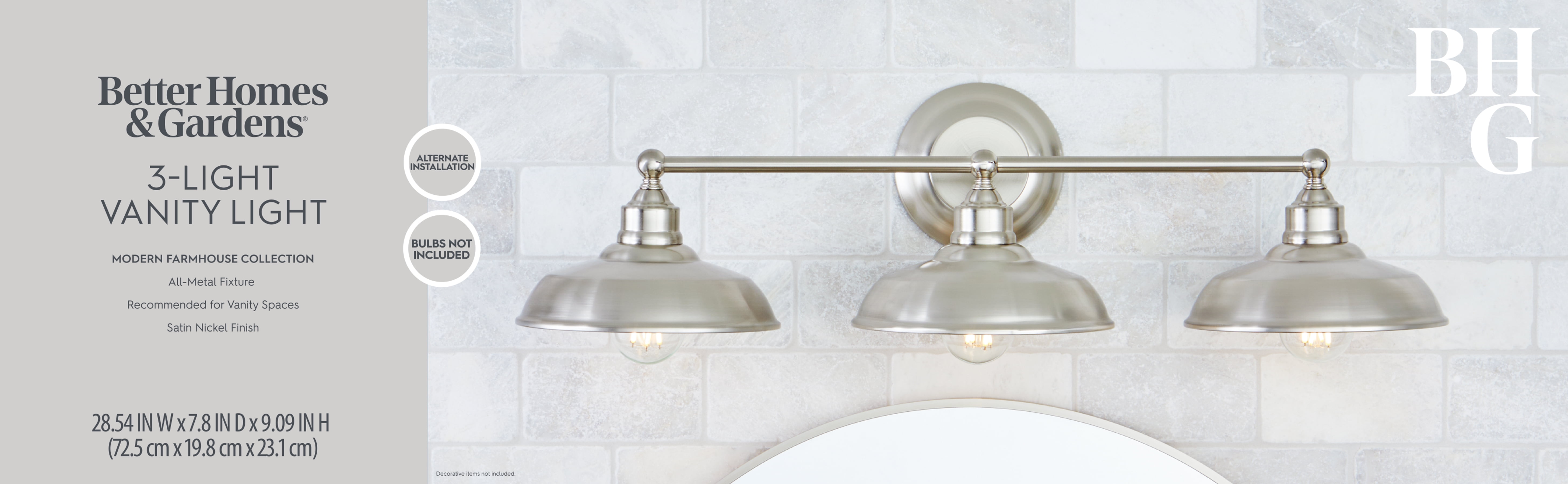 Better Homes & Gardens Vanity Light/Wall Scone Finish Color: Satin Nickel Style: Farmhouse Material: Metal E26 Sockets: Compatible with standard E26 bulbs (not included), making it easy to customize your lighting. No Shades Included: Embrace the minimalist look or add your own shades for a personalized touch. Dimensions: 28.5 inches wide (approx.) Power type: 120V Hardwire Installation: Easy to mount on most standard junction boxes Model #BHS336179061231