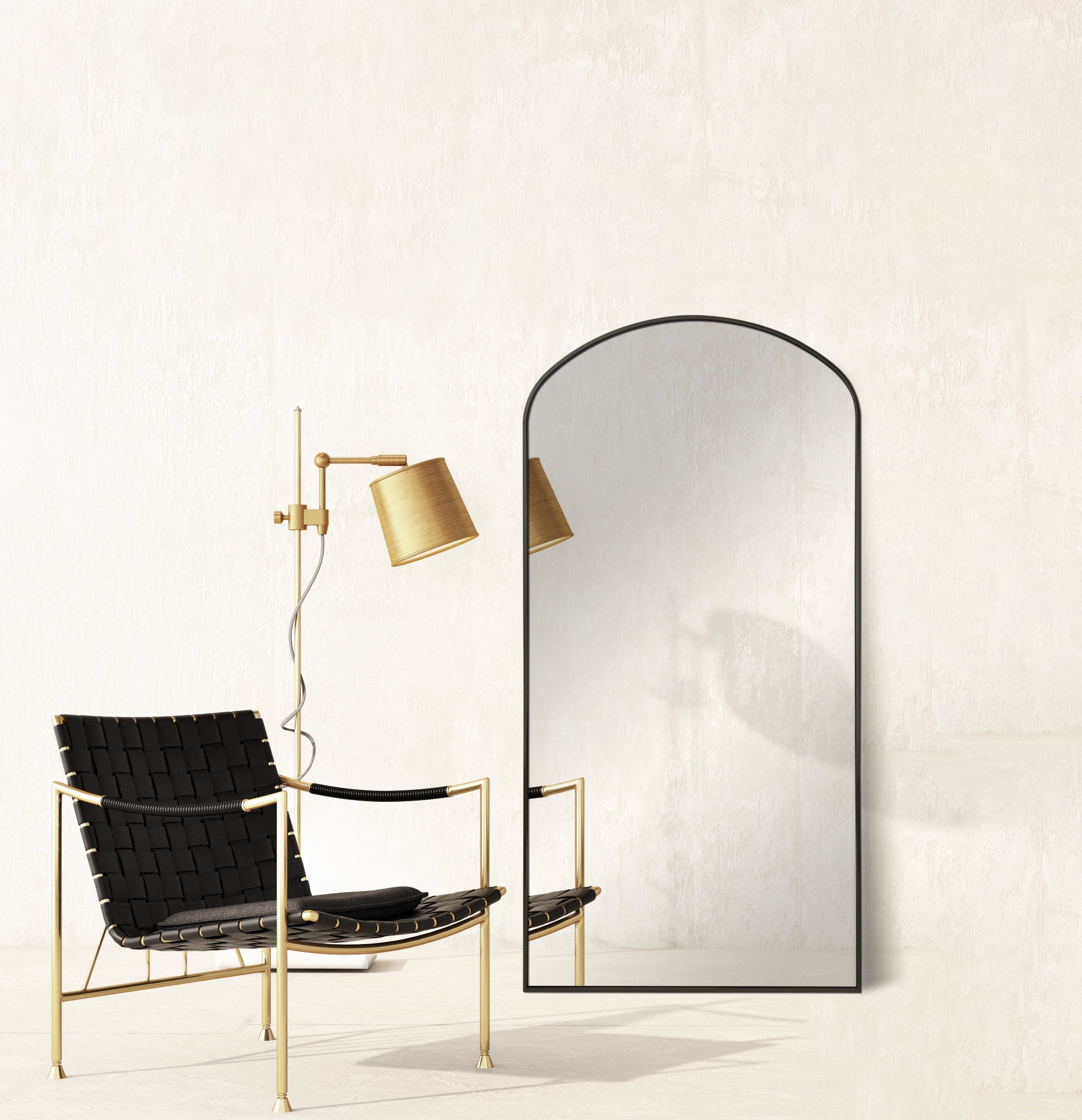 The top of this wide and large floor mirror is designed with a unique smooth arched-top aluminum frame, which especially attracts people’s attention and highlights the beauty and relevant design of the mirror. home shows and in prevailing décor mirrors. This full-length Mirror measures 30” wide by 60” high outside dimensions. It can be leaned and includes an anti-tip kit. It also can be hung on a wall vertically with the robust metal hanging hardware that is attached. The back is covered with a full composite wood sheet for strength and rigidity. It works most beautifully in foyers, entryways, bedrooms, dressing rooms, large walk-in closets, and living rooms. But also lends itself wonderfully to bathrooms because of its aluminum frame which has an inherent anti-rust quality.