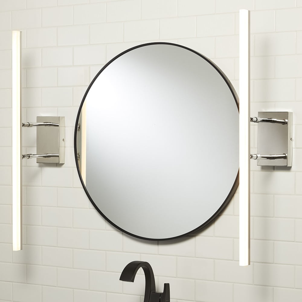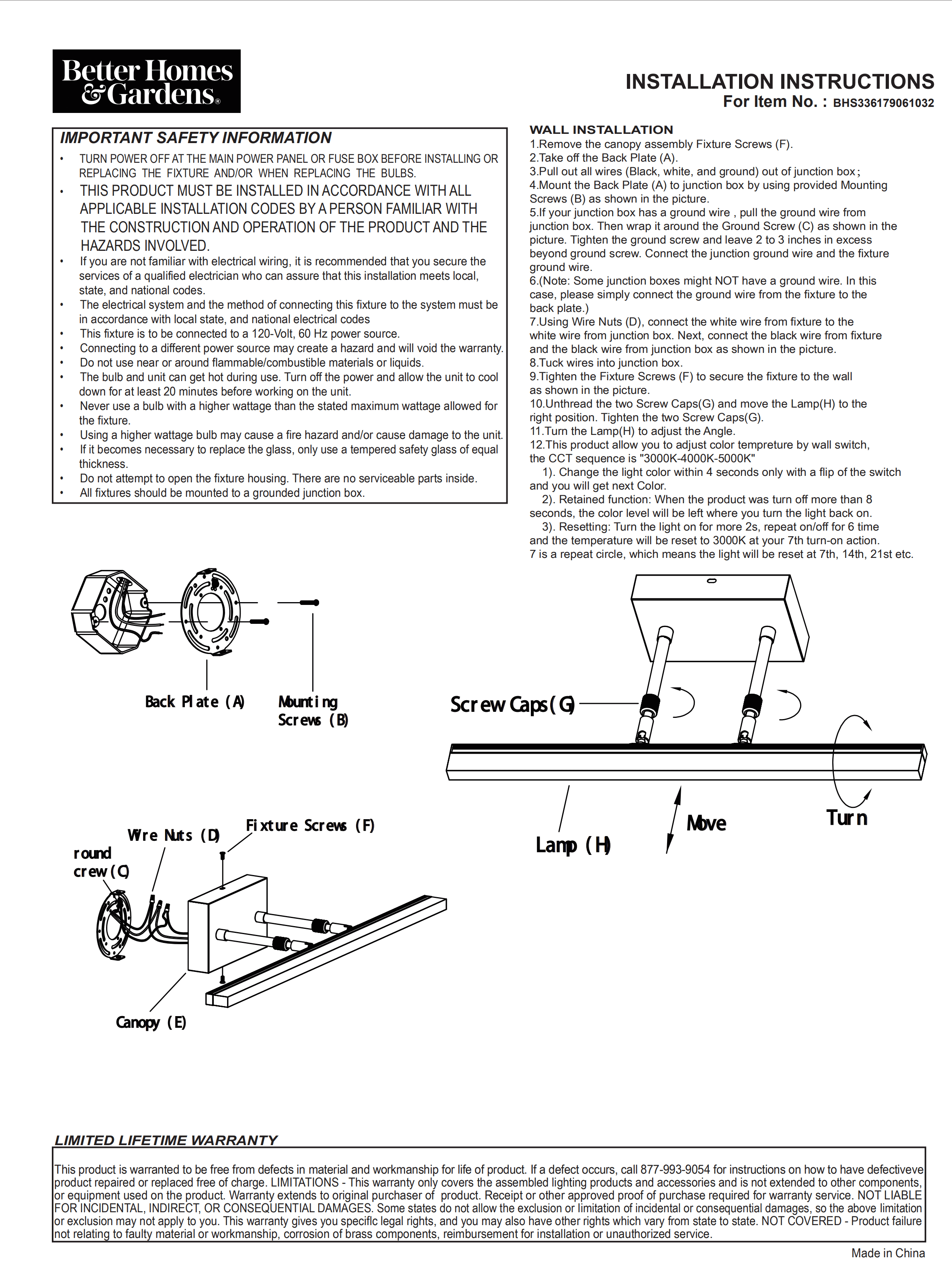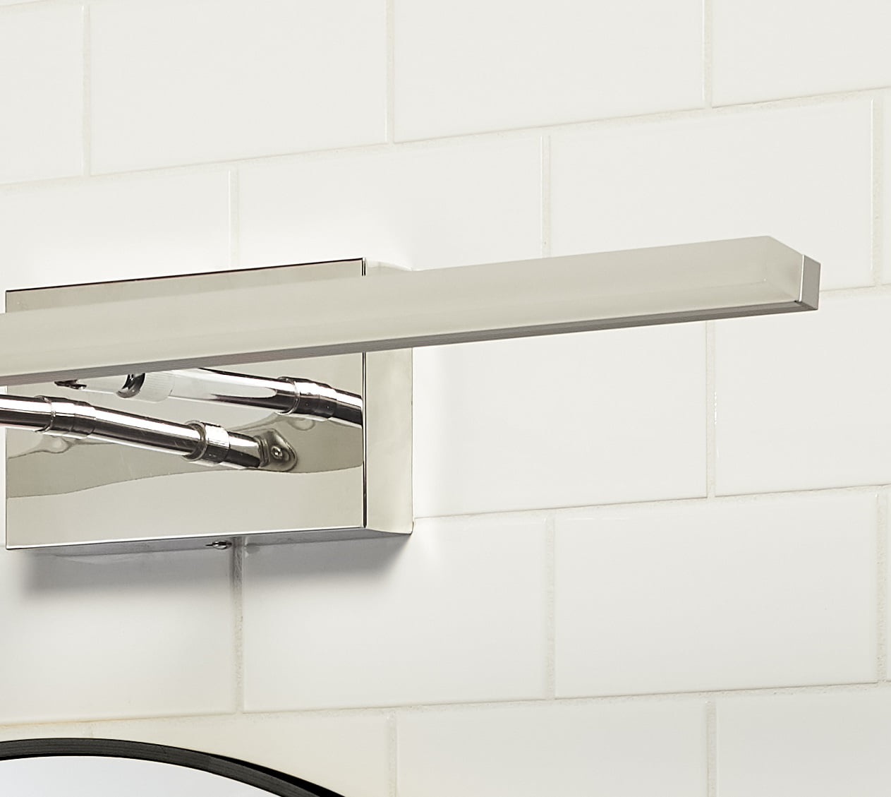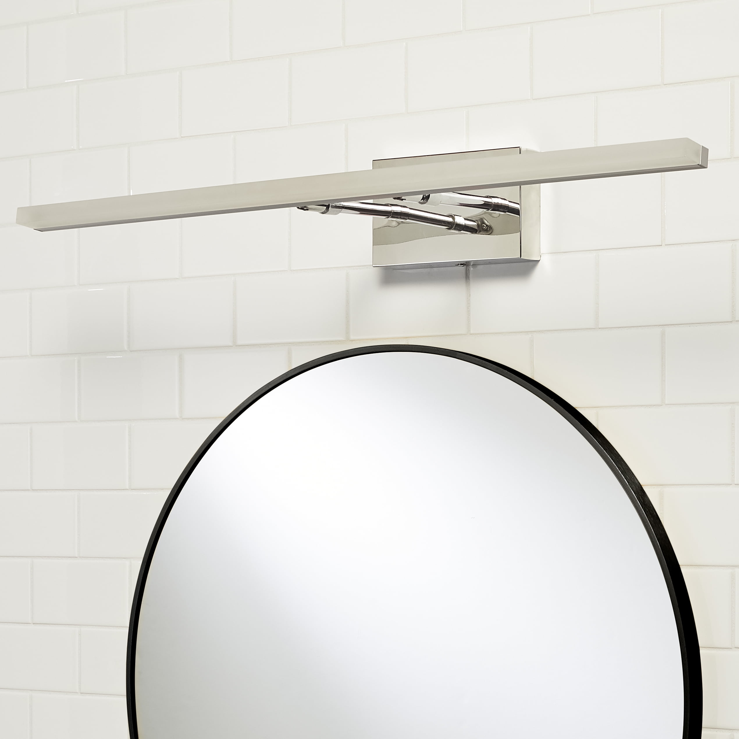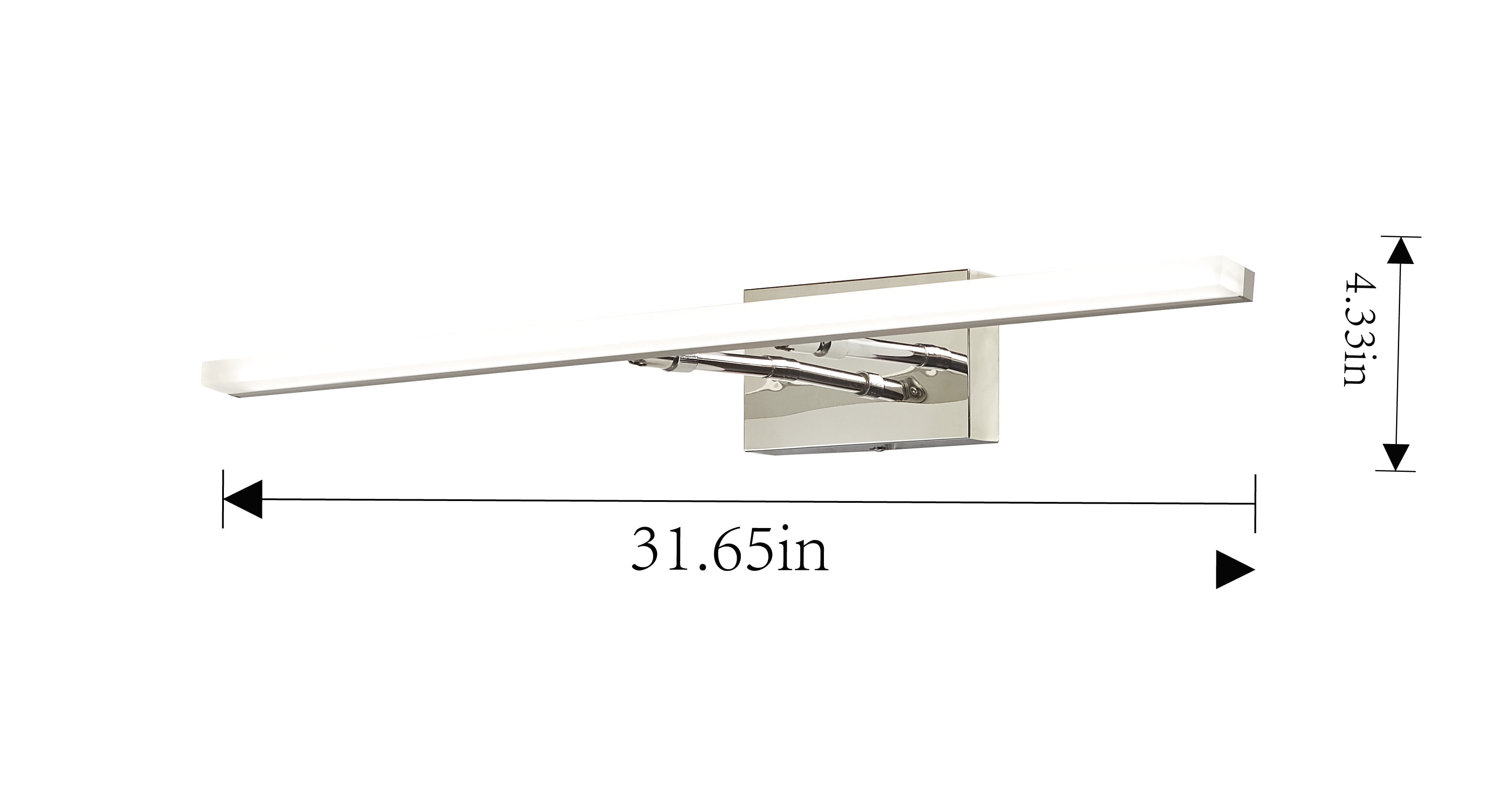 Better Homes & Gardens Integrated LED Light Bar Style: Modern Finish: Chrome Wattage: 15 Watts Dimensions: 31.65″ Wide; Adjustable depth: 9.45 – 12.2 inches Mounting: Wall Mount Power Type: 120V Hardwired Light Output: 1,100 Lumens Selectable Color Temperatures: 3000K / 4000K / 5000K Estimated Energy Cost: $1.81 per year (based on 3 hours per day, 11¢/kWh; cost depends on rates and use) Lifespan: 50,000 hours