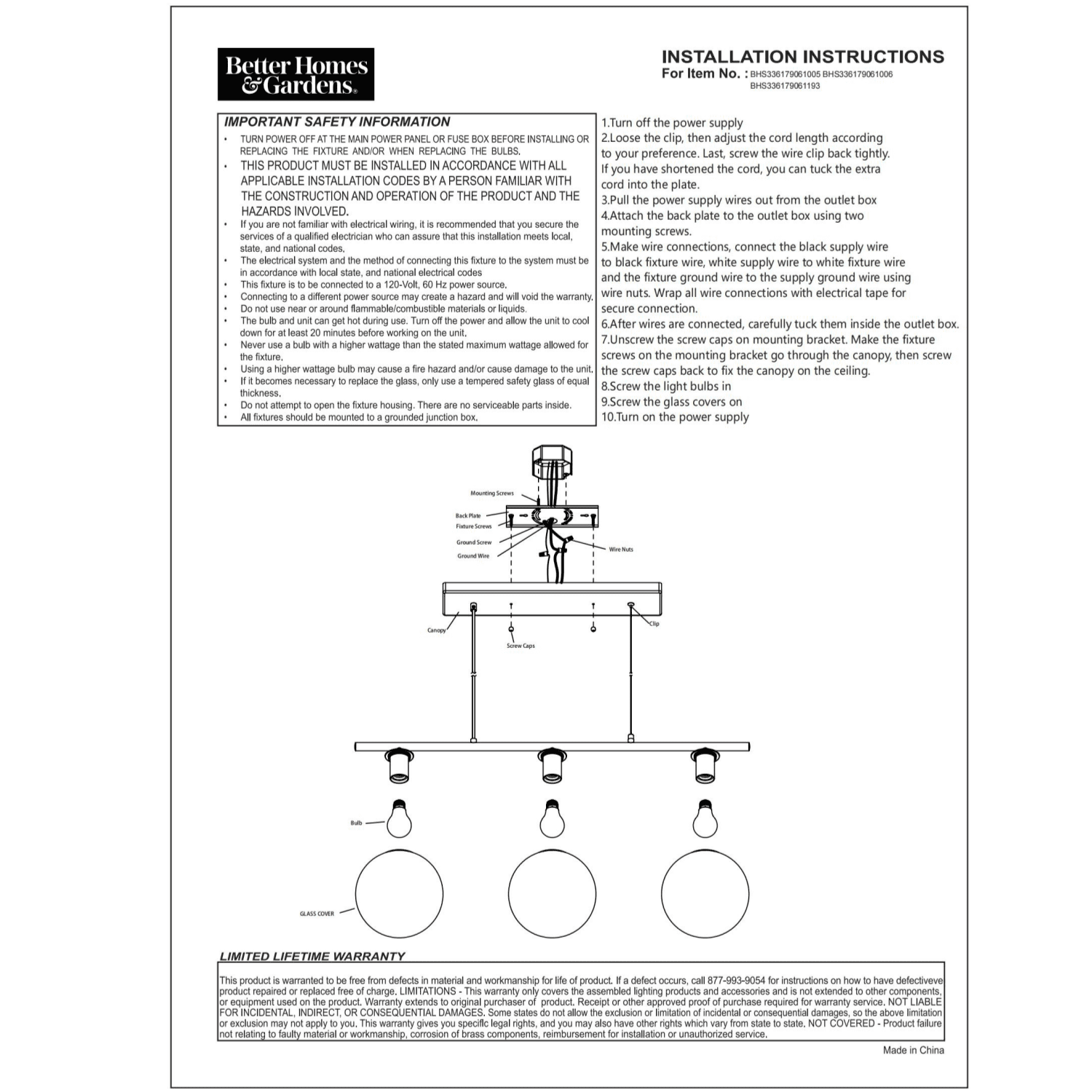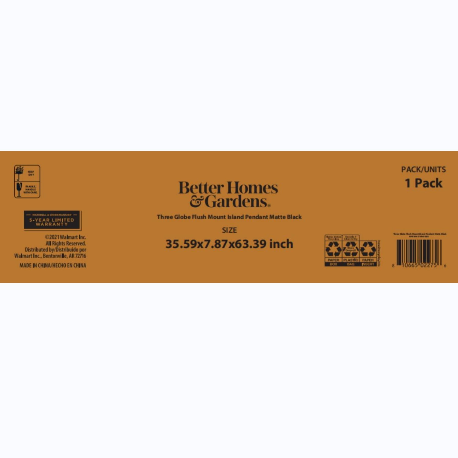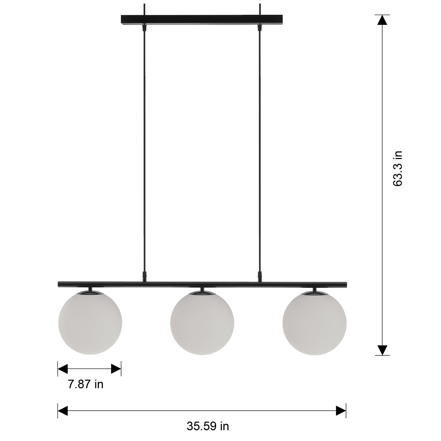 Better Homes & Gardens modern industrial globe frosted pendant with matte black cords and flush mounted A15 LED bulbs, E26 medium base Dimmable 2700K soft white light, 450 lumen brightness Wattage: 5W / 40W Equivalent $0.6 per year energy cost for 3hrs of daily use, 13yrs of service life Dimensions: 35.59×7.87×63.39IN ENERGY STAR certified 5 years limited lifetime warranty for defects in material and workmanship