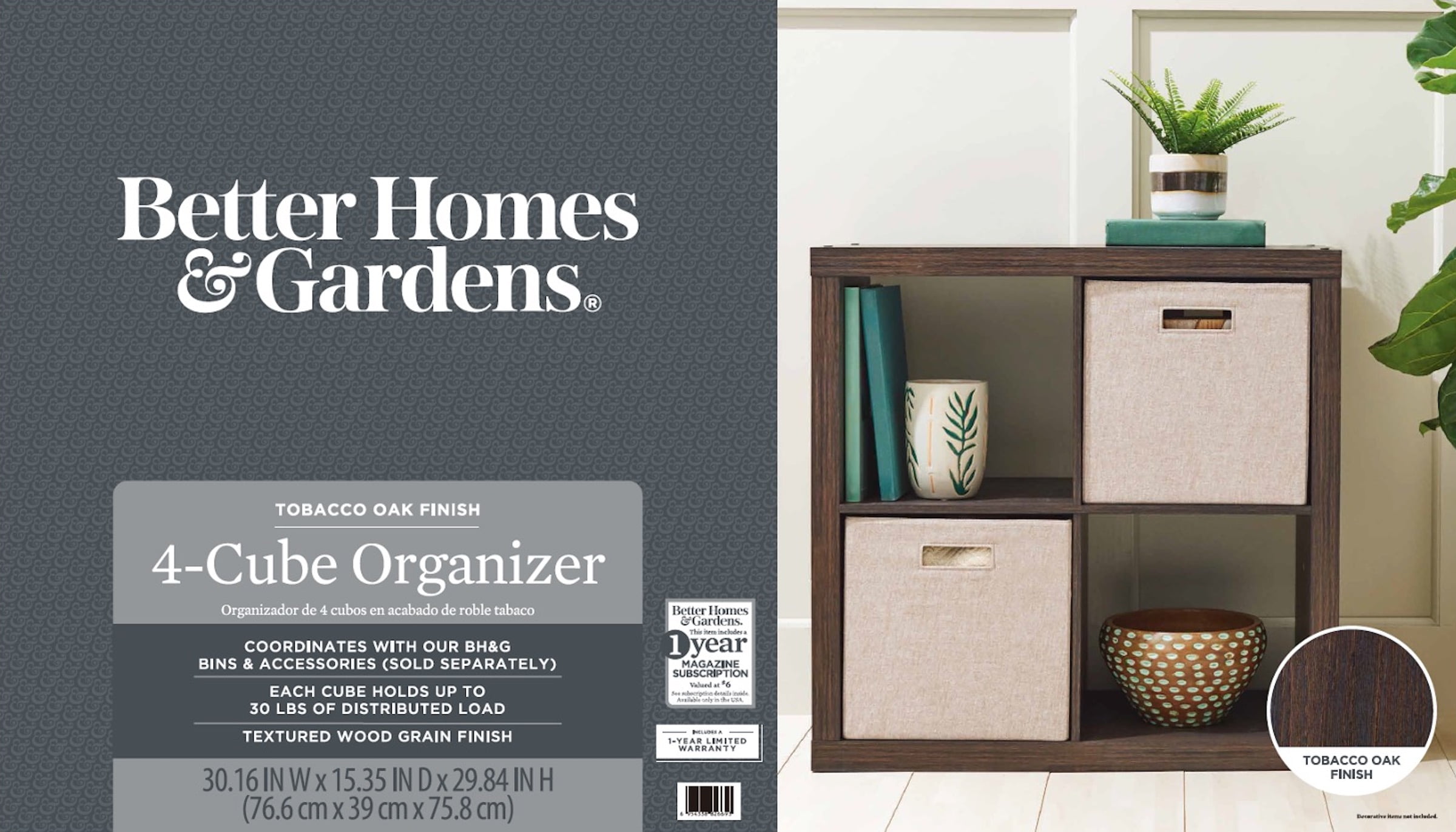 Better Homes & Gardens 4-Cube Storage Organizer, Tobacco Oak Sleek, open-back design for easy cord management Features four 13″ x 15″ x 13″ compartments Compatible with Better Homes & Gardens Cube Storage Bins (sold separately) Top panel can support up to 100 lbs, each cube supports up to 30 lbs Dimensions: 30.16″ W x 15.35″ D x 29.84″ H Weight: 31.13 lbs Materials: MDF, particleboard, paperboard and iron Can be combined with other Better Homes & Gardens Storage Organizers and Shelves (sold separately) Easy to assemble with included instructions and video assembly guide (link below) Tools required: hammer Finishes available: Textured White (BH61100005302WH), Tobacco Oak (BH61100005302TO), Rustic Gray (BHD036118664015), Natural (BH61100005302NA), Vintage Walnut (BHD036118664016), Solid Black (BHD036118664013) and Gray (BHD036118664014) Package dimensions: 17.72″ x 33.31″ x 8.98″ Package weight: 35.09 lbs Assembly Instructions: Better Homes & Gardens 4-Cube Organizer Assembly Video: Better Homes & Gardens 4-Cube Organizer For customer support or assembly assistance, visit huisenfurniture.zendesk.com or call 1-800-729-1569.