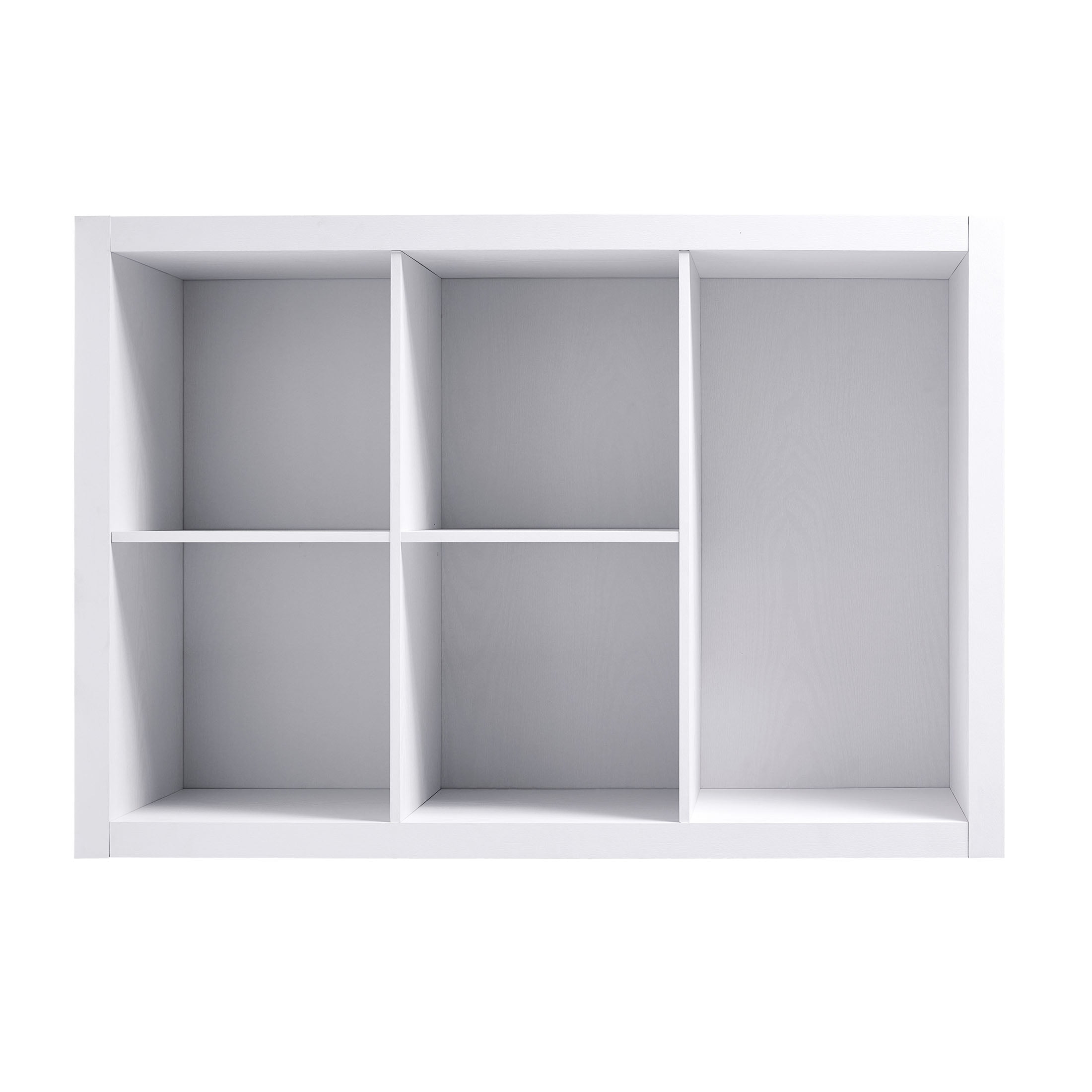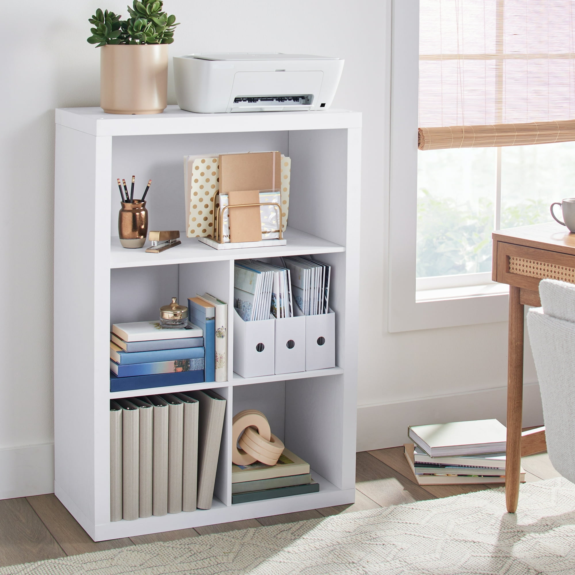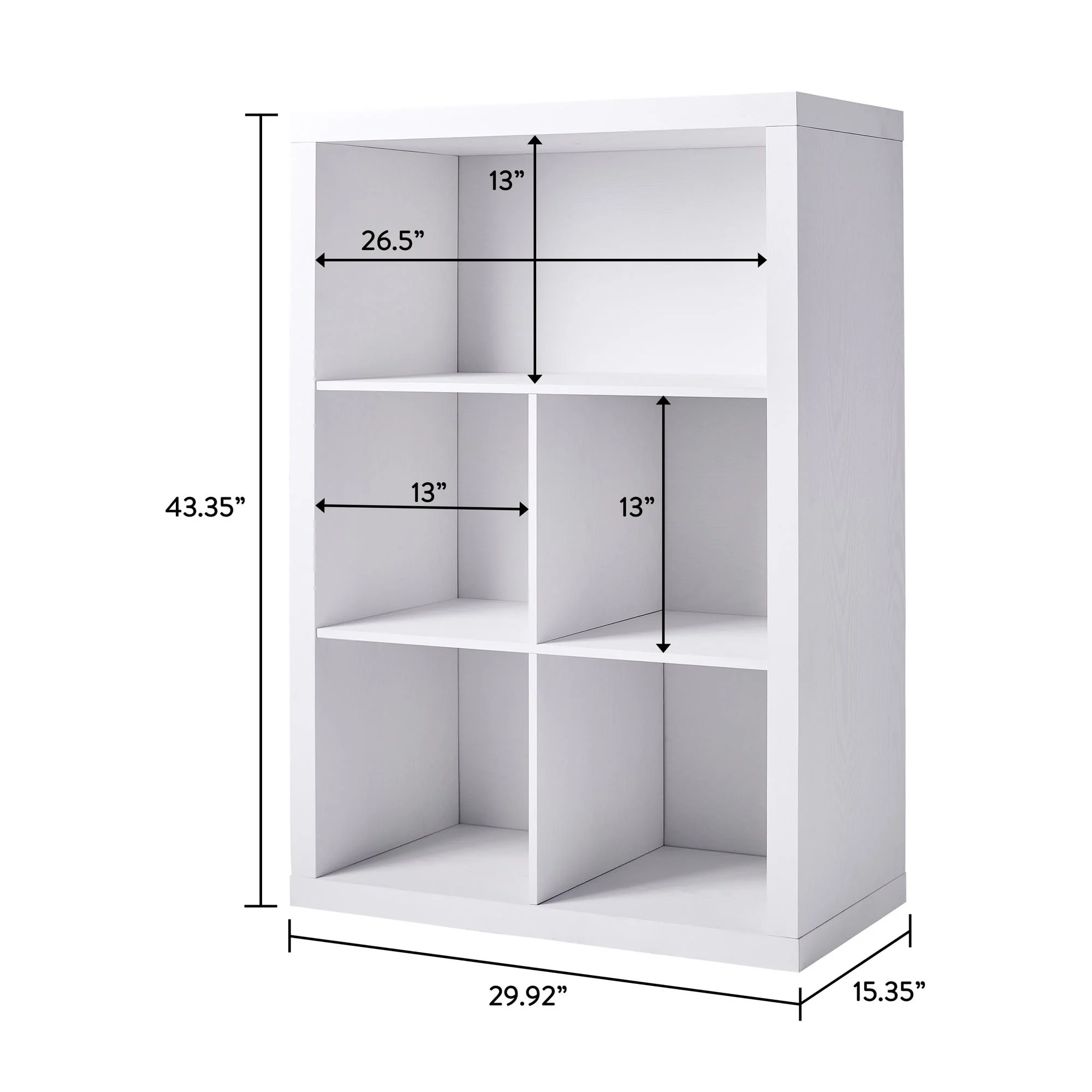 Features one wide shelf and four 13″ x 15″ x 13″ compartments Closed back Compatible with Better Homes & Gardens Cube Storage Bins (sold separately) Versatile design allows for vertical or horizontal placement Top panel and bottom shelf can support up to 66 lbs each; middle shelves can support up 22 lbs each Can be combined with other Better Homes & Gardens Cube Organizers and Shelf Inserts (sold separately) Materials: MDF, particle board Attaches to the wall with included safety strap Easy to assemble with included instructions (hammer & Phillips head screwdriver required) Finishes available: White Texture (BH5336278612099), Tobacco Oak (BH5336278612100) and Light Honey (BH5336278612101) Package size: 44.17″ x 9.06″ x 17.83″ (55.66 lbs) Assembled weight: 46.20 lbs Assembled dimensions: 29.92″ W x 15.35″ D x 43.35″ H Assembly Instructions For customer support or assembly assistance, visit or call 1-800-729-1569.