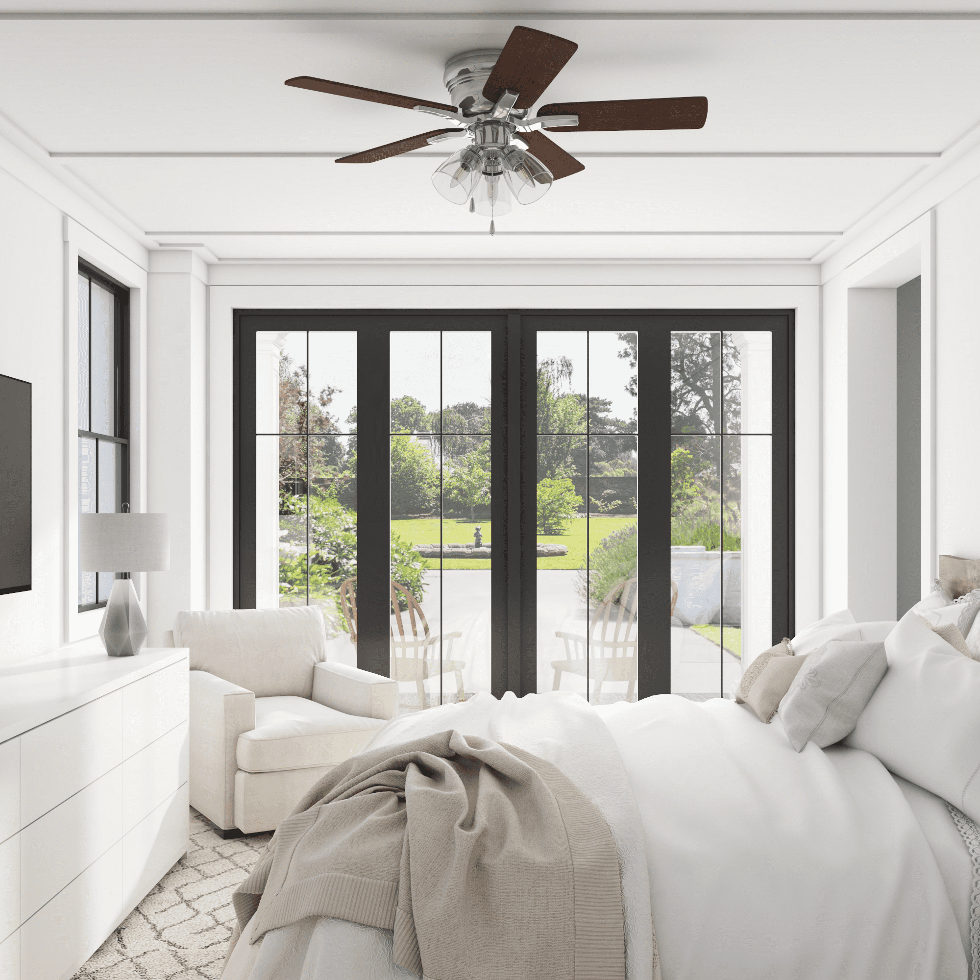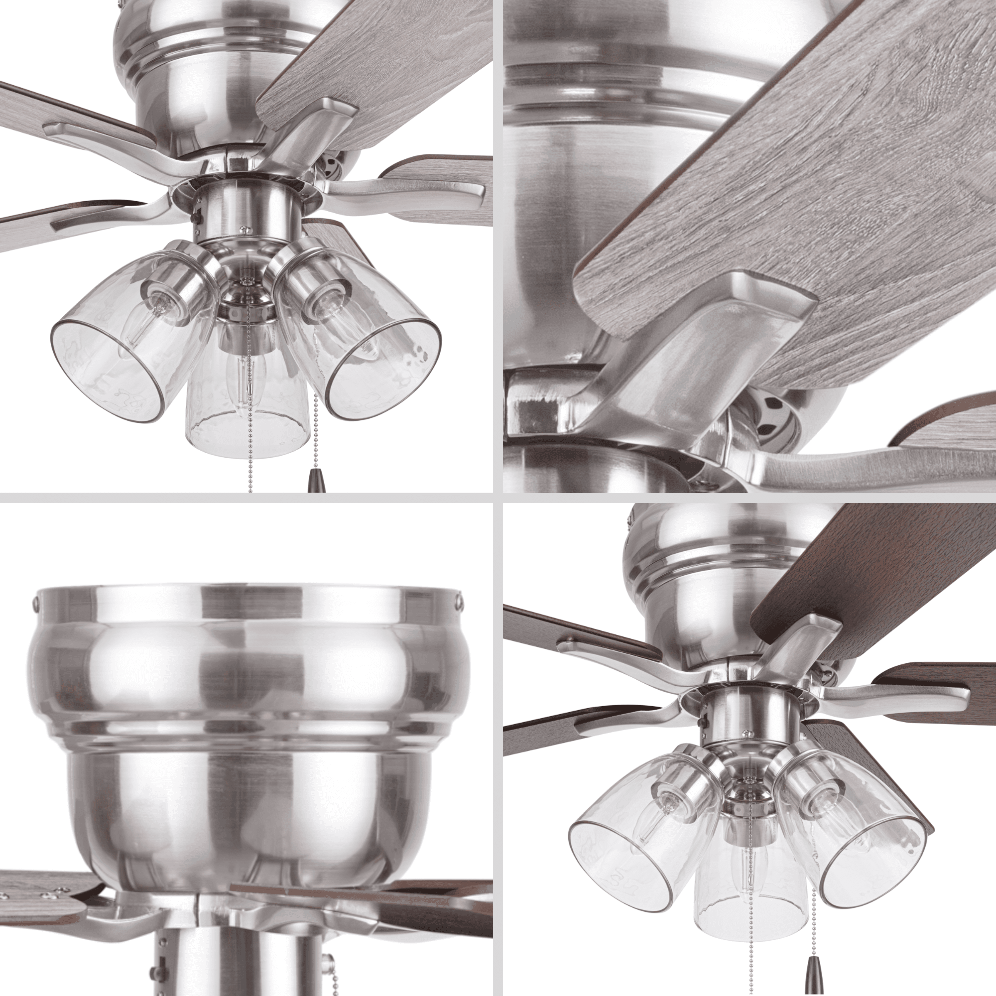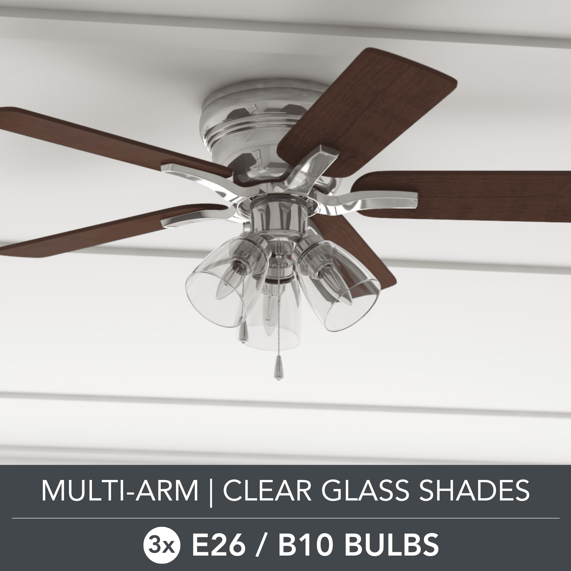 This Better Homes & Gardens ceiling fan features three clear glass shades that house LED bulbs, illuminating your space. Five reversible blades provide comforting, adjustable airflow. This indoor ceiling fan’s traditional design complements an array of spaces and decor styles. Pull chains are included for easy adjustments to the light and speed settings. Use the reversible airflow switch to properly distribute air during warmer and colder months.