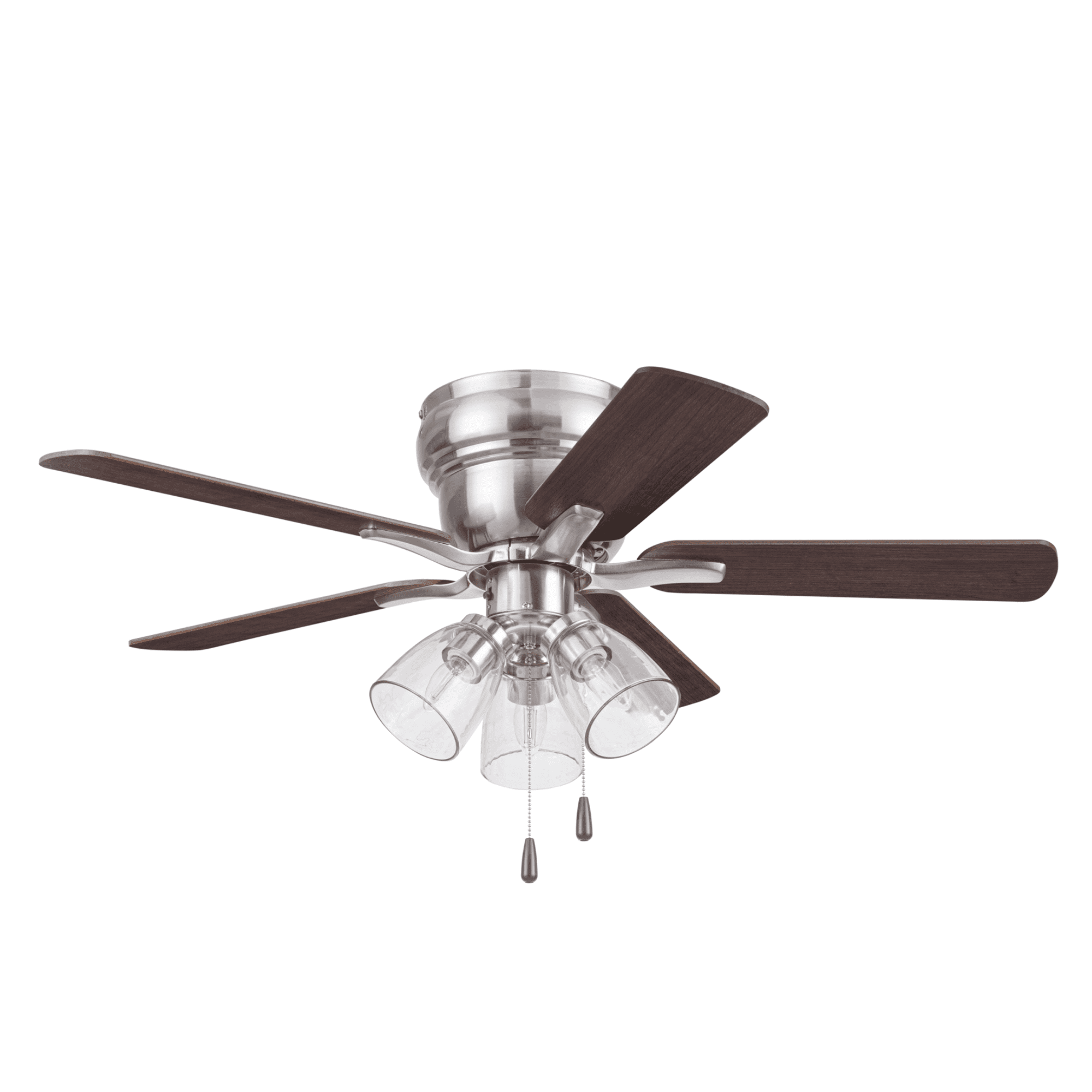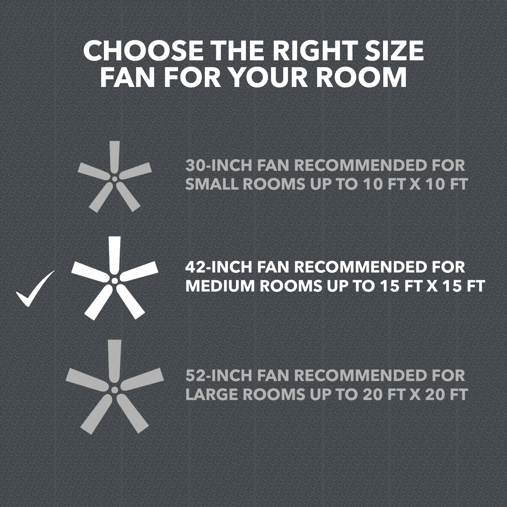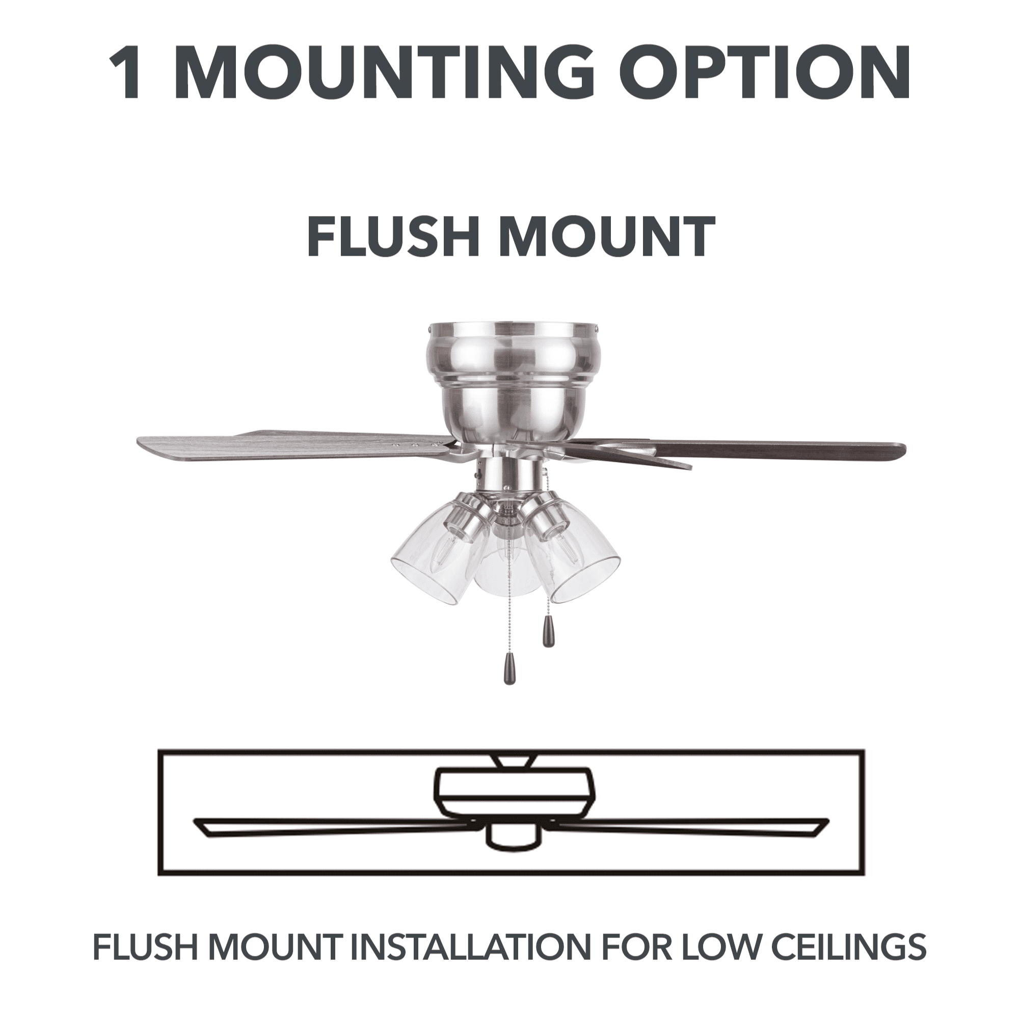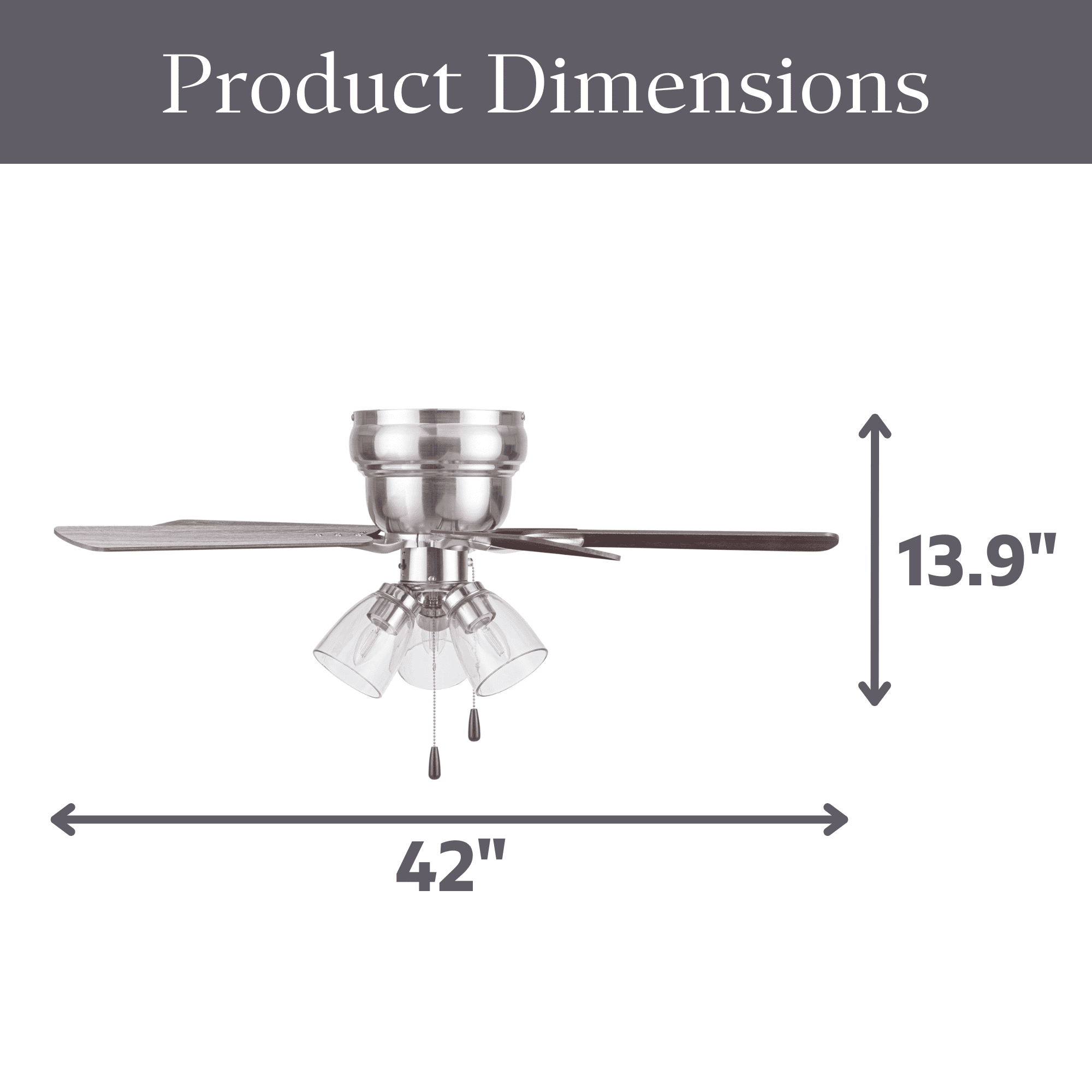 Keep Cool With The Correct Ceiling Fan Size: This 42 inch indoor ceiling fan is ideal for smaller areas up to 200 sq. ft. such as bedrooms and living rooms. Low Profile Mount: To be mounted flush with the ceiling where more walk-through space is needed Indoor Ceiling Fan: Perfect for living rooms, bedrooms, and offices Pull Chain Control: Easy-to-use pull chains are included for quick adjustments to the light output and speed settings Ceiling Fan With Light: Easily control your fan light with the pull chains; includes 3 clear glass shades that house E26, B10 LED bulbs Reversible Blades: Choose between Light Oak and Gray Oak to best complement your space Crafted With High-Quality Material: The high-capacity motor delivers powerful airflow and quiet performance for years to come; This durable and classic ceiling fan is designed for long lasting comfort; ETL listed