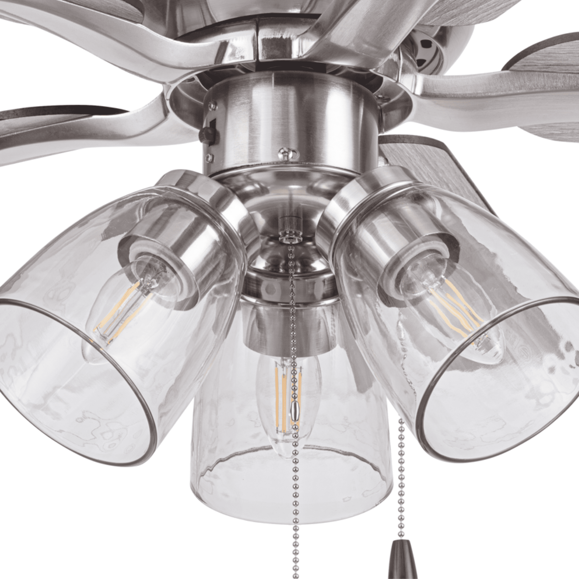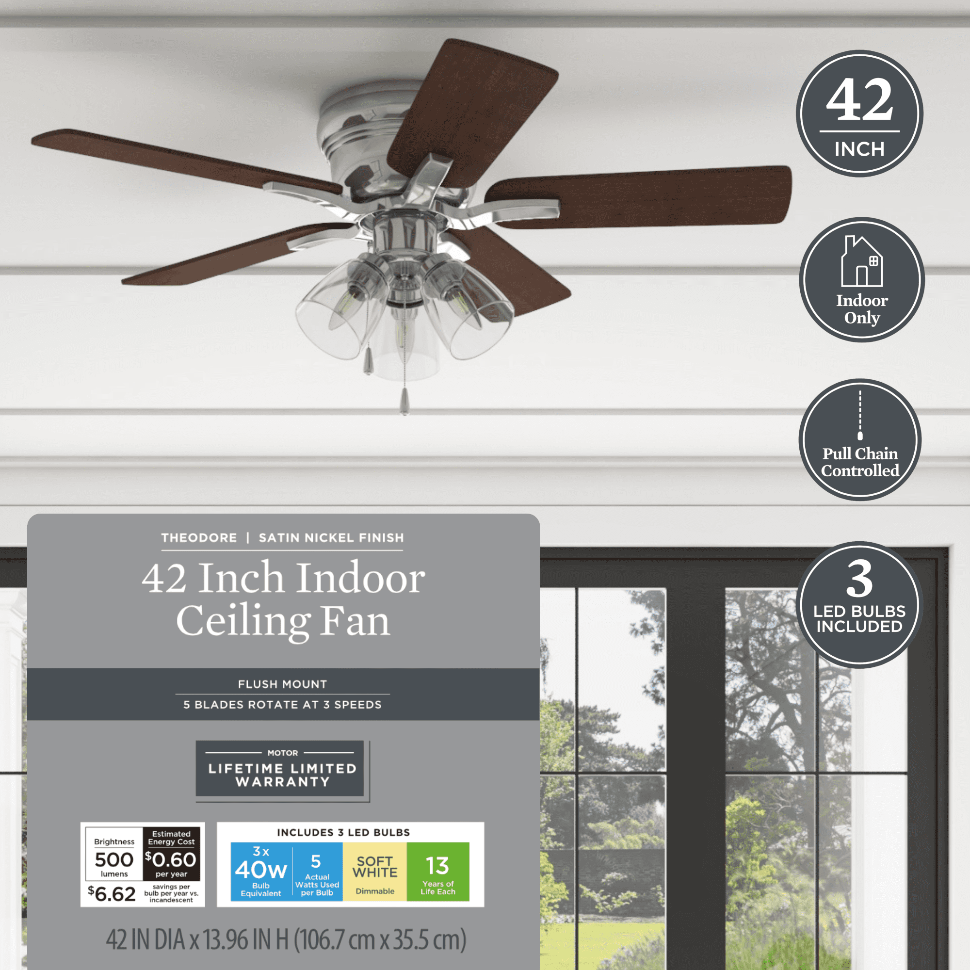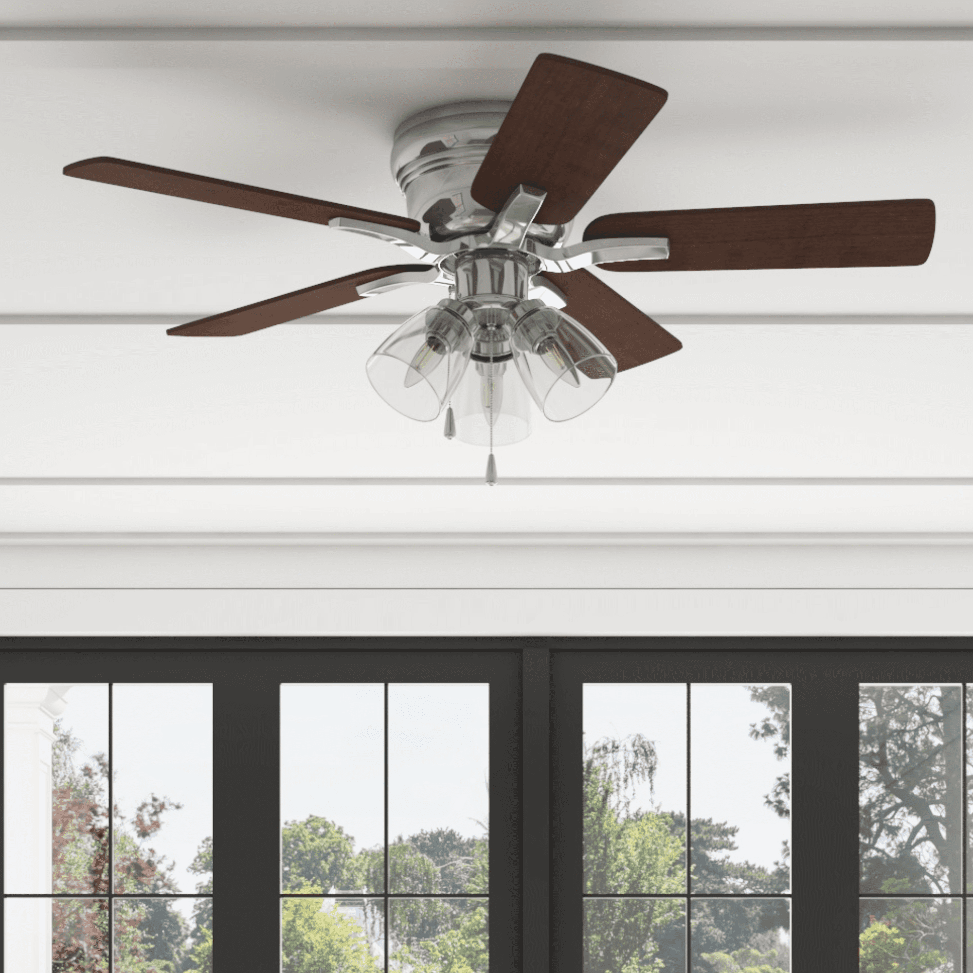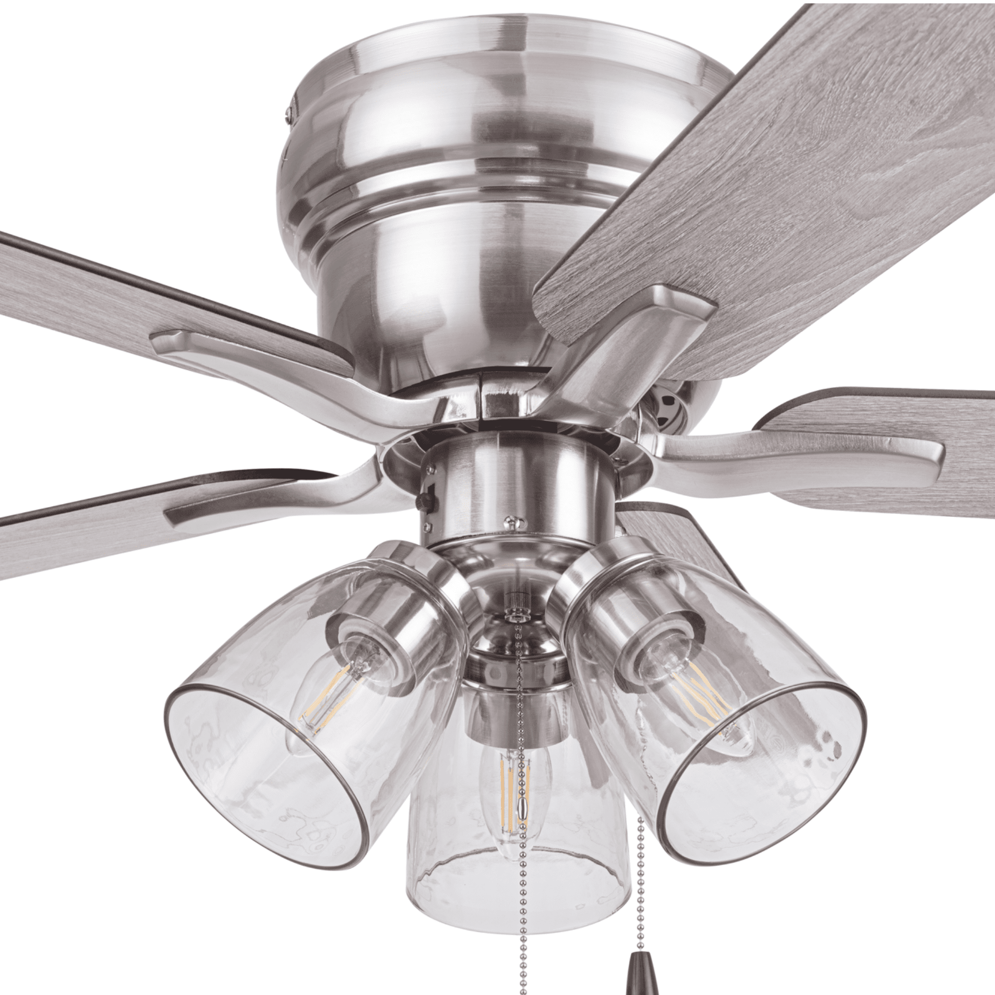 Keep Cool With The Correct Ceiling Fan Size: This 42 inch indoor ceiling fan is ideal for smaller areas up to 200 sq. ft. such as bedrooms and living rooms. Low Profile Mount: To be mounted flush with the ceiling where more walk-through space is needed Indoor Ceiling Fan: Perfect for living rooms, bedrooms, and offices Pull Chain Control: Easy-to-use pull chains are included for quick adjustments to the light output and speed settings Ceiling Fan With Light: Easily control your fan light with the pull chains; includes 3 clear glass shades that house E26, B10 LED bulbs Reversible Blades: Choose between Light Oak and Gray Oak to best complement your space Crafted With High-Quality Material: The high-capacity motor delivers powerful airflow and quiet performance for years to come; This durable and classic ceiling fan is designed for long lasting comfort; ETL listed