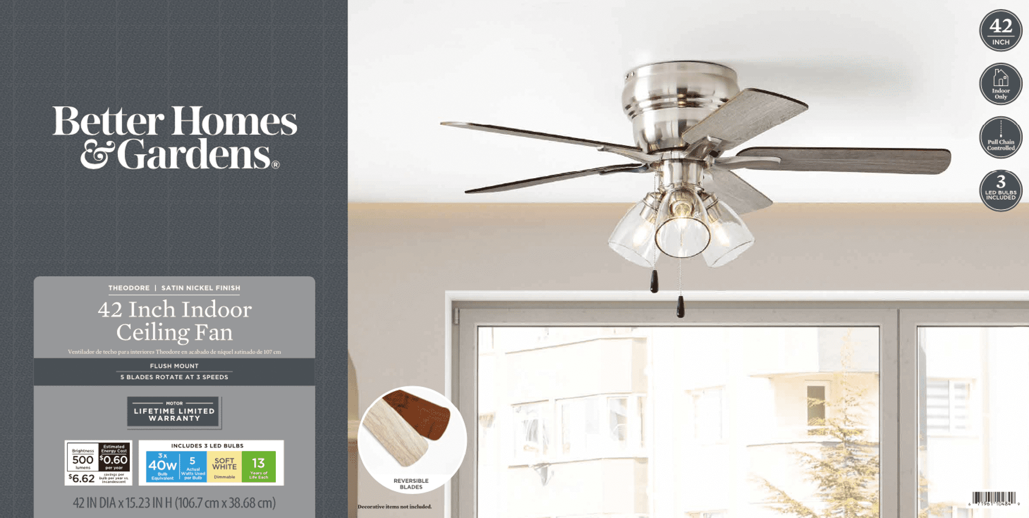 Better Homes & Gardens 42″ Traditional Nickel Indoor Ceiling Fan with Lights, Pull Chain Control & Reverse Airflow