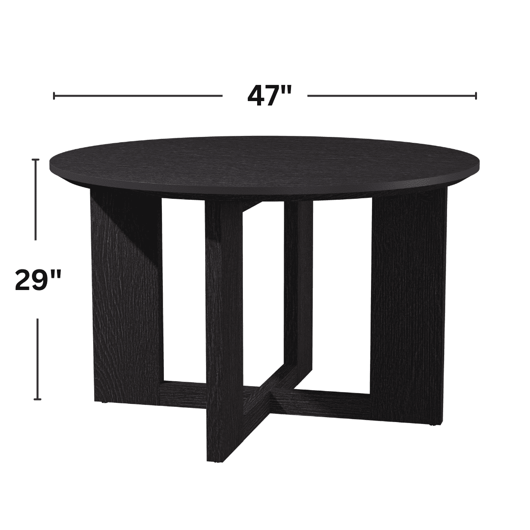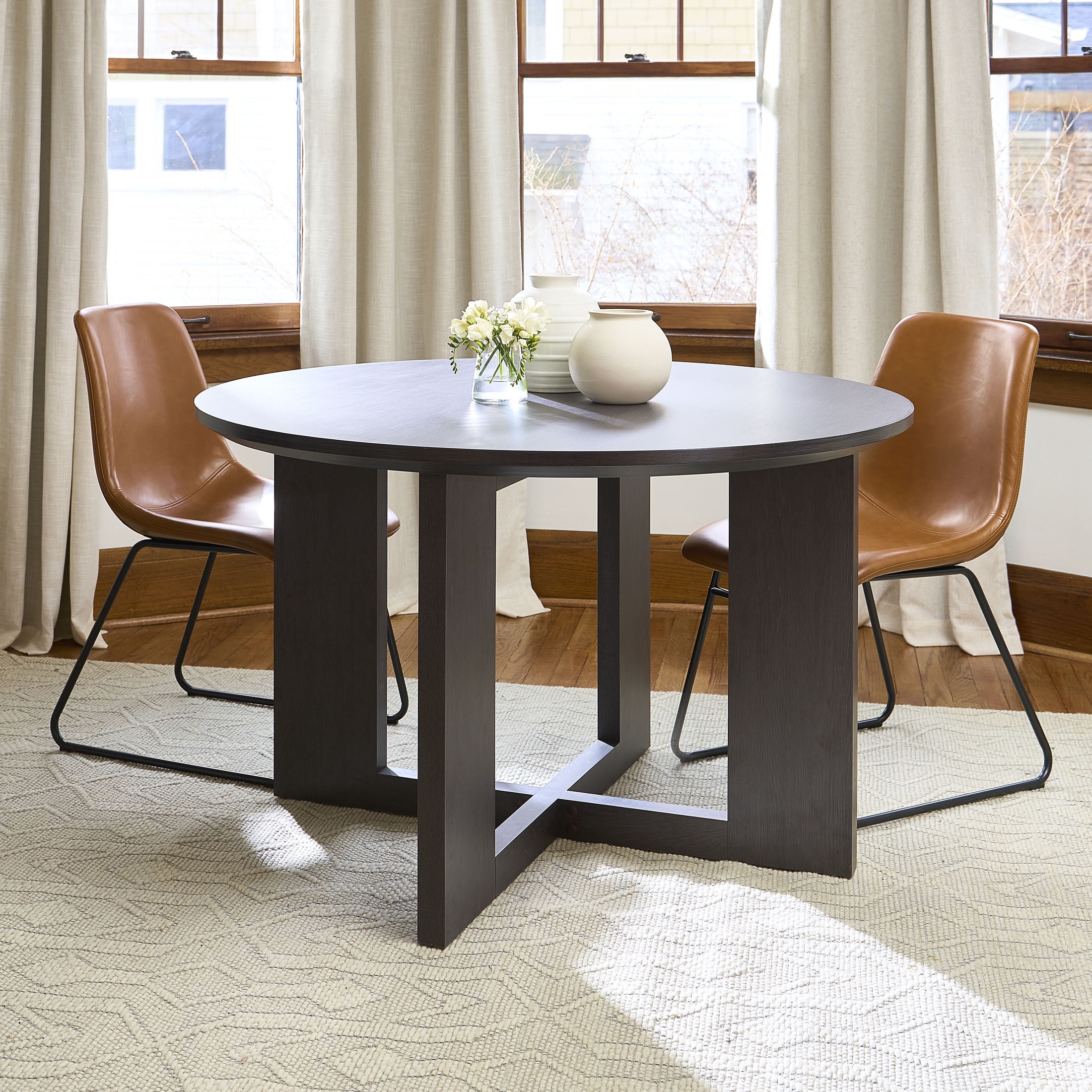 Bring warmth and style to your dining area with the Round Dining Table from Better Homes & Gardens. It has a rich Tobacco Oak finish for a cozy look. This sturdy table stands on crossed legs for solid support and has a special shape for easy sitting. Its smooth edges add a touch of grace. Made with a tough, waterproof, and scratch-proof melamine finish, it’s built to last and simple to keep clean.