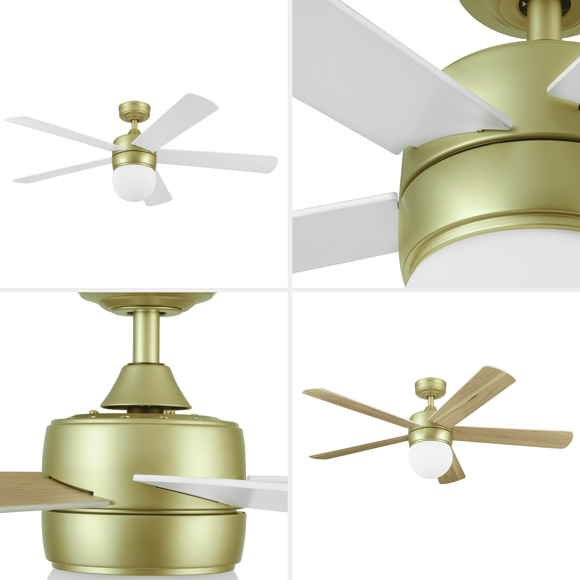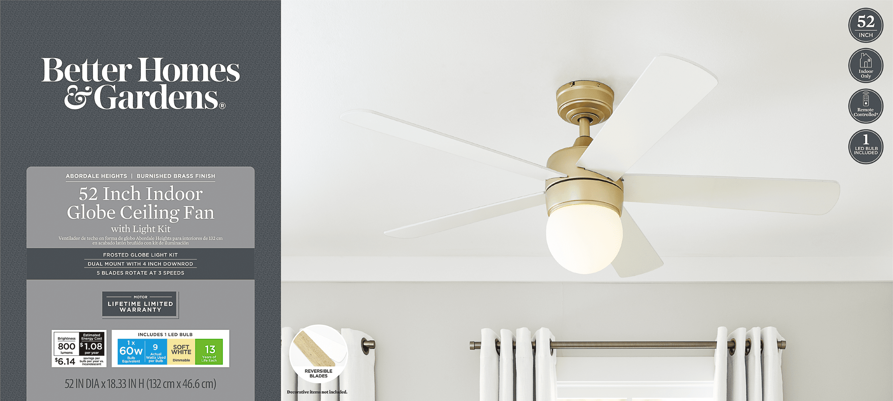 Better Homes & Gardens 52″ Gold Modern Indoor Ceiling Fan with Light, 5 Blades, Remote & Reverse Airflow